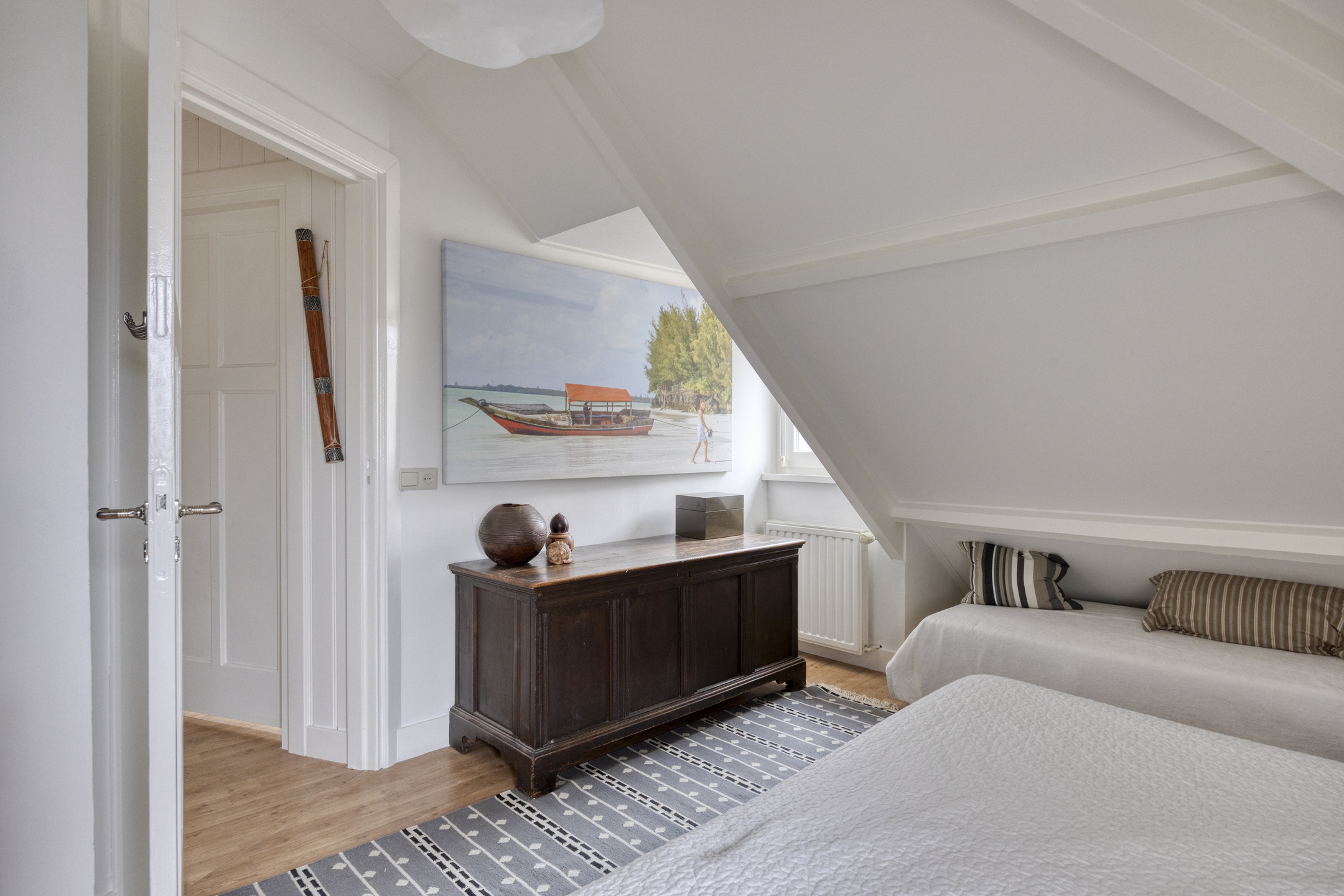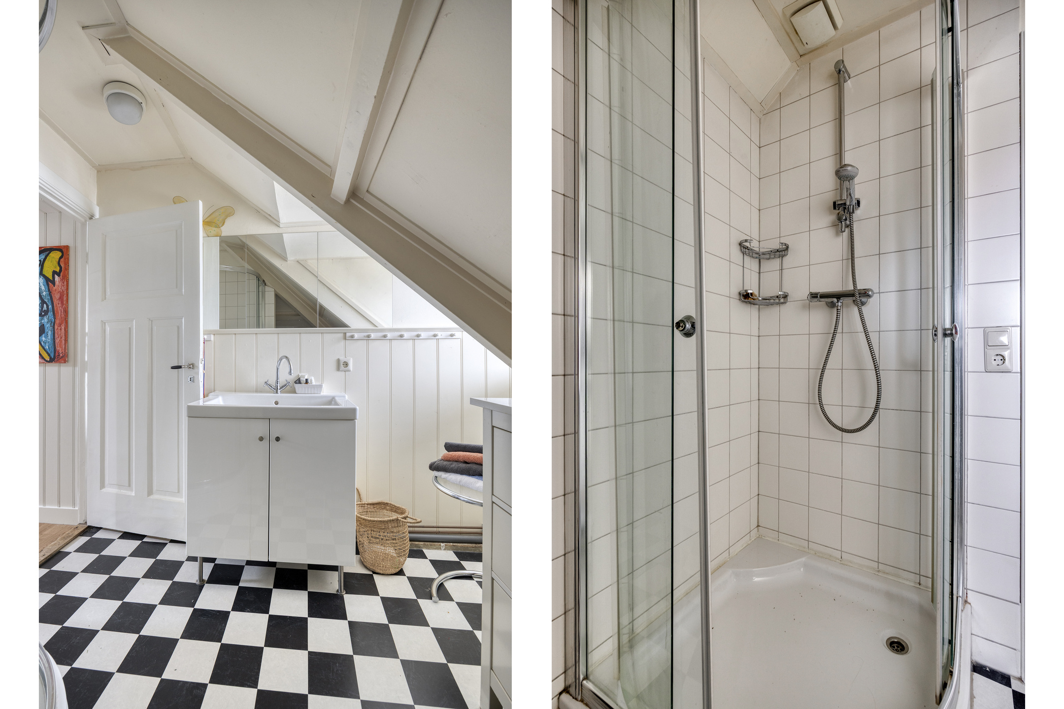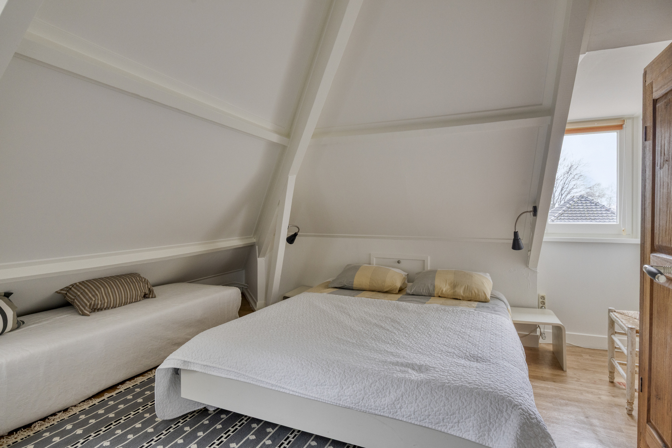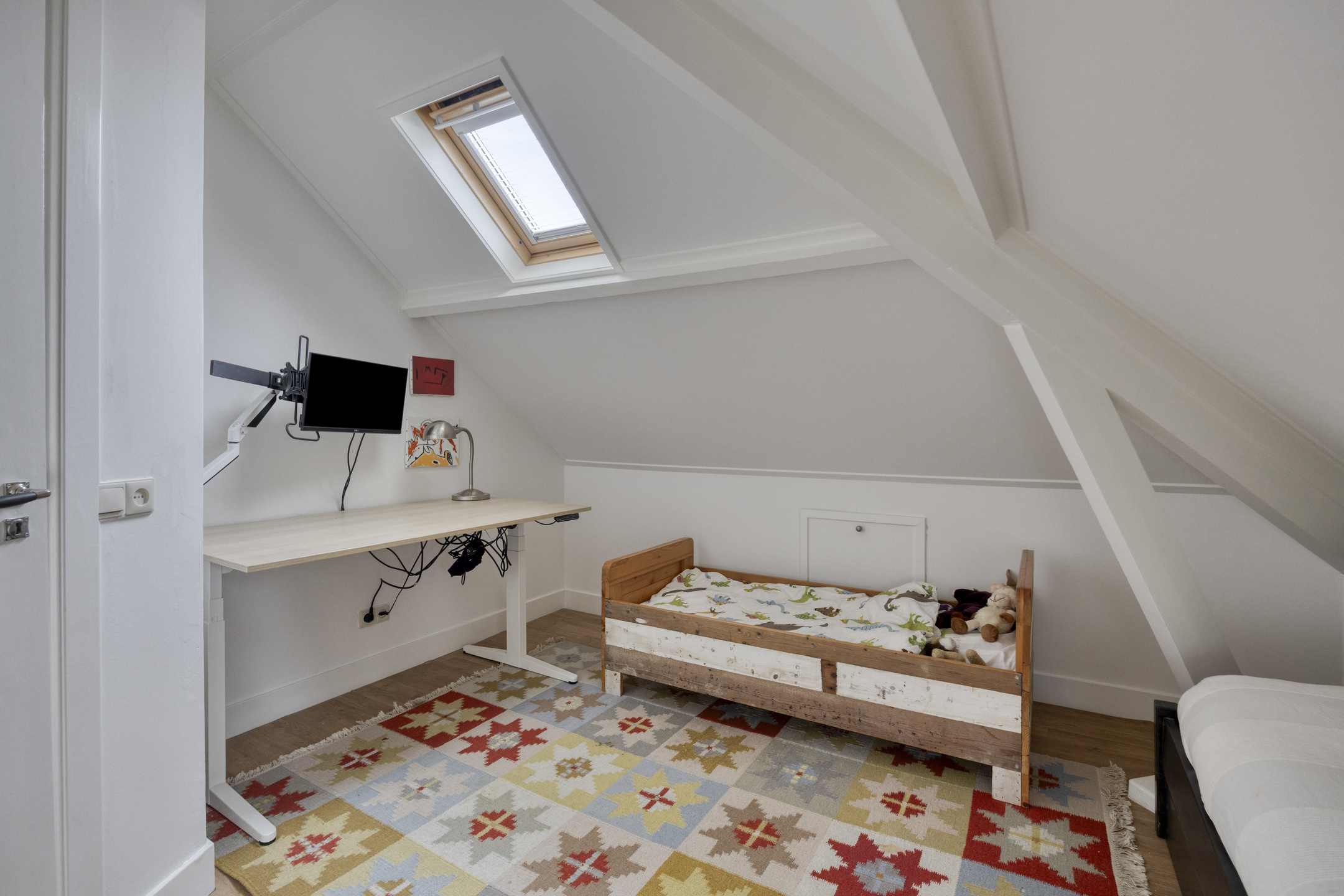 Tweede verdieping: de bordestrap geeft vervolgens toegang tot een mooie sfeervolle tweede verdieping met twee slaapkamers, een badkamer met wastafelmeubel en douche. Daarnaast is er dankzij de knieschotten op de slaapkamers en de overloop voldoende opbergruimte.