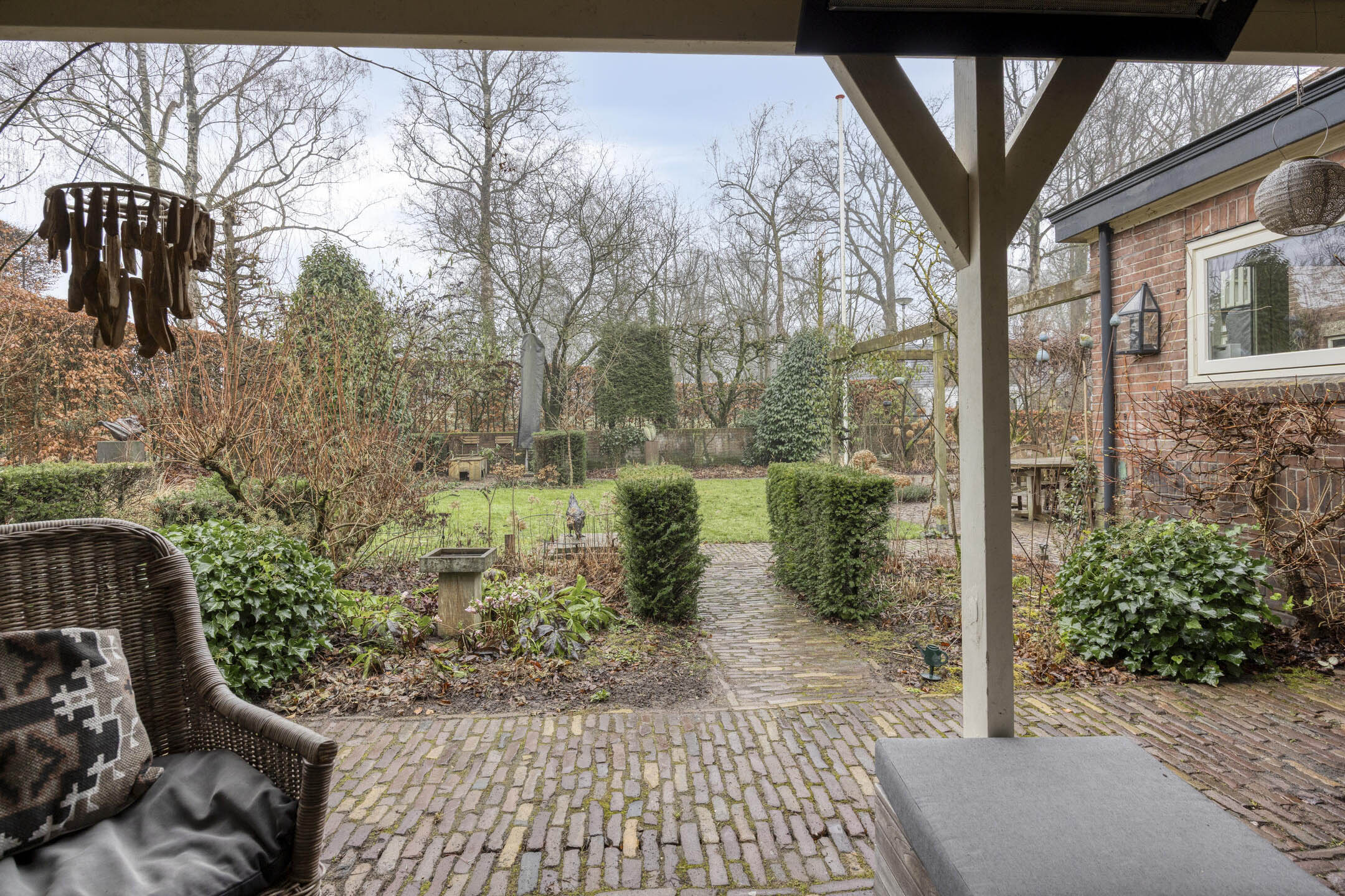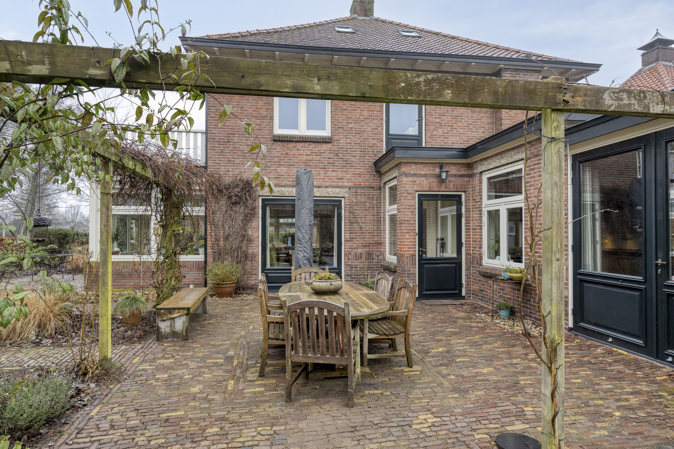 Vanuit de hal bereik je de ruime, sfeervolle keuken, met openslaande deuren naar de tuin. De keuken is uitgerust met diverse inbouwapparatuur, waaronder een 6-pits gasfornuis met oven, afzuigkap, combi- oven, koelkast, vriezer, vaatwasser en een Quooker. Vanuit de keuken bereik je de ruime kelder (met stahoogte) en een praktische bijkeuken met extra aanrechtblad, spoelbak en aansluitingen voor wasmachine en droger. Vanuit de bijkeuken betreedt u het heerlijk overdekte terras met gezellige houtkachel en terrasverwarming. De mooi aangelegde tuin biedt volop groen, privacy en meerdere terrassen om op elk moment van de dag van de zon te genieten.