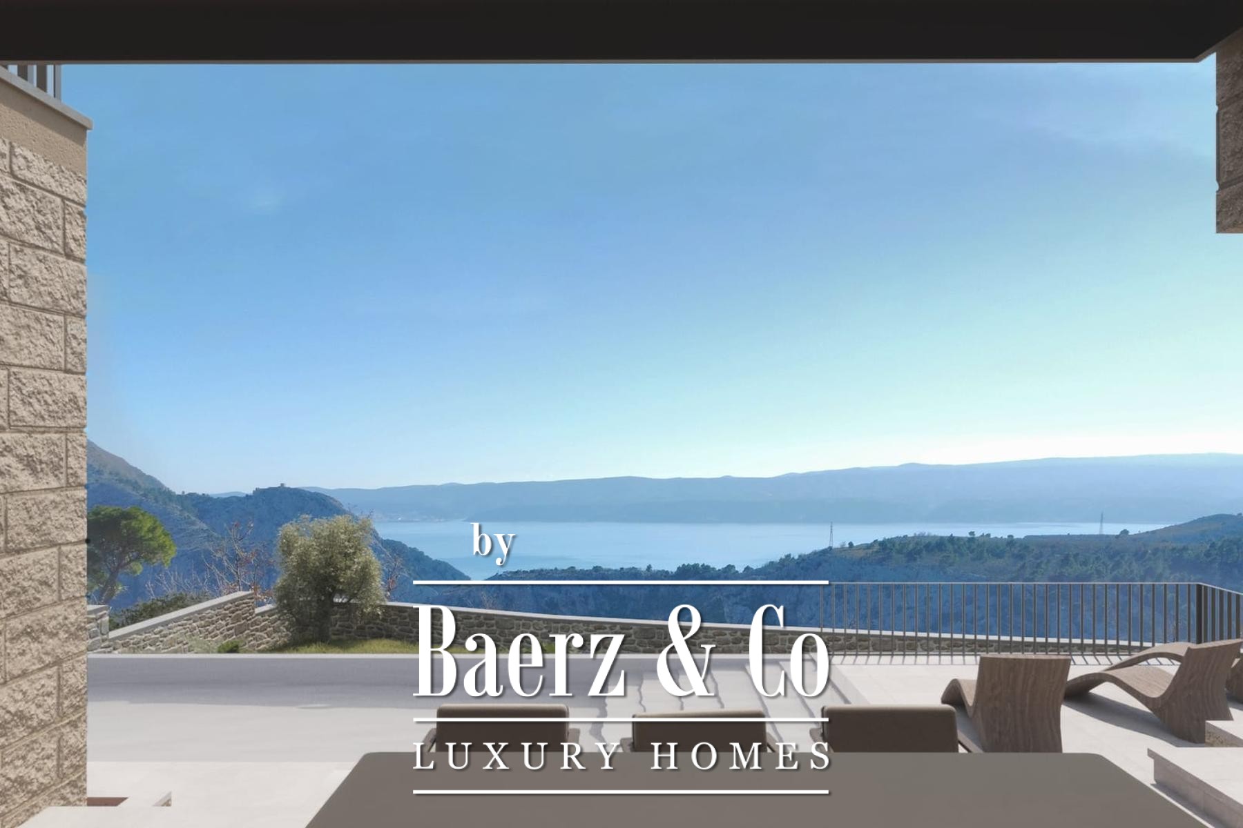 The exterior blends contemporary lines with materials native to the setting, including Brač stone and expansive glass walls. Outdoors, a sundeck, a terrace with dining and barbecue areas, a 32 m² swimming pool, and four parking spaces enhance the sense of escape and possibility.