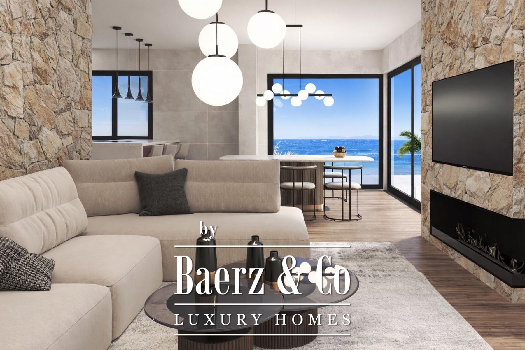 The upper floor is configured as a private residential unit, presenting the comfort and seclusion of a standalone home. Expansive glass walls infuse the interiors with natural light and offer sweeping views of Kvarner Bay, while the open plan layout seamlessly links the kitchen, dining, and living spaces. Sliding doors extend the living room onto a partially covered 60 m² terrace, where panoramic vistas of the sea and lush surroundings create a calm retreat.