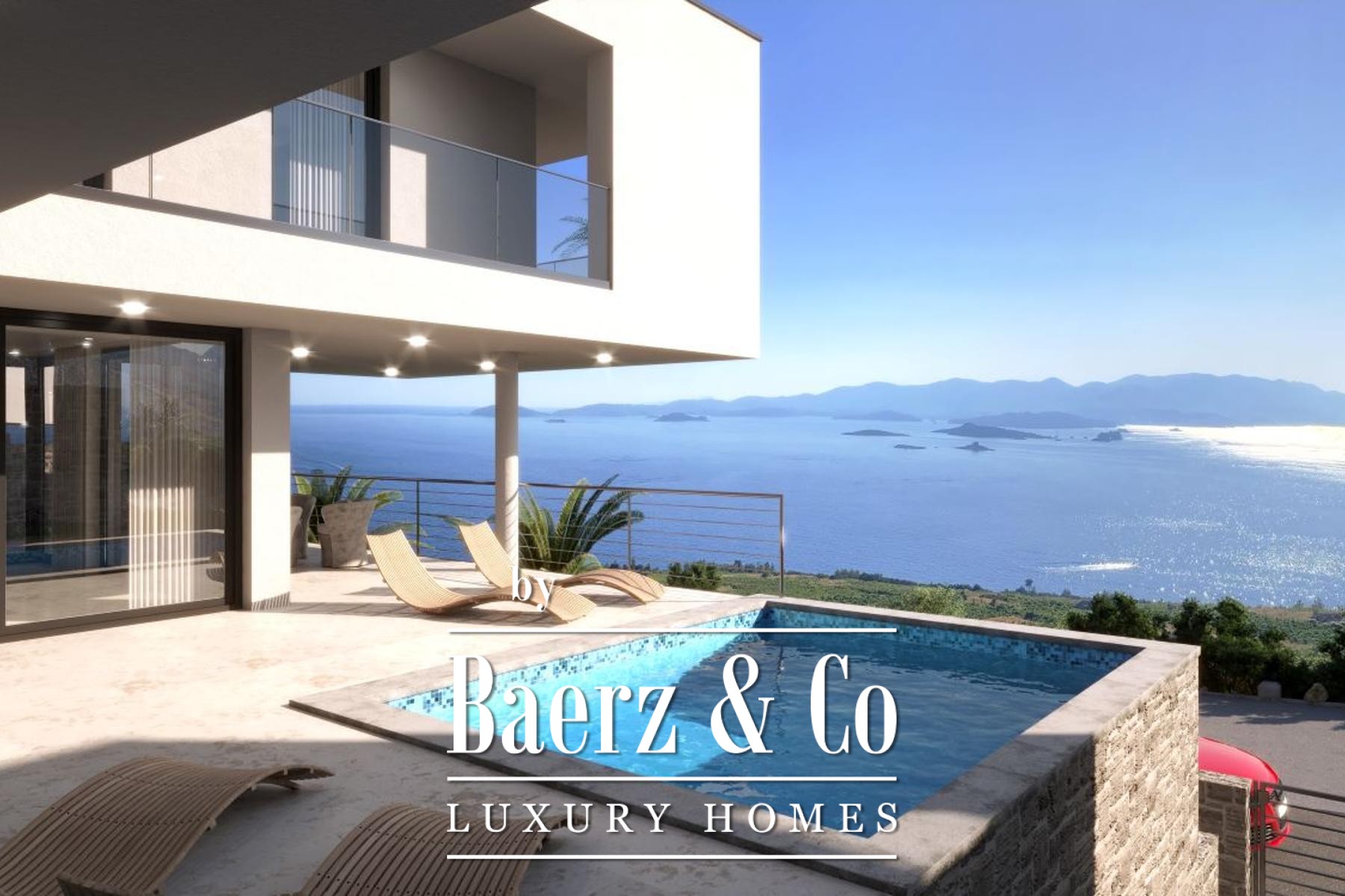 Orebić, project of a modern luxurious villas, located on the beautiful southern slopes of the Pelješac peninsula in the oldest protected wine area in Croatia. The villa is located on a plot of 519 m2, and consists of a basement where there is a swimming pool, a terrace with a total of 27 m2 of living space. The ground floor consists of a covered terrace, covered passage, entrance loggia, room, corridor, dining