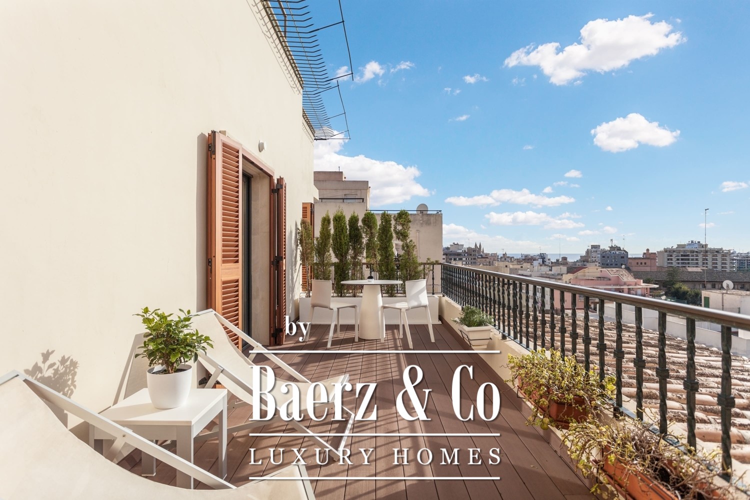 Welcome to this magnificent duplex penthouse in the heart of Palma de Mallorca. Located on the 9th floor with elevator, this completely refurbished property shows a modern and avant-garde design, offering luxury and comfort in the vibrant neighborhood of Bons Aire, within walking distance to the old town, Avenidas and the serene Riera Park. The apartment is distributed over 2 spacious floors, with 5 bedrooms and 3 bathrooms. On the second floor, you will be greeted by a spacious and cozy living room, with a terrace offering stunning views and abundant natural light. A fully equipped Bulthaup kitchen with central island, a sophisticated dining room, two bedrooms, a bathroom and a practical laundry room complete the layout of this level. Head upstairs, where you will find the master suite with private