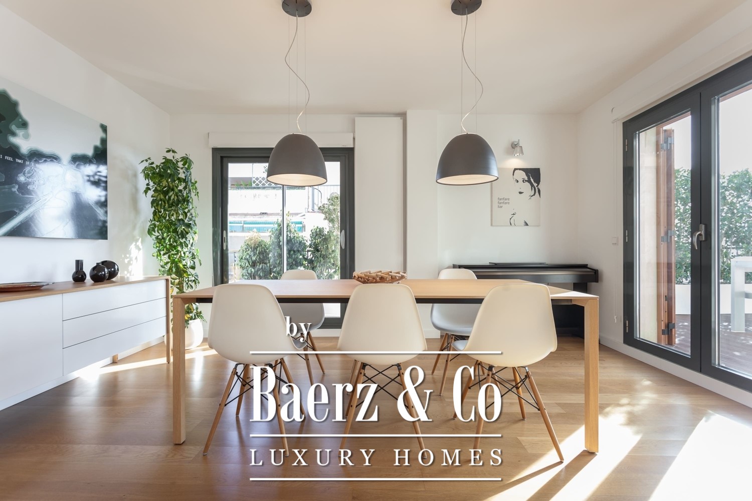 bathroom, complemented by two additional bedrooms, another elegant bathroom and a spacious rooftop terrace perfect for relaxing. The property includes a parking space included, with the option of double parking, located in the basement of the building. This exquisite penthouse is embellished with high-end finishes such as Sonos audio system, Porcelanosa floors, Runtal designer radiators, ducted air conditioning and a gas fireplace in the living room. The bathrooms are equipped with top quality Agape and Dornbracht faucets and sanitary ware. A small machine room on the rooftop houses a water softening system, a pressure pump, a water filter and a solar panel for domestic hot water (DHW). It is worth noting that the apartment was awarded in 2015 as one of the 15 best refurbishment projects in Spain.