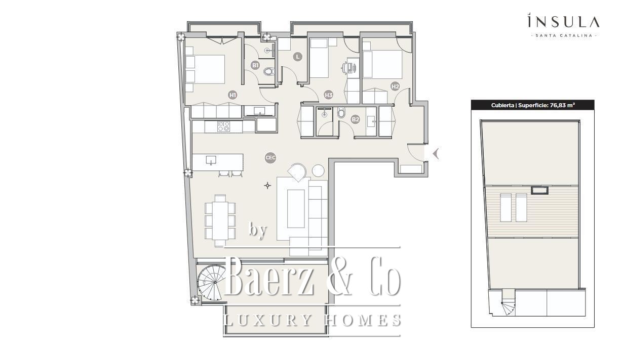Penthouse Palma invites a balance of light and contemporary design in Santa Catalina. This newly built residence, scheduled for completion in 2025, occupies a quiet corner of one of the city’s most desirable neighbourhoods. The penthouse encompasses 234 m² and features three bedrooms and two discreetly styled bathrooms, with a bright living space that seamlessly connects to a generous terrace, creating a fluid rhythm between indoors and out. An external staircase leads from the main level to a private rooftop of approximately 80 m², offering panoramic views and a privileged perspective on Mallorca’s sunlit horizon.