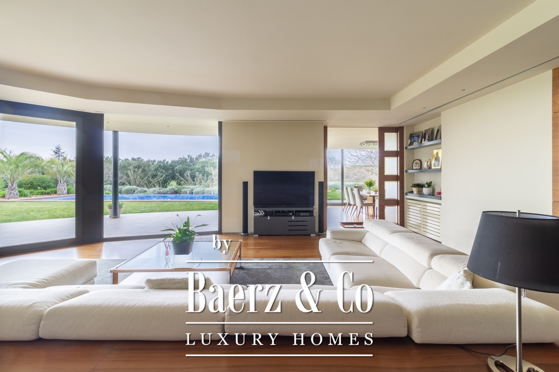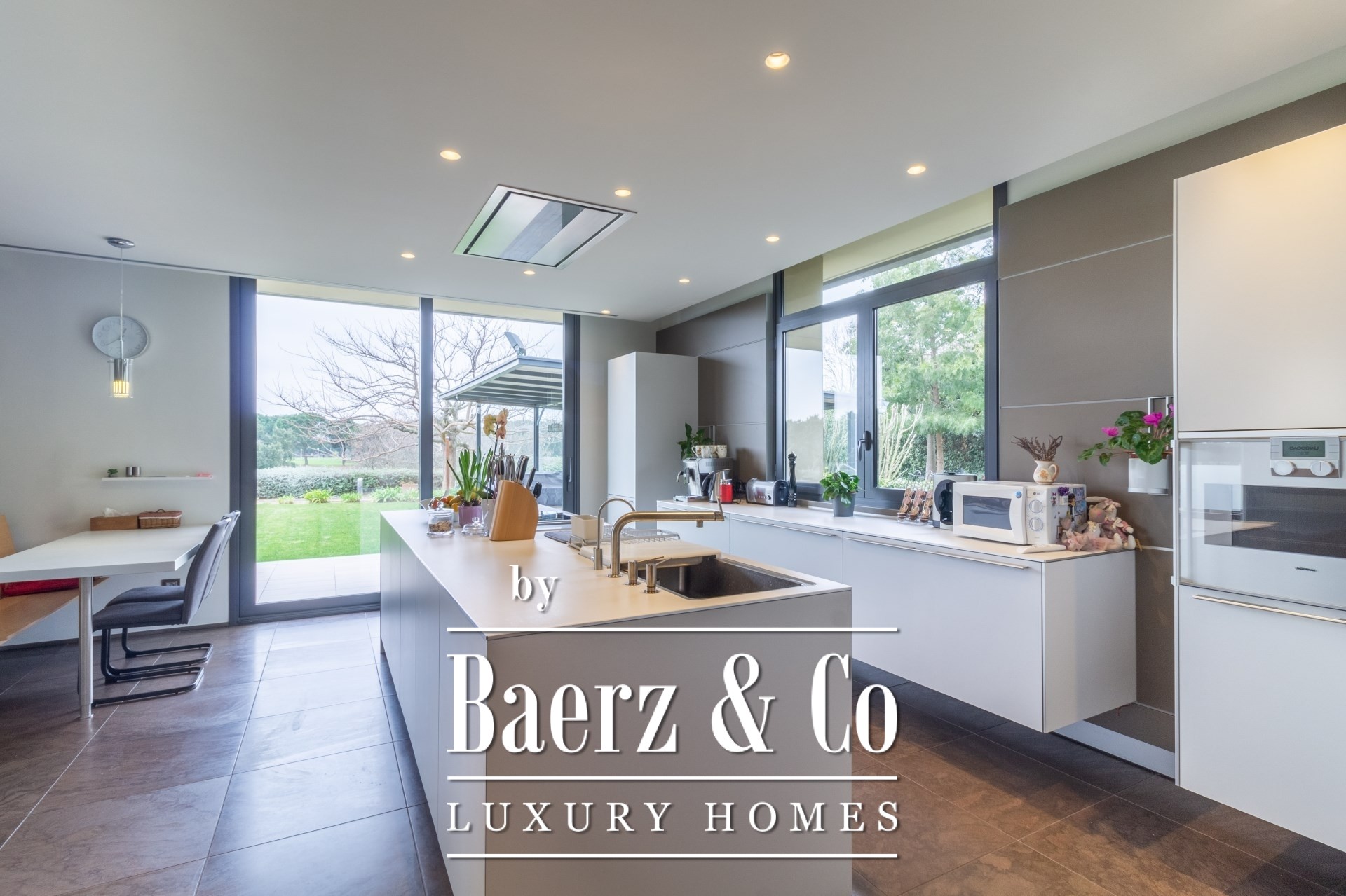 Outdoors, mature gardens surround the pool with its waterfall feature, a barbecue and outdoor kitchen, and expansive chill-out spaces. Underfloor heating, ducted air conditioning, electric windows, integrated audio, complete surveillance, and an elevator underscore the emphasis on comfort and security.