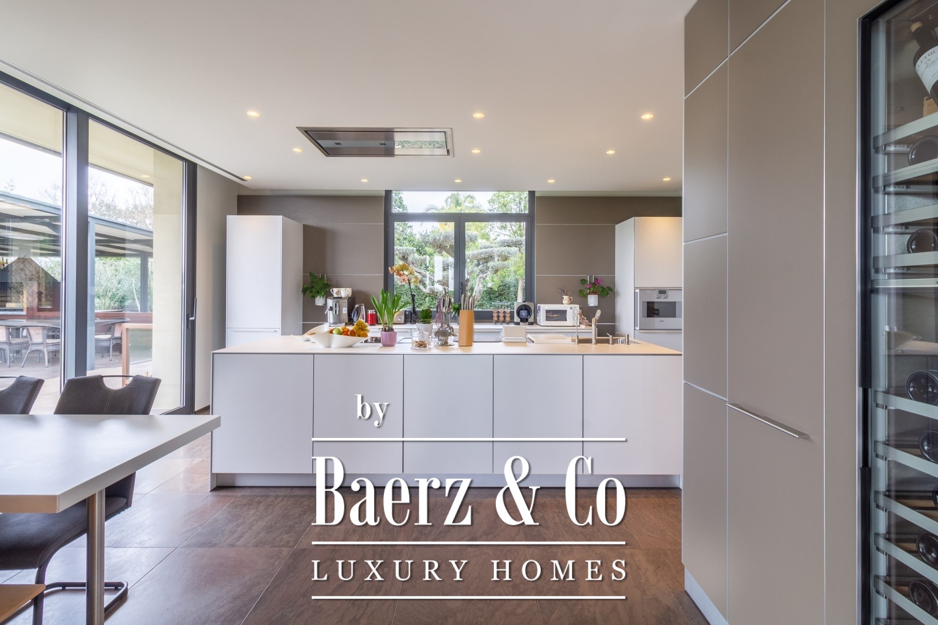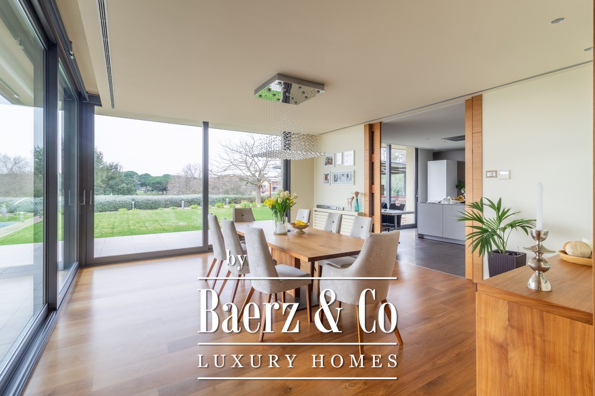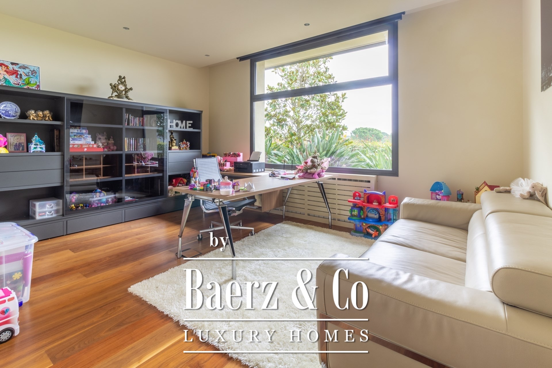 Entering through the spacious hall, the main level opens seamlessly to a vast living and dining room, suffused with natural light and framed by open garden and pool vistas. A reading alcove with fireplace invites quiet reflection. The kitchen is distinct for its high-end appliances and pristine finishes, designed for culinary precision. Two en-suite bedrooms on the ground level offer both privacy and ease, complemented by a guest bathroom and a dedicated office.