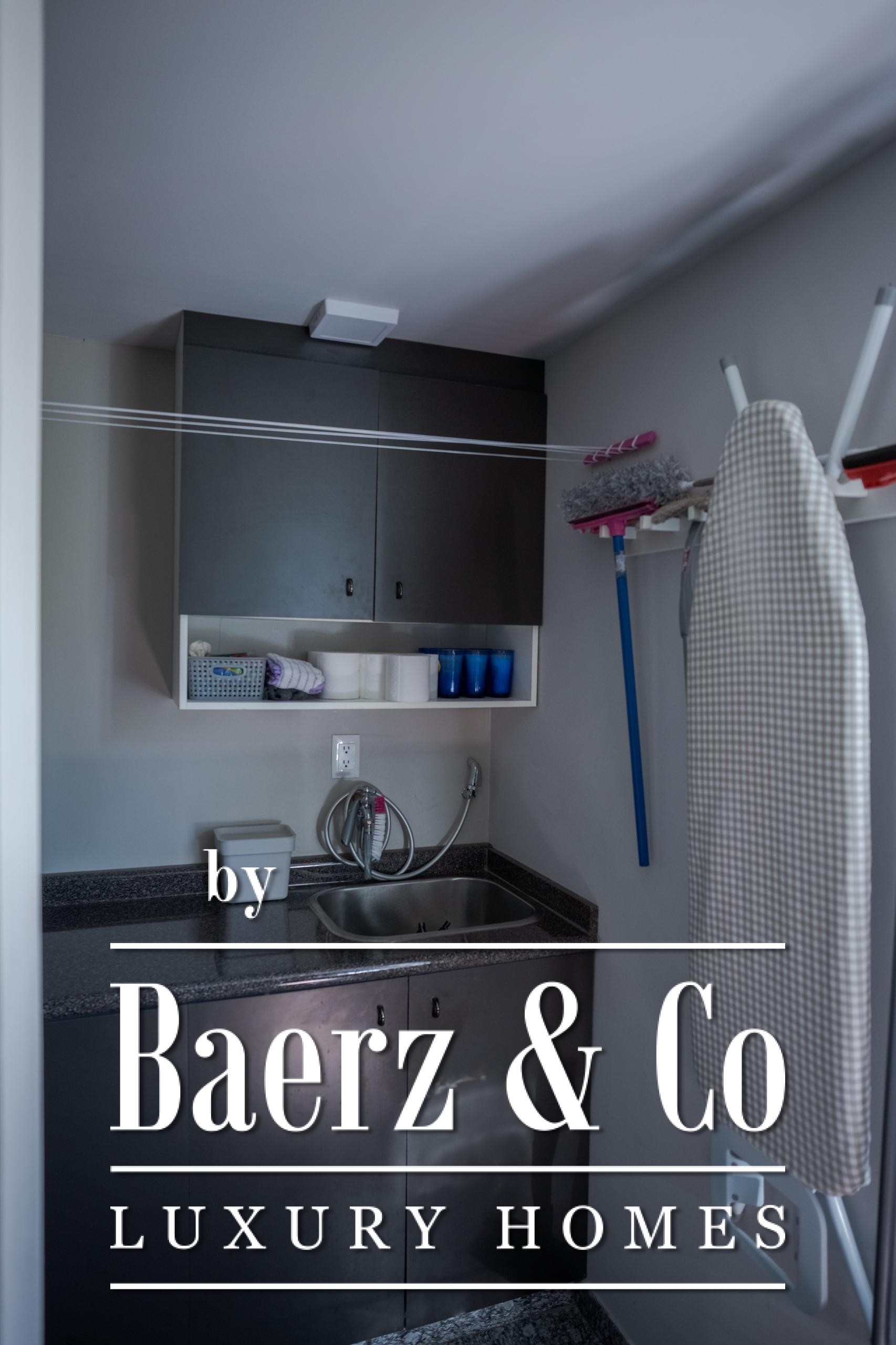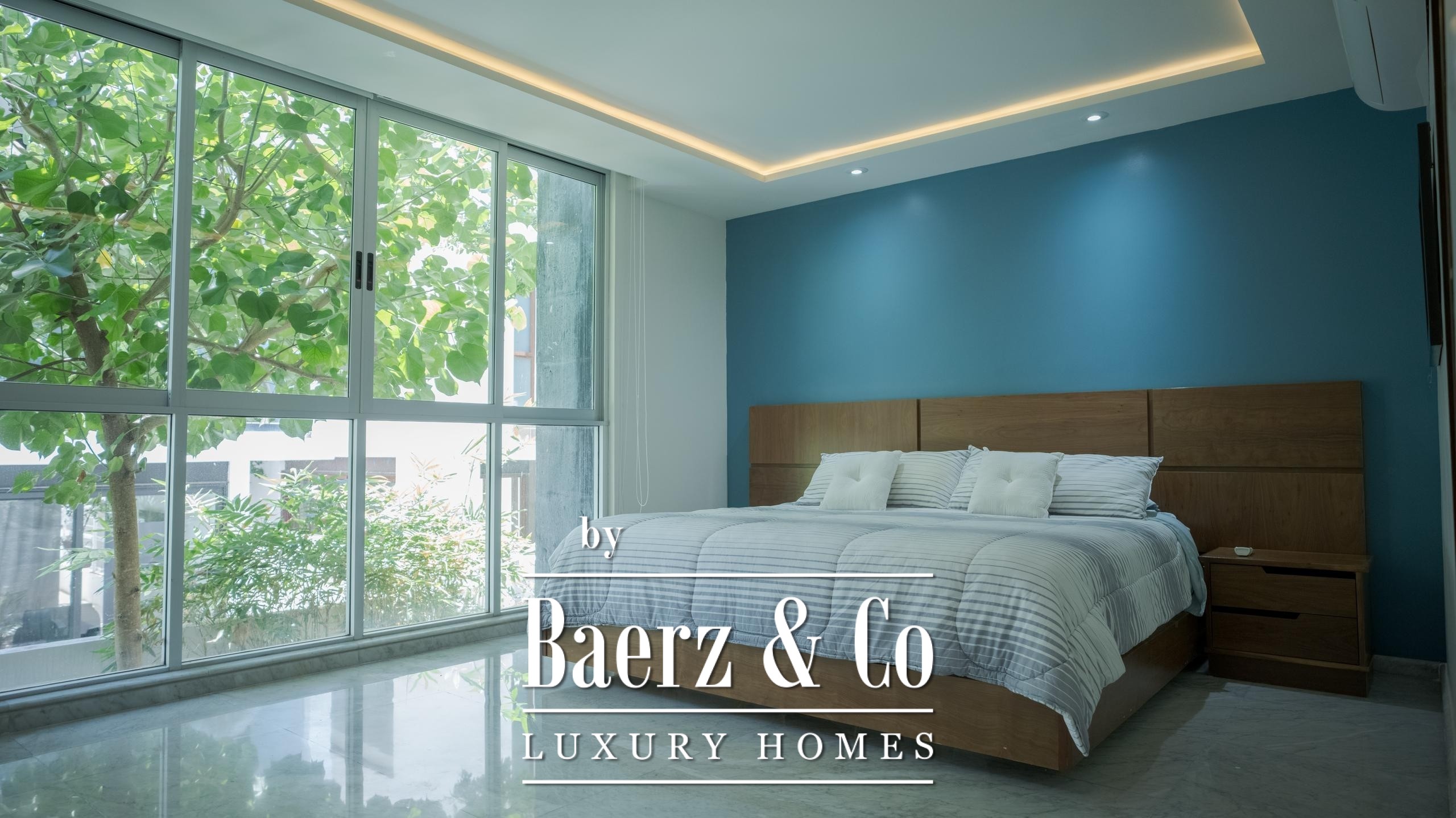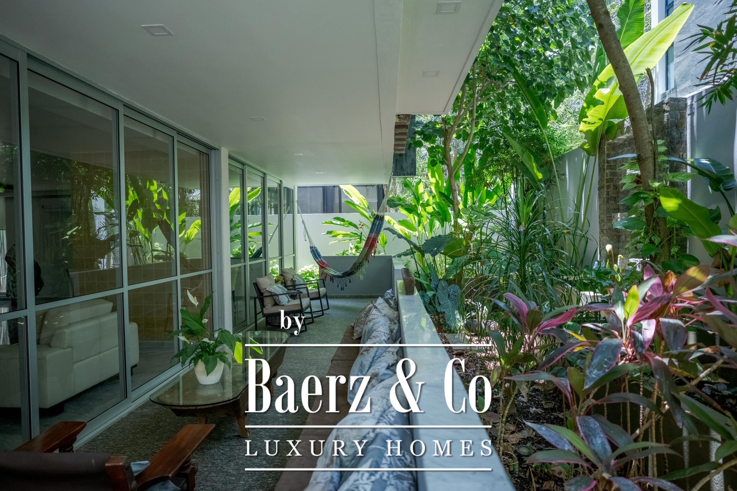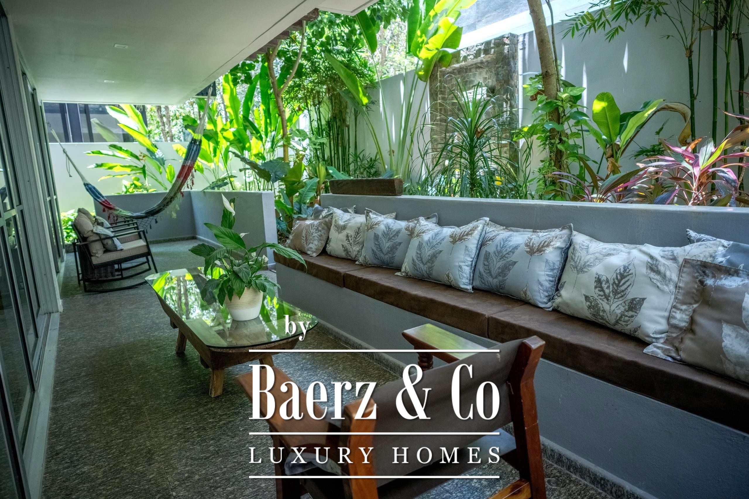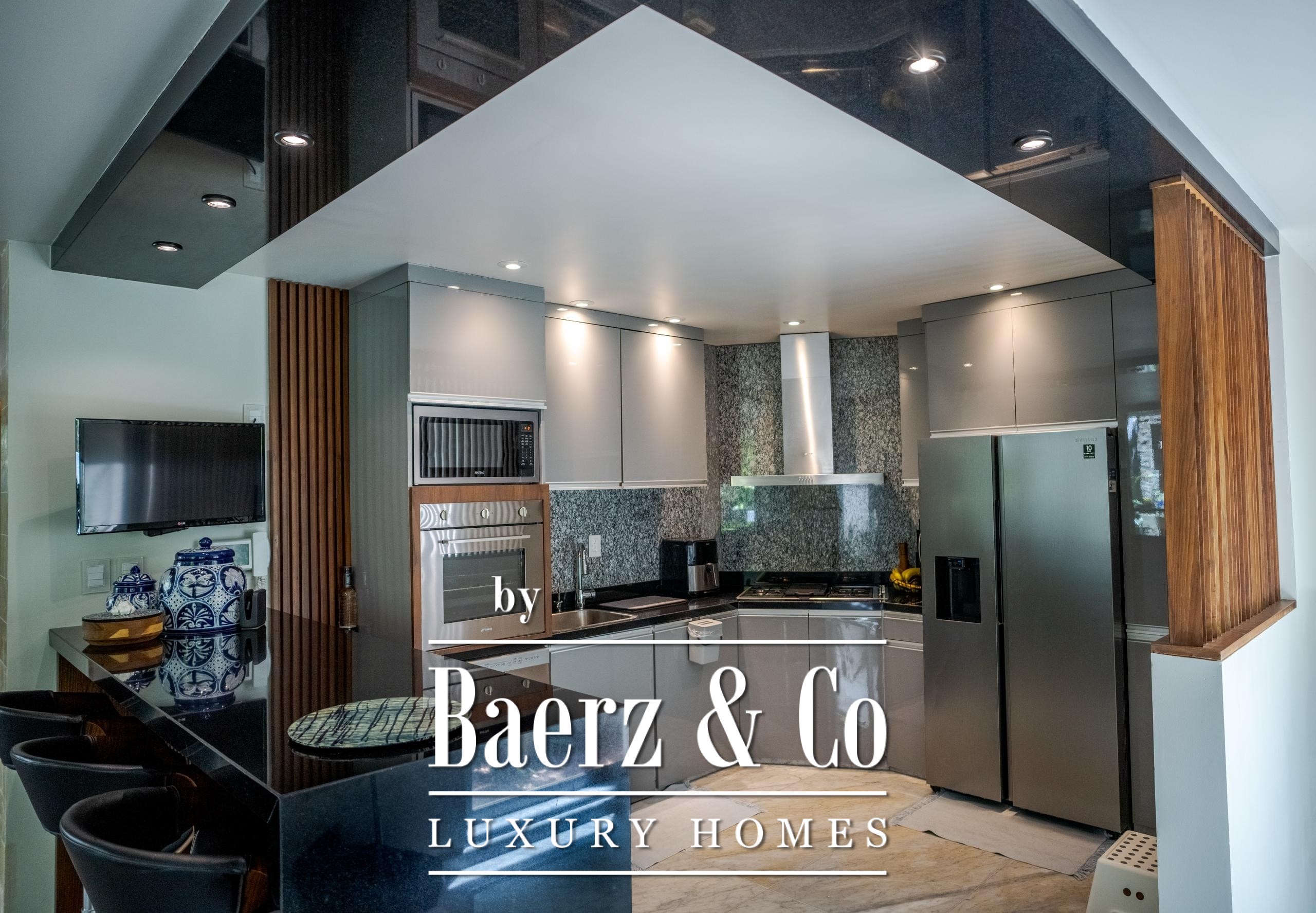 On the main floor, enjoy a spacious living and dining area with sliding glass doors that fully open to a terrace integrated with a beautiful tropical garden, creating the perfect atmosphere for relaxation or entertaining. The fully equipped kitchen features a breakfast bar connected to the dining area, black granite countertops, and fine wood cabinetry — ideal for those who love to cook or host guests.