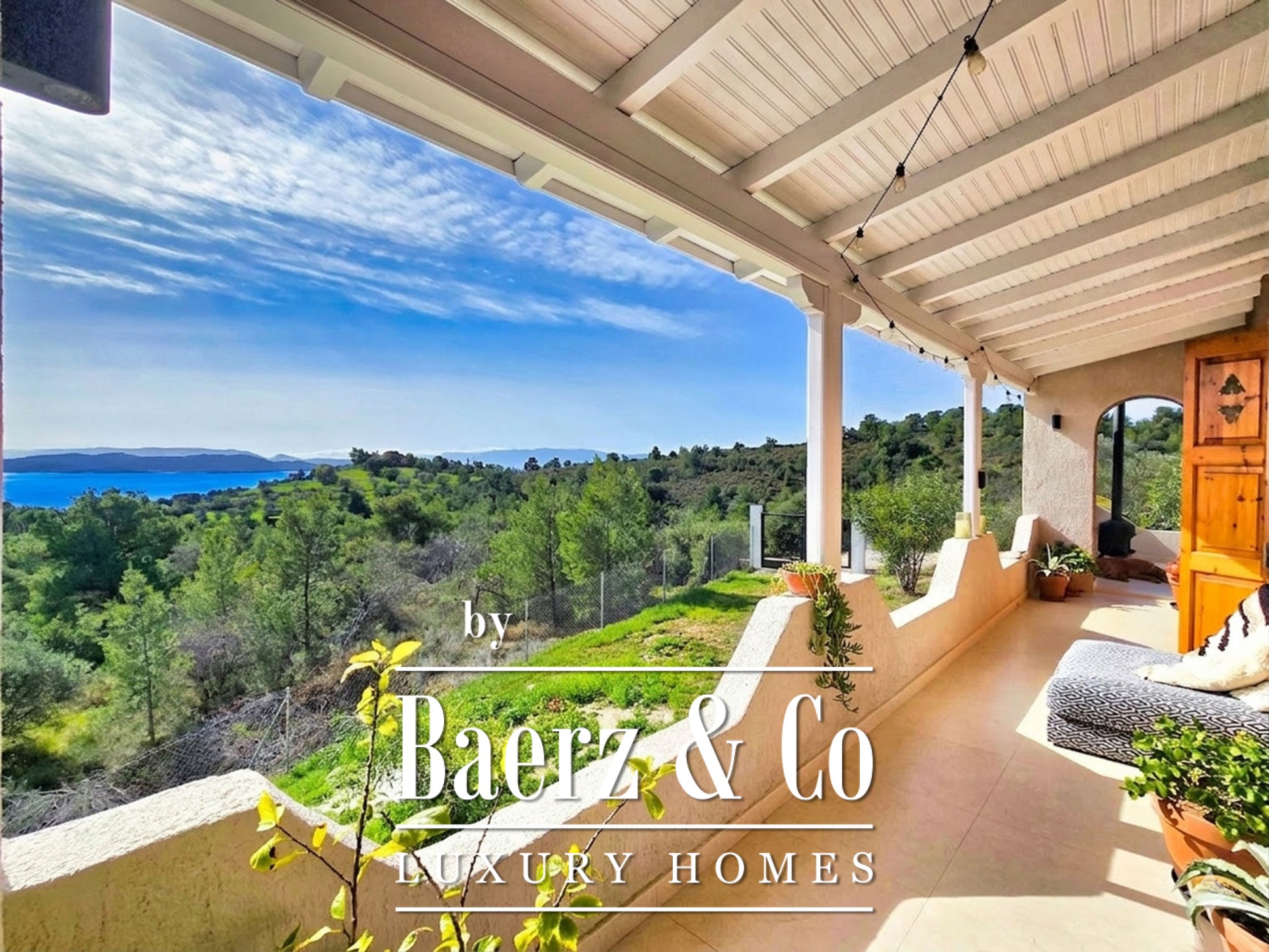 Detached house Portocheli presents a rare opportunity to experience refined living amidst natural beauty. This independent residence, with a total living area of 126 m², is set within a 2,100 m² fenced and partially landscaped plot. The house stands elevated on a quiet hillside, surrounded by elegant country homes and enriched by panoramic views of the natural landscape and the sea.