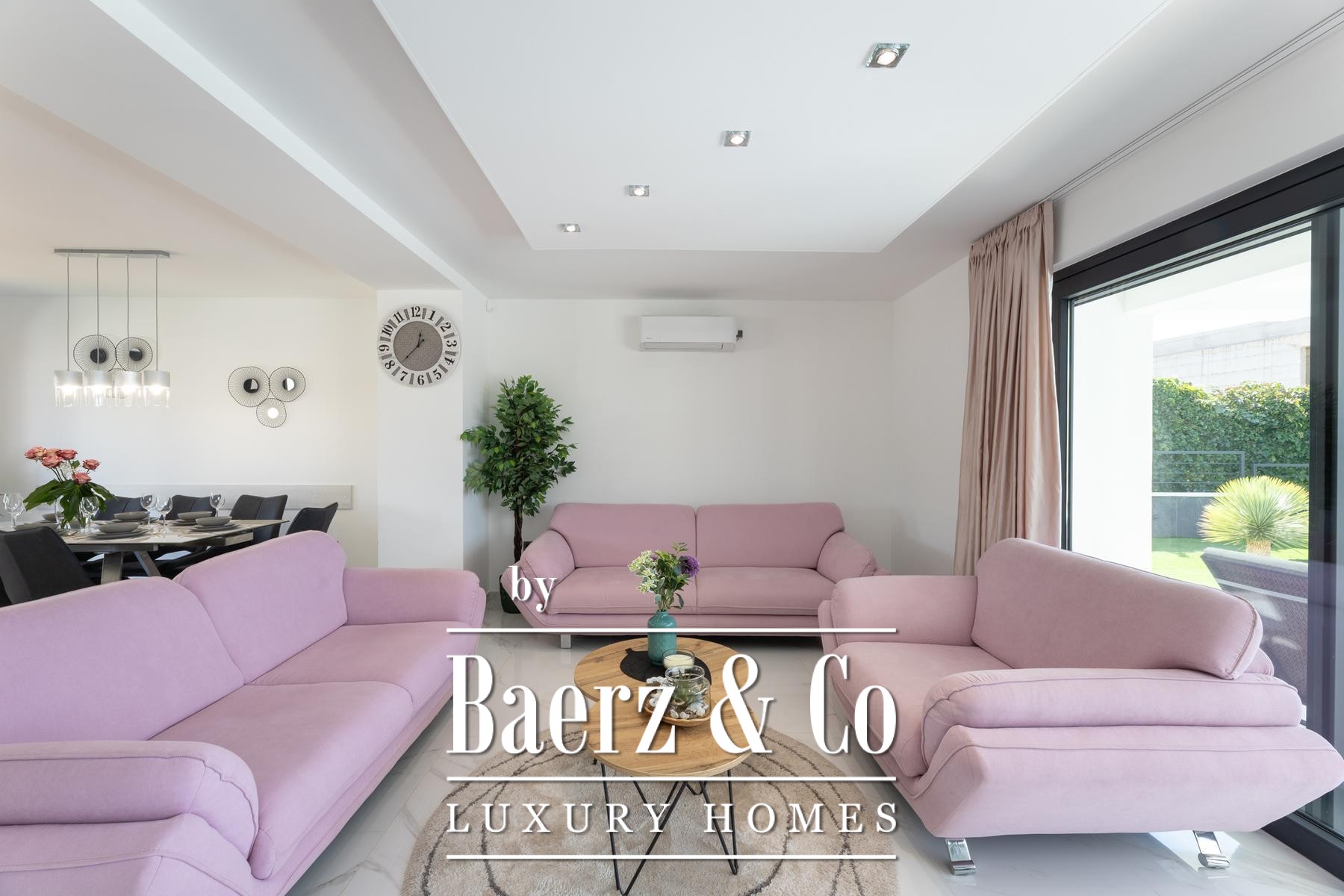 Upstairs, four additional bedrooms—two with en suite bathrooms and three with private balconies—offer serene privacy. Practicality extends below with a basement accessible by exterior stairs, while the surrounding gardens and sun terraces frame daily life in natural calm. Four dedicated parking spaces sit discreetly to the side, complemented by a barbecue area at the rear designed for convivial dining. Just 2,200 metres from the shore and situated in a tranquil enclave, this villa blends seclusion with proximity. Premium furnishings and appliances complete the offering, making this a distinguished opportunity for refined coastal living.