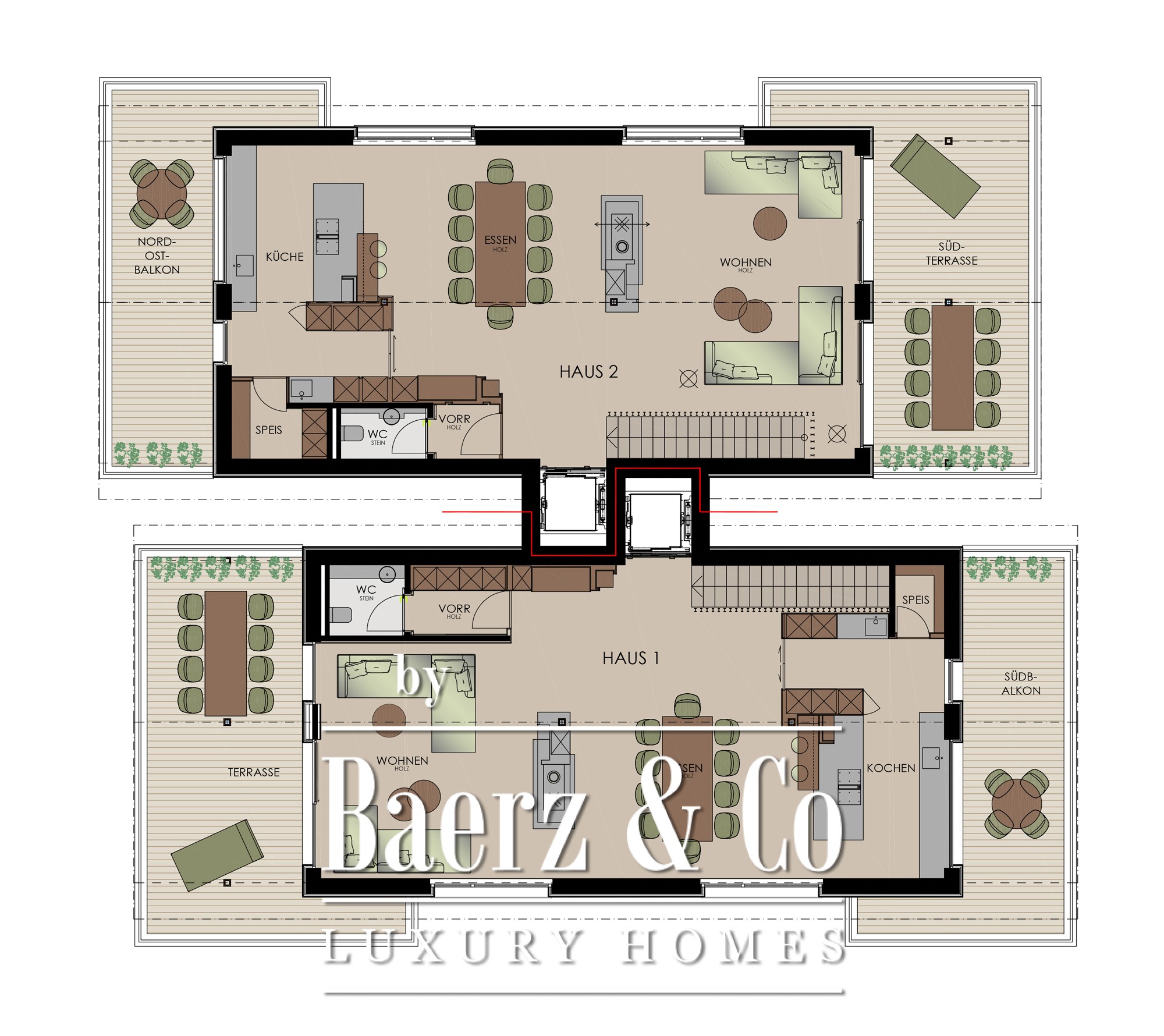 Particularly worth mentioning is the possibility of purchasing both houses together as a dual house (e.g. use as a multi-generational house). If you are interested, we would be happy to send you an exposé with the detailed area layout and pricing for dual purchase.