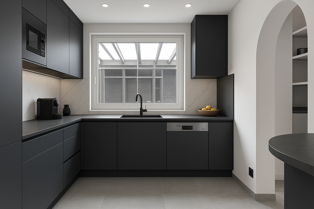 The living room is the heart of the home and exudes warmth thanks to the combination of large windows, a cozy fireplace, and characterful wooden support beams. The open layout offers plenty of scope for arranging a sitting area and dining space, while the sliding door to the garden creates a direct connection to the outdoors. Thanks to the air conditioning, this room is comfortable in every season.