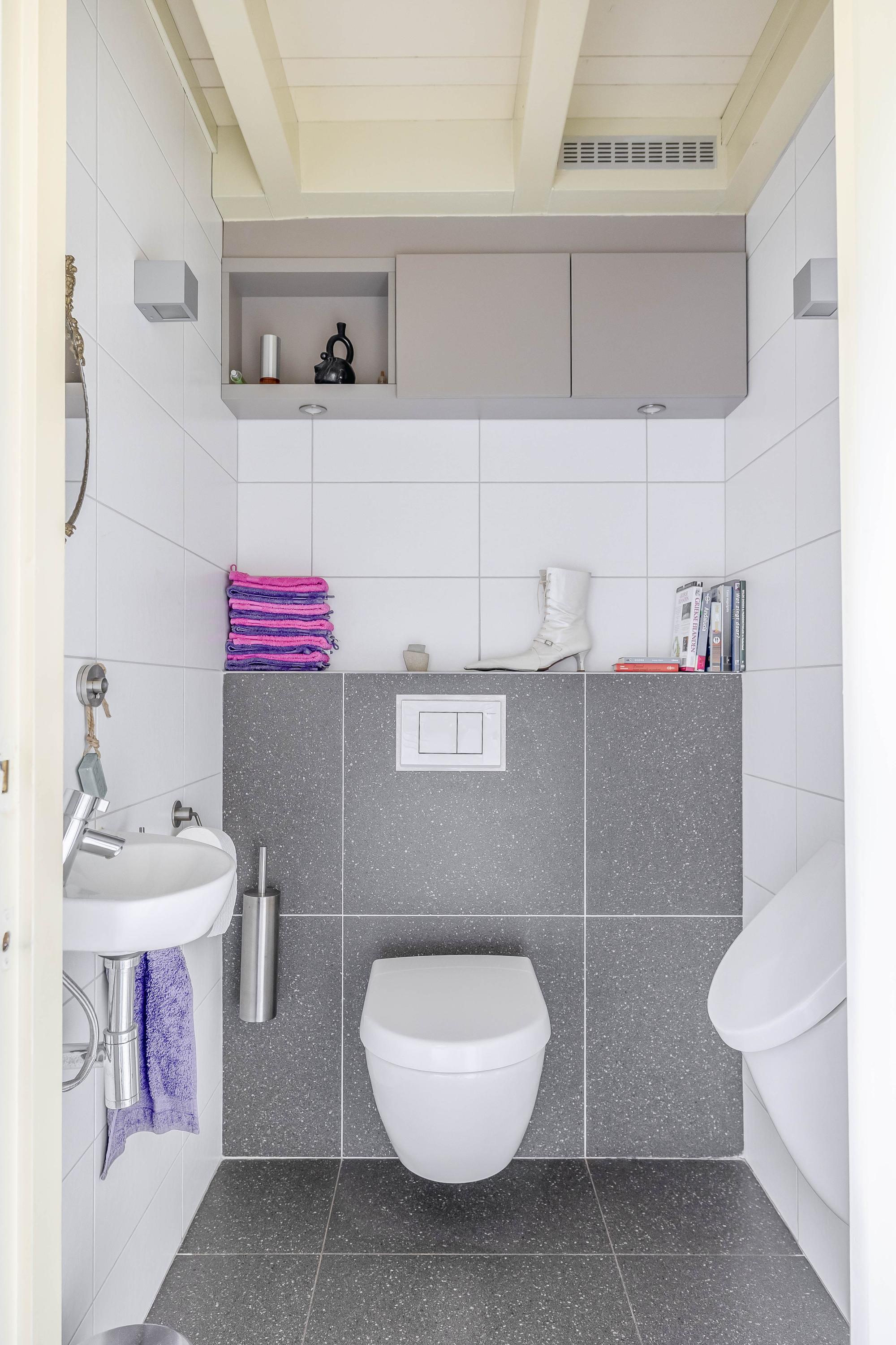 Upon entering the entrance hall, you will immediately notice the tiled floor with underfloor heating in combination with the sleek plastered walls and plastered ceiling. The beautiful view of the first floor through the loft and staircase to the upper floor is particularly striking. In the hall, you will also find the meter cupboard with a completely renovated interior, equipped with an extensive group layout and three-phase power. The hall also contains a fully tiled toilet with wall-mounted toilet, washbasin, urinal, and mechanical ventilation.