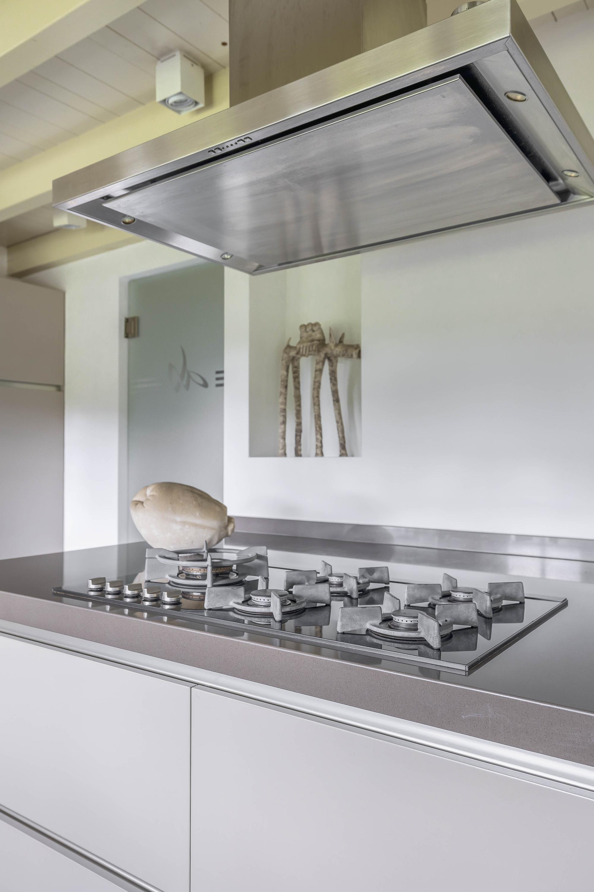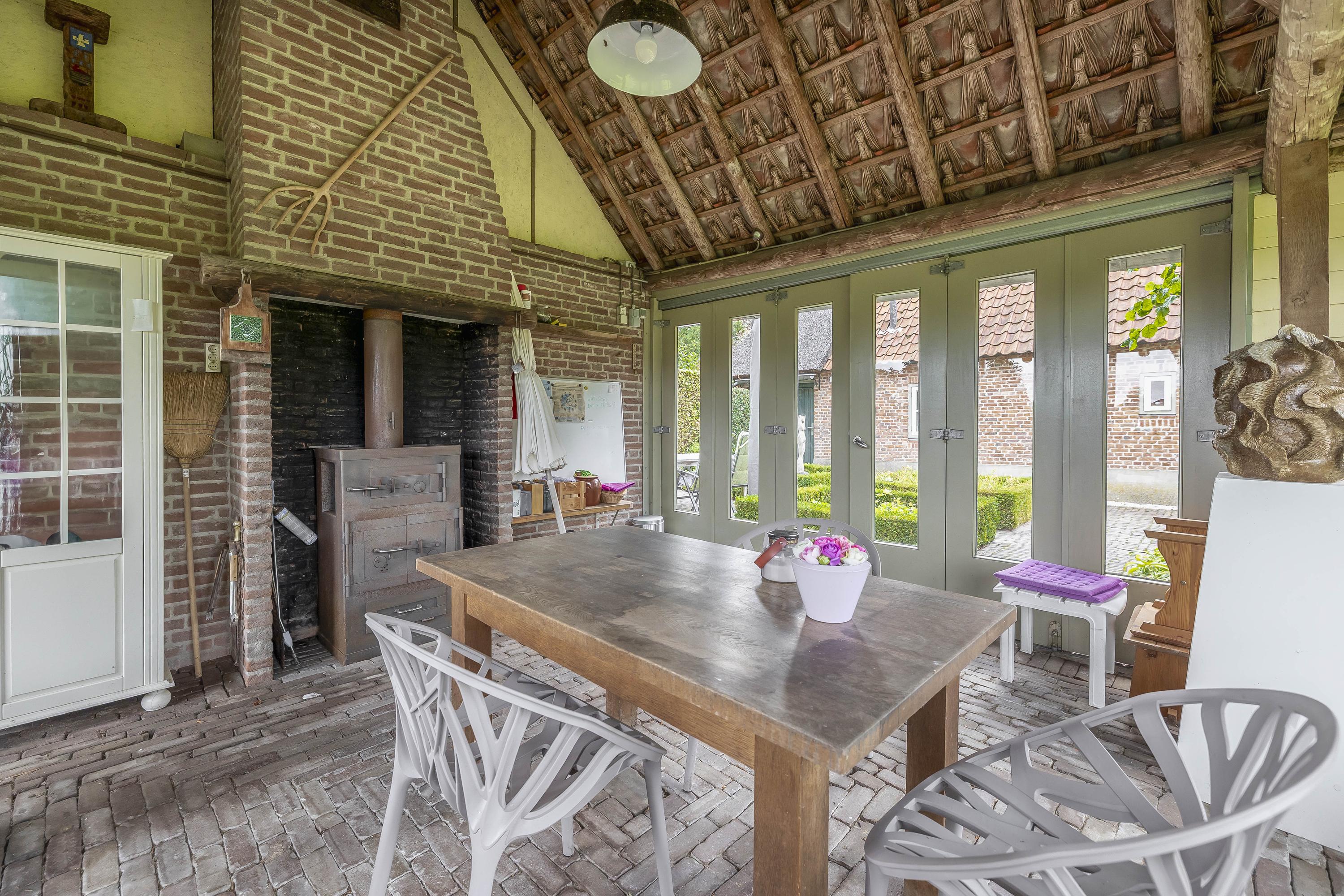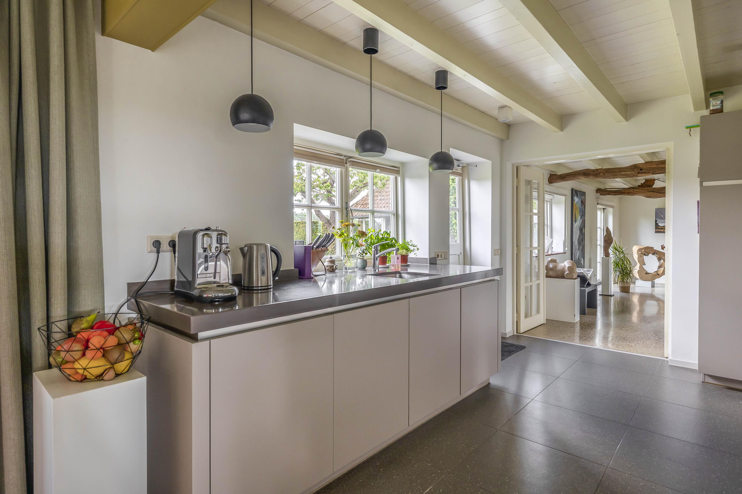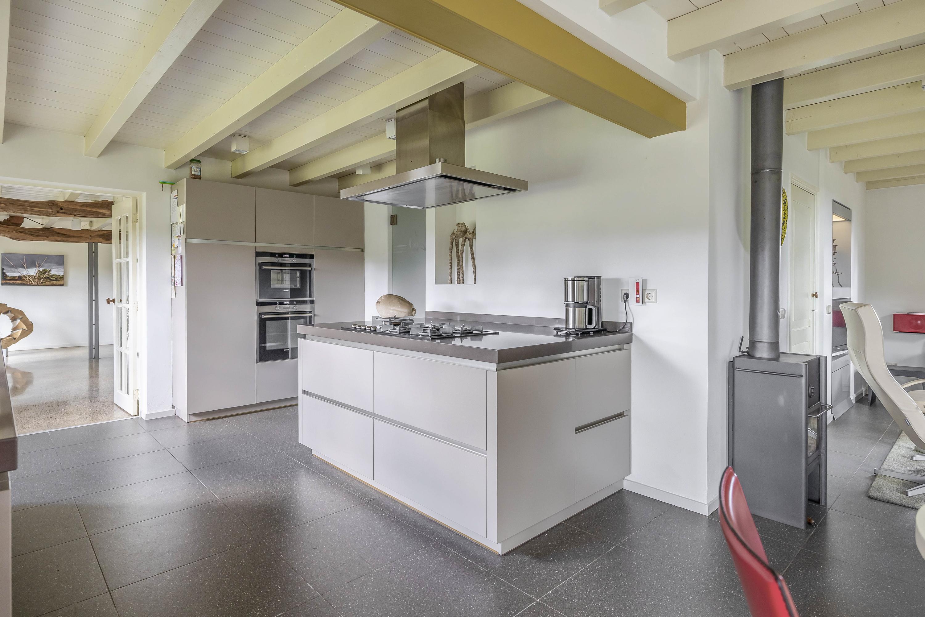 From the hall, you enter the spacious kitchen on the left side of the house. The kitchen also has a tiled floor with underfloor heating, stucco walls, and a beautiful wooden beam ceiling. In 2011, the kitchen was completely renovated. It features a cooking/island with a composite countertop, a 5-burner gas hob including a wok burner, extractor hood, and ample storage space. A wall unit with a composite countertop is equipped with a large sink, dishwasher, and a close-in boiler. Another wall unit contains a freezer, refrigerator, oven, and steam oven. From the kitchen, you have access to the backyard through a door and double French doors. The atmosphere is enhanced by the wood-burning stove and a beautiful high window on the side wall with a view through a glass panel in the bedroom on the first floor. There is also a built-in cupboard with the underfloor heating distributor.