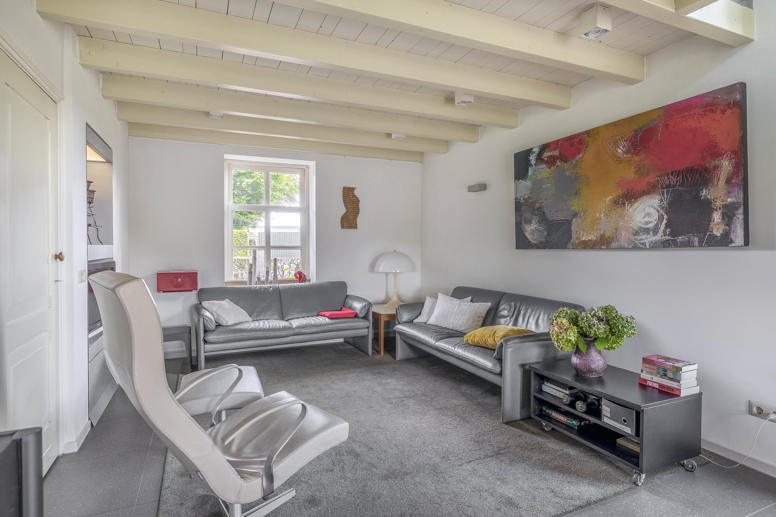 Double doors from the kitchen lead to the living room, which has a smooth, polished concrete floor with underfloor heating. The living room has stucco walls and a beautiful wooden beamed ceiling with attractive old oak beams. A large window at the front and double French doors at the rear offer a beautiful view of the garden. Here too, a wood-burning stove has been installed for extra warmth and cosiness.