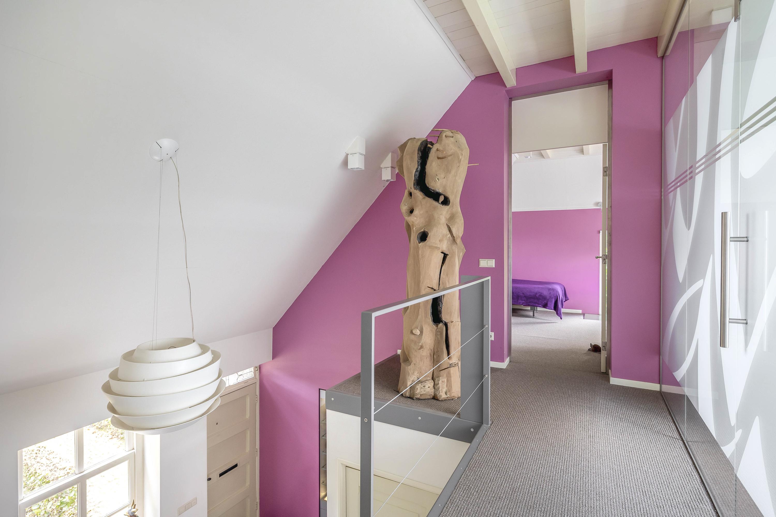 From the fixed staircase in the entrance hall, you reach the first floor of the main house. Here you will find a spacious landing with carpeted floors, stucco walls, and a beamed ceiling, with a view into the hall on the ground floor. From here, you have access to two bedrooms and the second bathroom.
