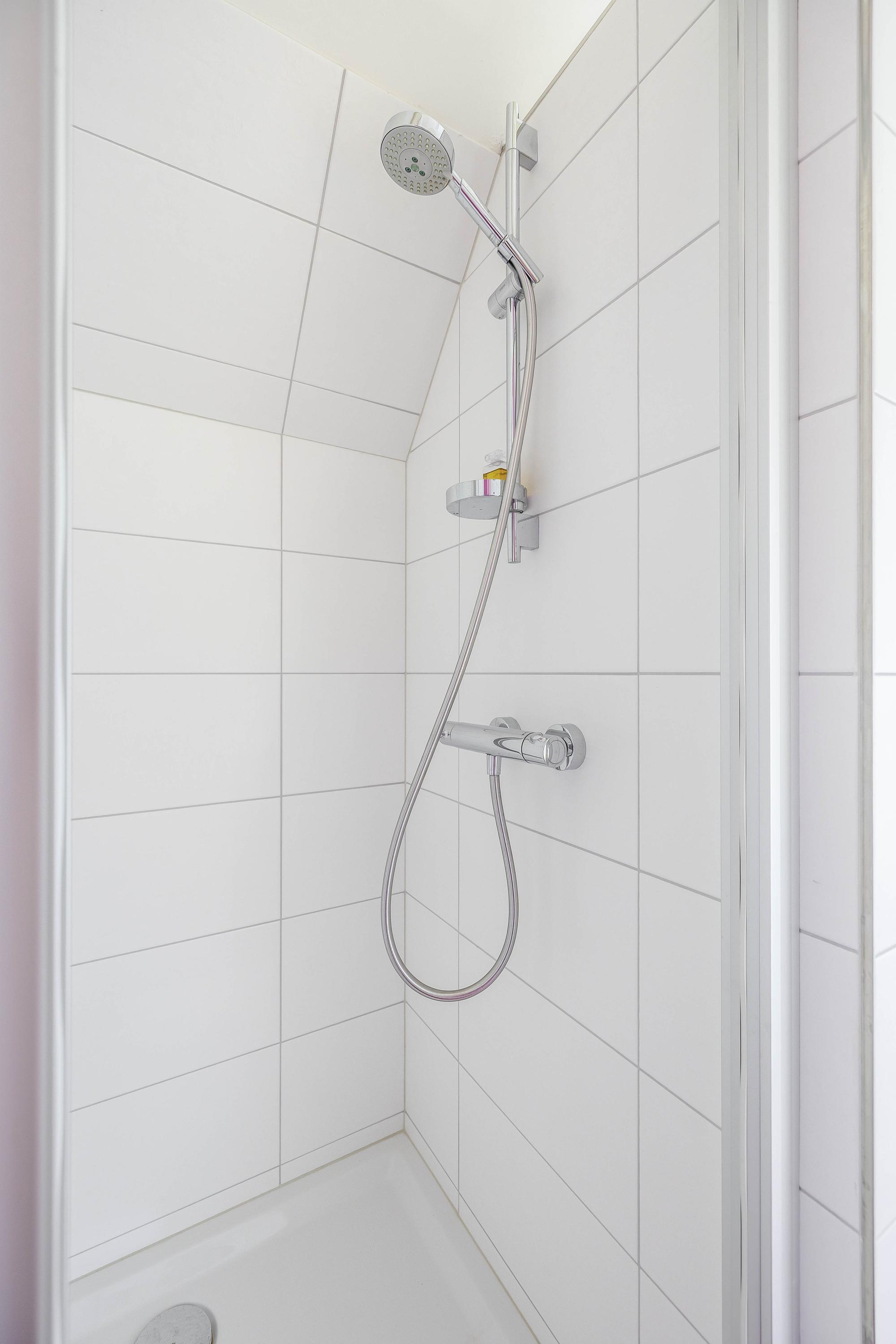 The bathroom on this floor is separated from the landing by a glass wall with a glass door. It has vinyl flooring and the walls are partially tiled. A large Velux skylight provides the necessary light. The bathroom is equipped with a wall-mounted toilet, a washbasin with mixer tap, and a shower cubicle with thermostatic tap, which can be closed off with a sliding door.
