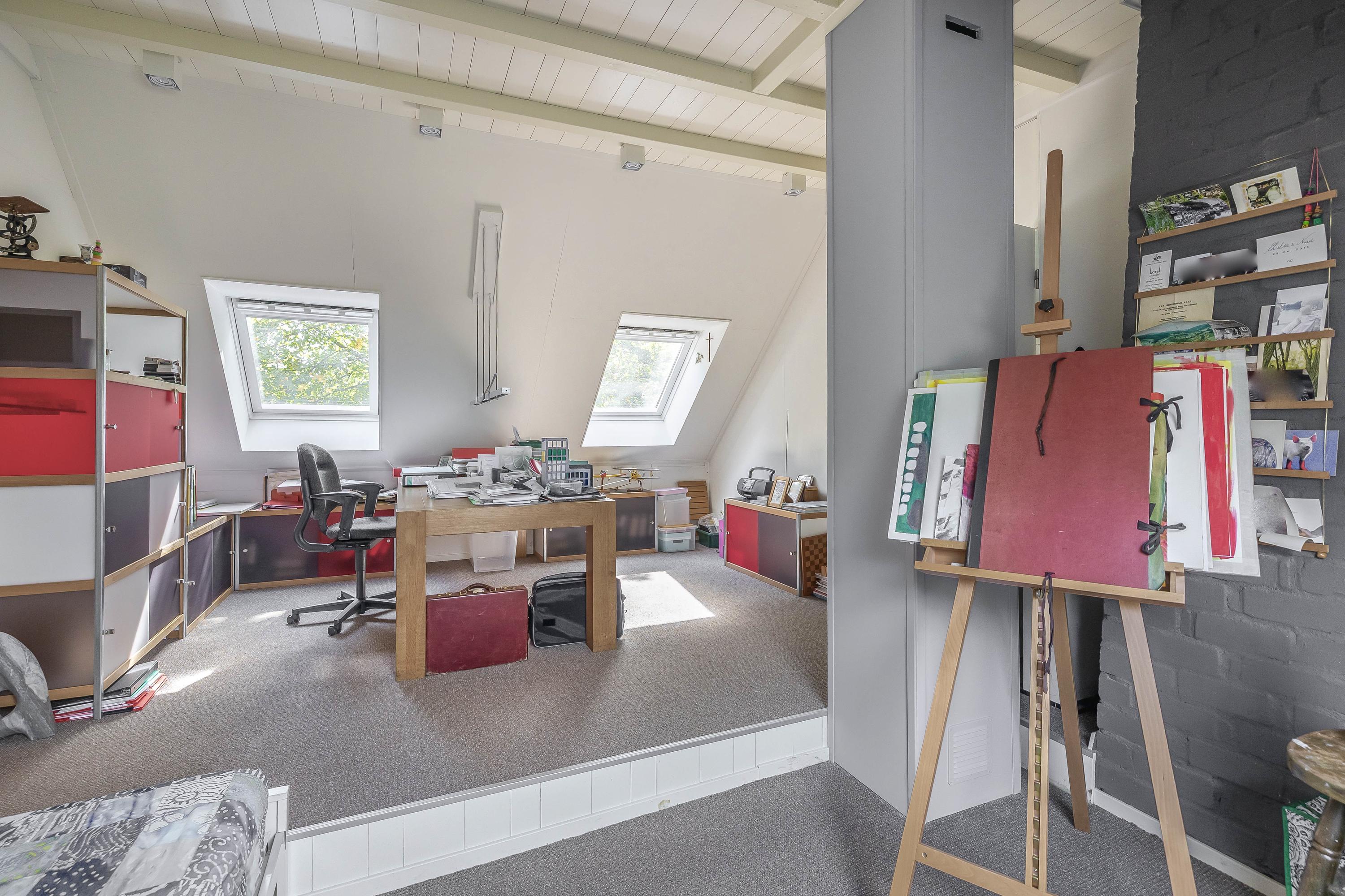 The part of this annex that is used as a studio has a concrete floor, two skylights at the rear, windows on three sides, and a sink with cold water connection. From here, a fixed staircase provides access to an attic space with a large Velux skylight and ample storage space. The studio space also has a man-sized wine cellar, accessible via a hatch with a fixed staircase. The studio space is also equipped with a gas wall heater.