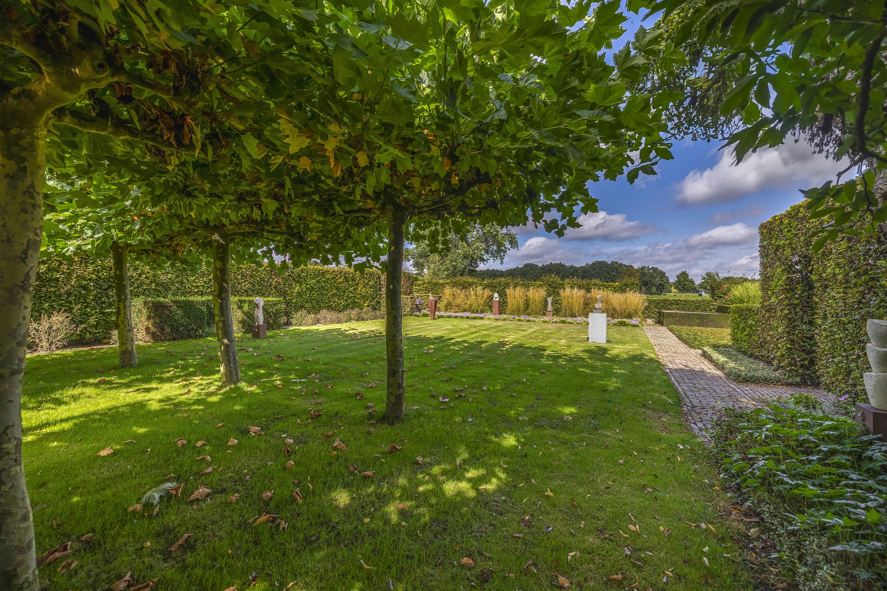 Behind the house and on the sides is a beautifully landscaped garden. On the left side is a nice, spacious area with a lawn, plant borders, old baked clinker paving, and various beech hedges. At the rear, you can enjoy a beautiful view, a large pond (with biological filter), a spacious lawn, plant borders, and mature vegetation. The garden is well laid out and well maintained. There is a double driveway on the right side of the property. The garden even offers the possibility of keeping small animals. There is also a section of the garden with a “lovers' lane.” To the left of the house is a landscaped jeu-de-boules court.
