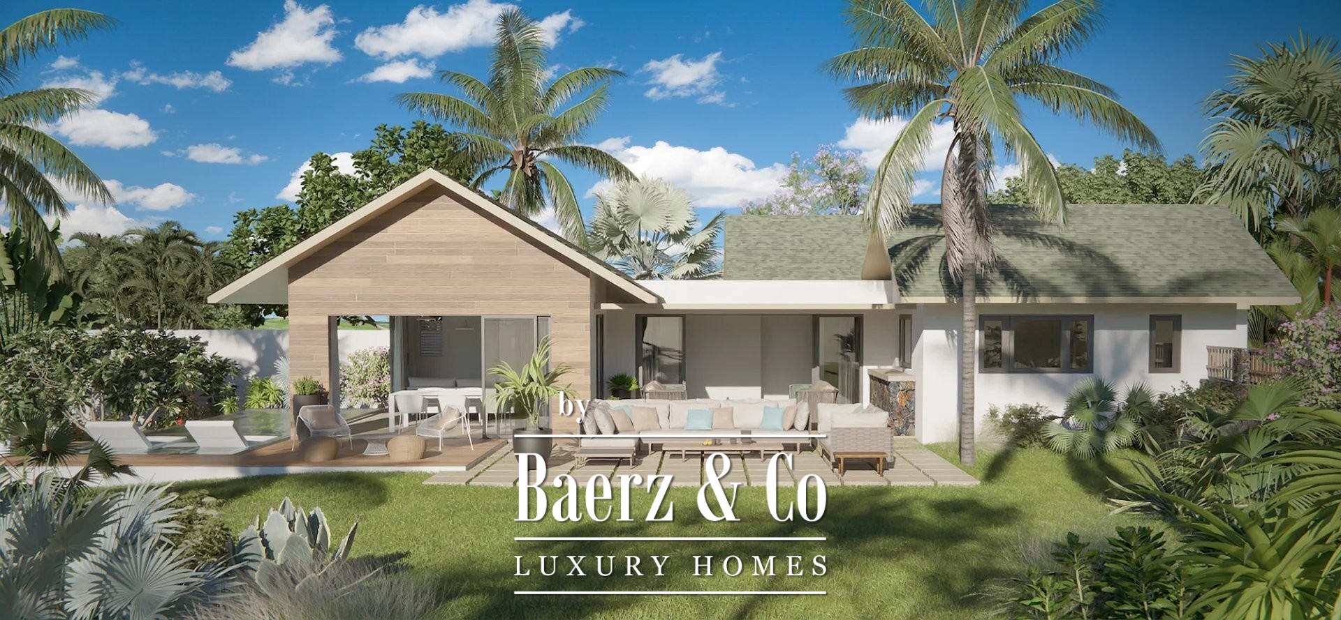 The single-storey residence offers three suites, each with a private bathroom, and a spacious living area that opens onto a landscaped terrace. A fully equipped kitchen with ample storage, air conditioning, and carefully considered details create a sense of effortless comfort. Outdoors, a private swimming pool, deck, and lush garden invite calm moments under tropical skies, with views that carry to the horizon.