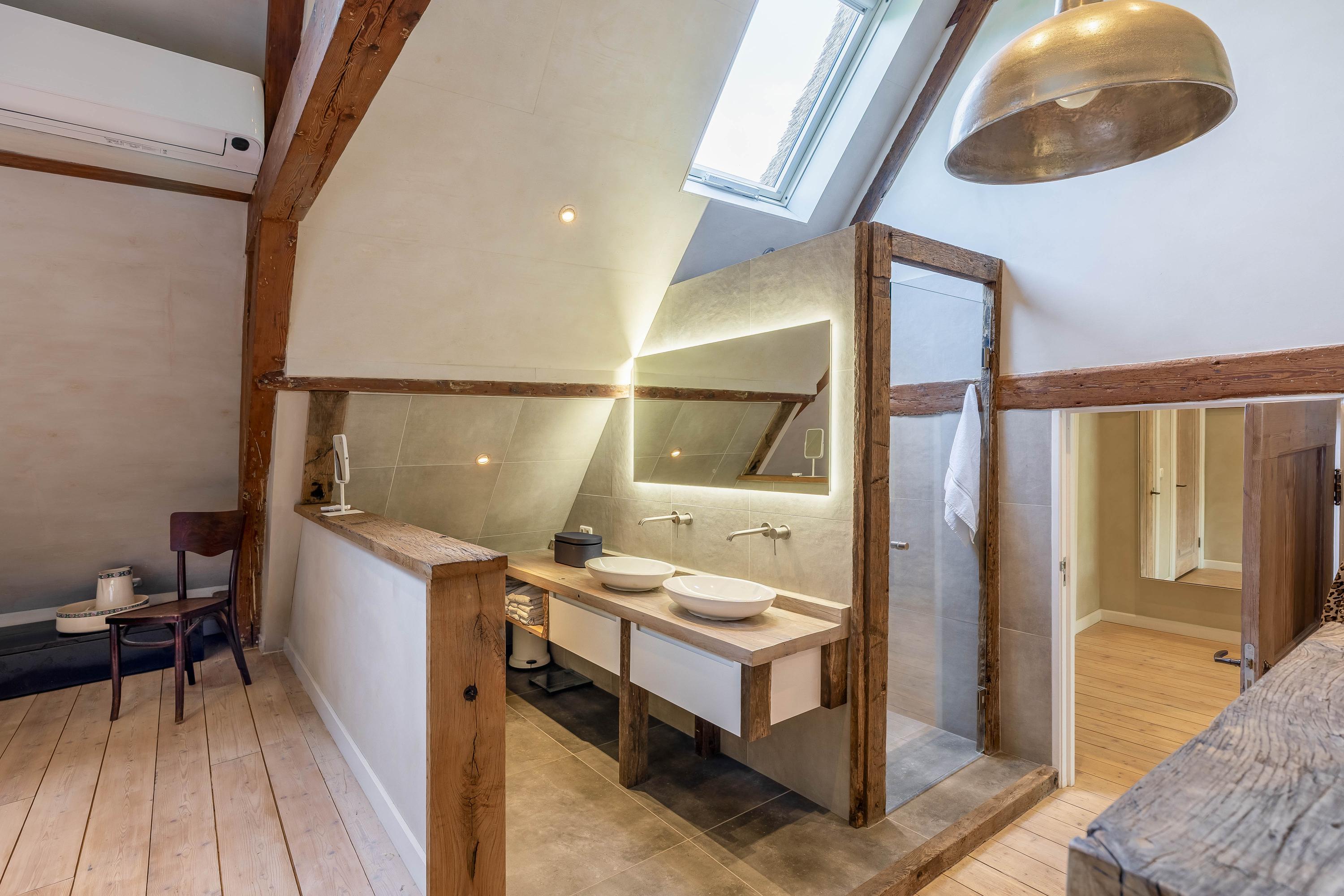 Front entrance with impressive reception area featuring antique fireplace with wood stove, Belgian natural stone floor with underfloor heating and monumental box bed wall (a separate toilet, a bathroom with shower and washbasin, and the staircase to the upper floor are hidden behind it), access to the wine cellar and the raised room above, currently used as an office, atmospheric living room with wooden floors, fireplace and wood-burning stove, passage to cosy farmhouse kitchen with professional appliances including a convection oven, induction hob, extractor fan, dishwasher, fridge and stainless steel worktop, wooden floorboards and door to the garden, bedroom with fireplace and wooden floors, side entrance with wardrobe, luxury toilet, utility room with additional kitchenette and washing machine connection, luxurious wellness area with swimming pool with automatic cover, large jacuzzi, shower and preparations for sauna.