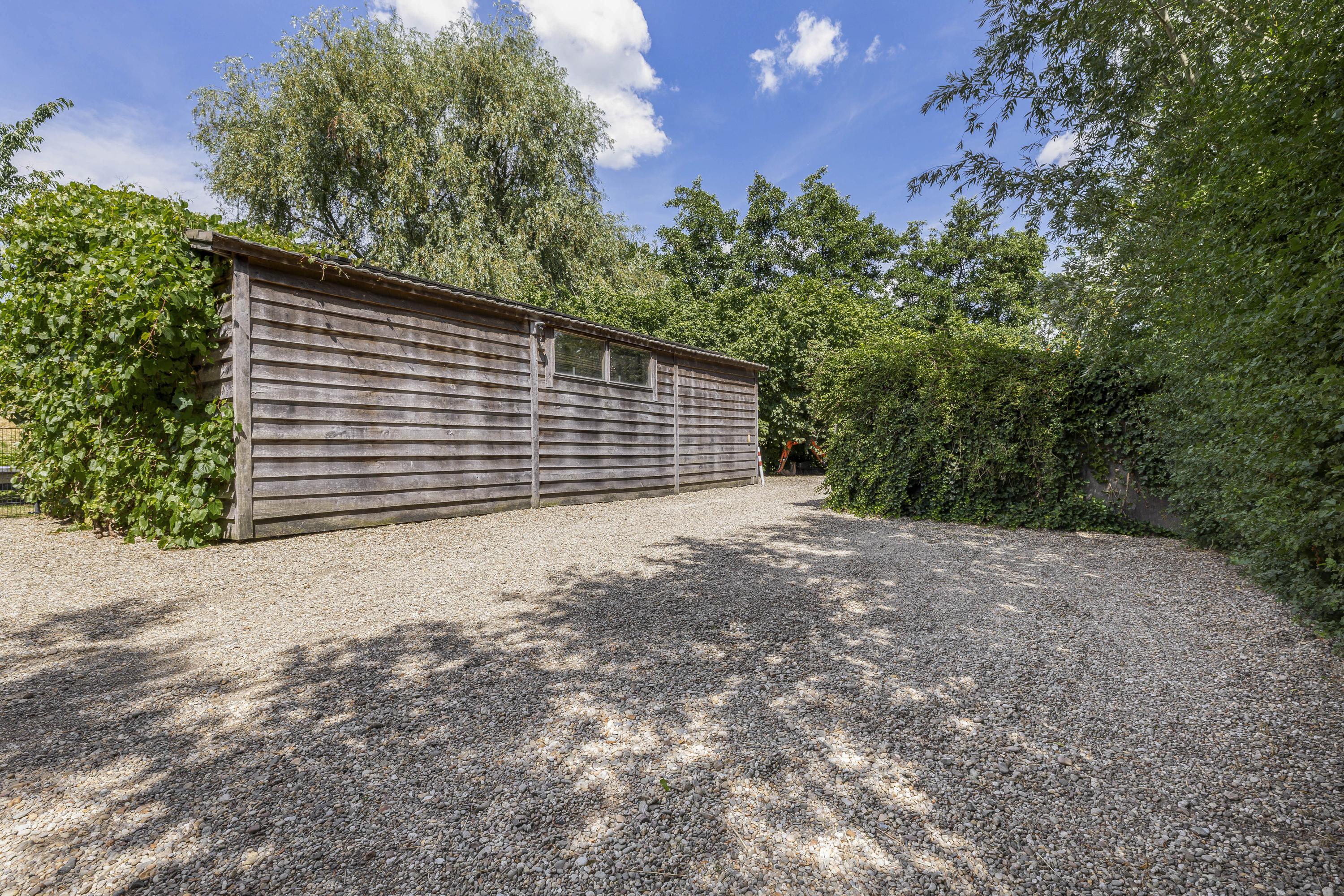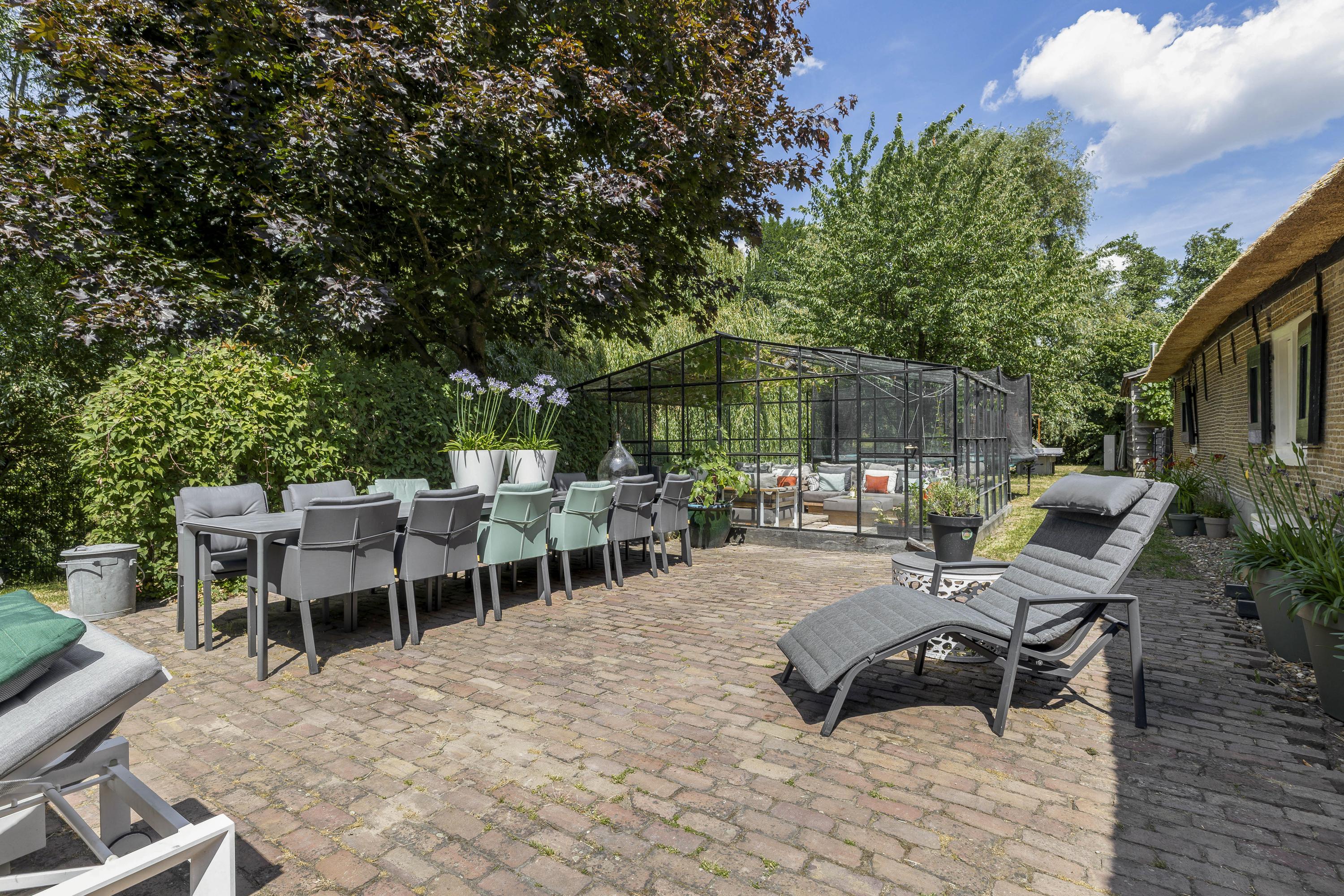 The yard features a spacious garage/barn of over 80m², a large greenhouse – perfect for enjoying even on cooler days – and an inviting canopy directly adjacent to the kitchen. For horse enthusiasts, there are three horse boxes. A drained all-weather riding arena and paddock were also installed in the past. The property is stylishly fenced with a double-spoke gate and accessed via an automatic entrance gate.