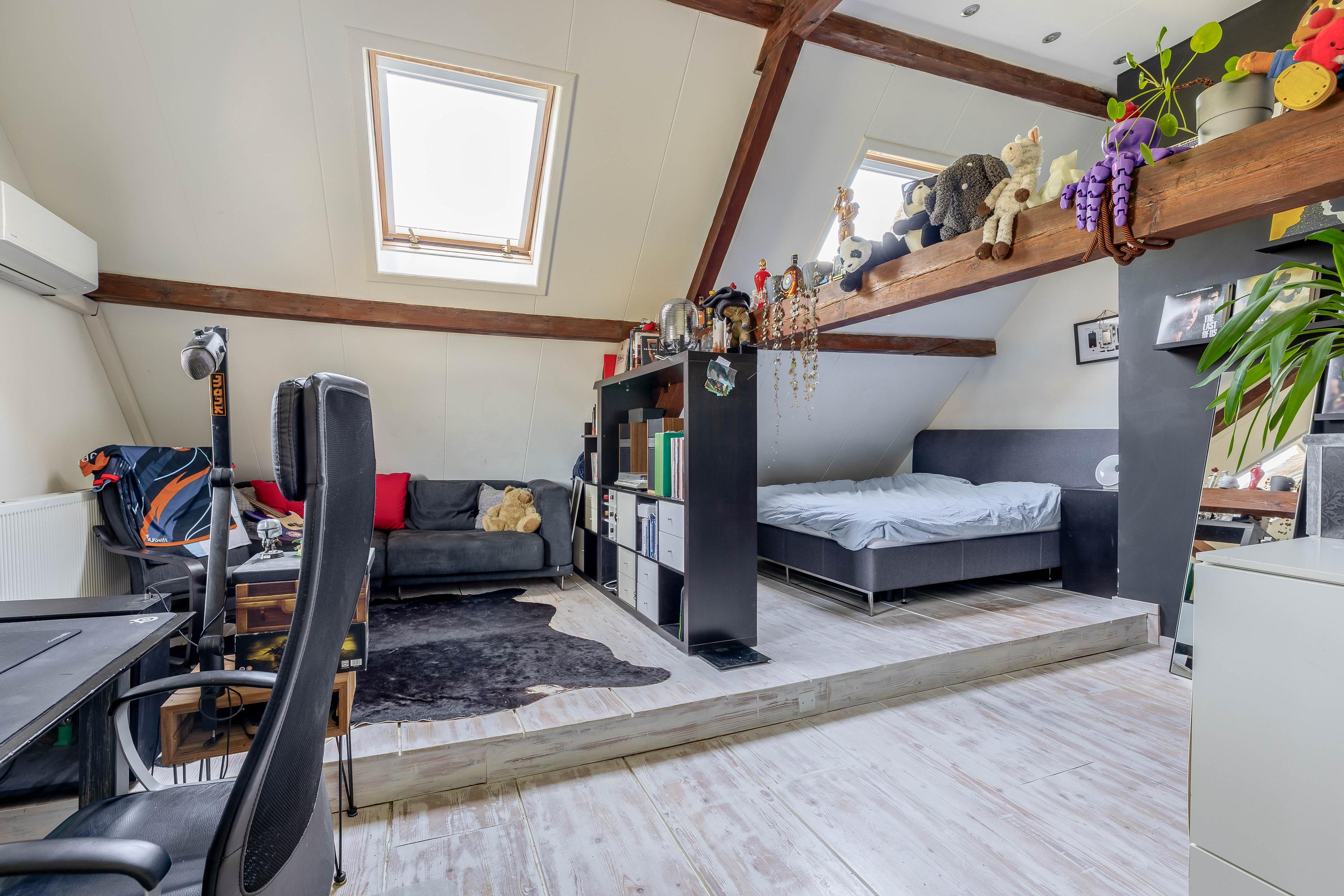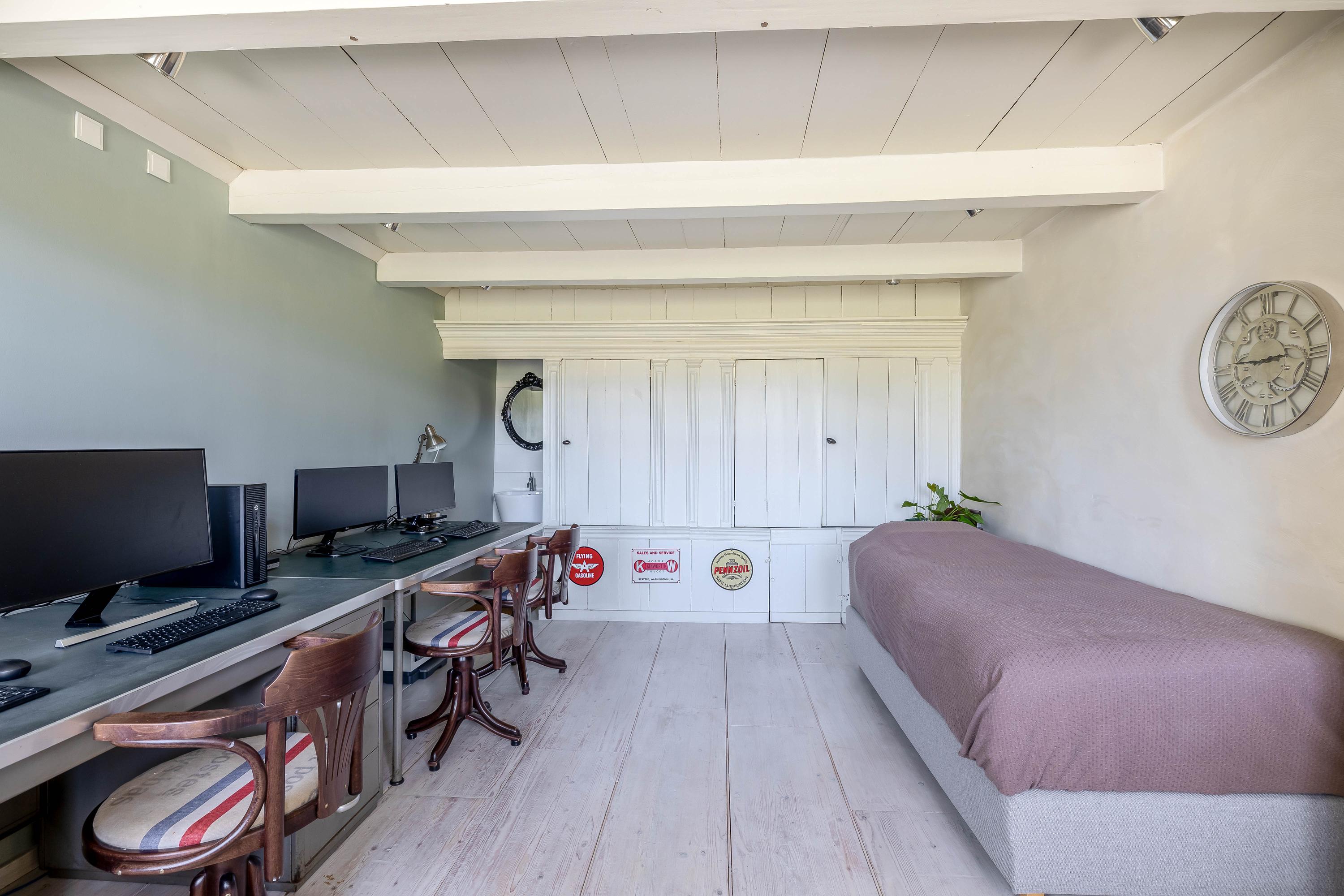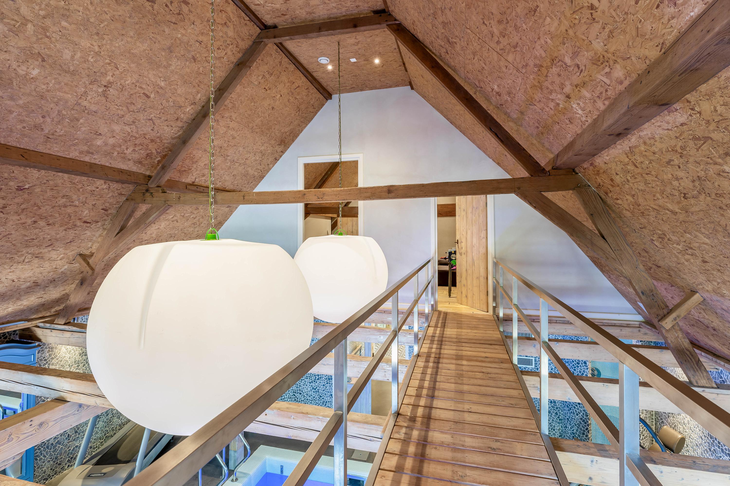 Beautiful staircase, spacious landing with dormer window, separate toilet and walk-in closet, expansive bedroom with 2 new skylights, en-suite bathroom (2020) with walk-in shower, 2 sinks and underfloor heating, entertainment room with billiards and cinema setup, which could also be used as a bedroom, and passage via footbridge over the pool to the rear bedroom with wooden floors.