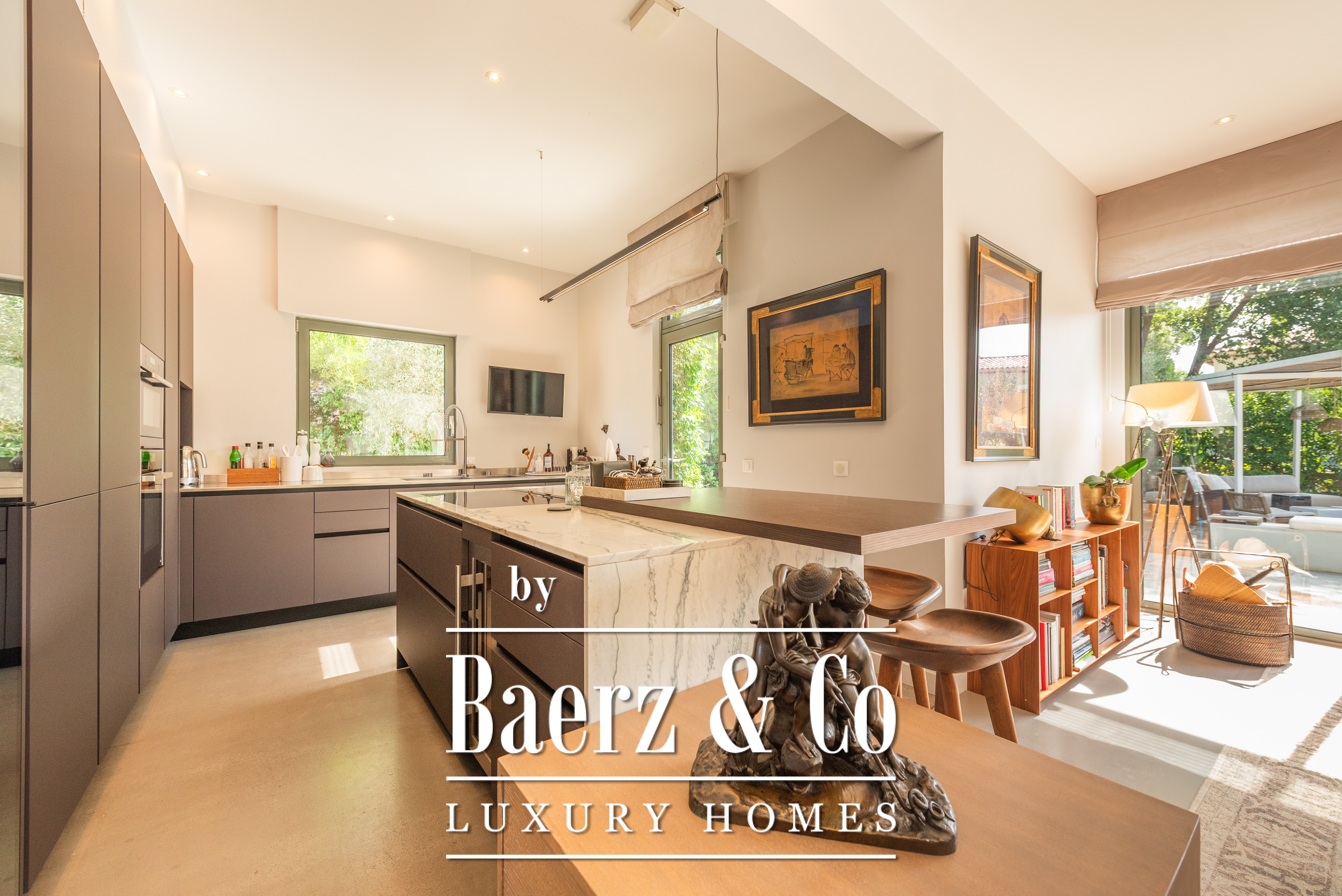 Contemporary house Saint-Raphael defines a rare standard in Mediterranean architecture, seamlessly integrating modern materials and luminous space. Within its 183 m² living area, the residence unveils a double living room suffused with natural light, thanks to expansive bay windows that frame the tranquil outdoors. The main level’s atmosphere is anchored by a streamlined kitchen, fully equipped and carefully considered for both daily living and understated entertaining.