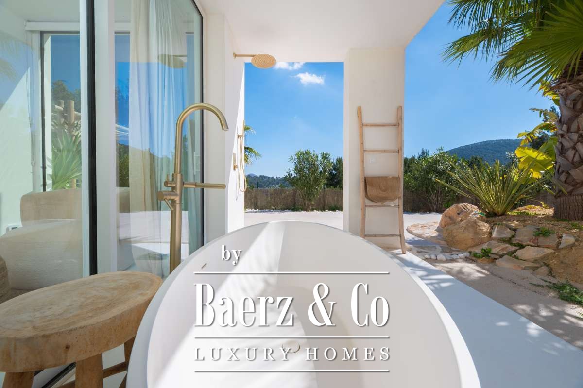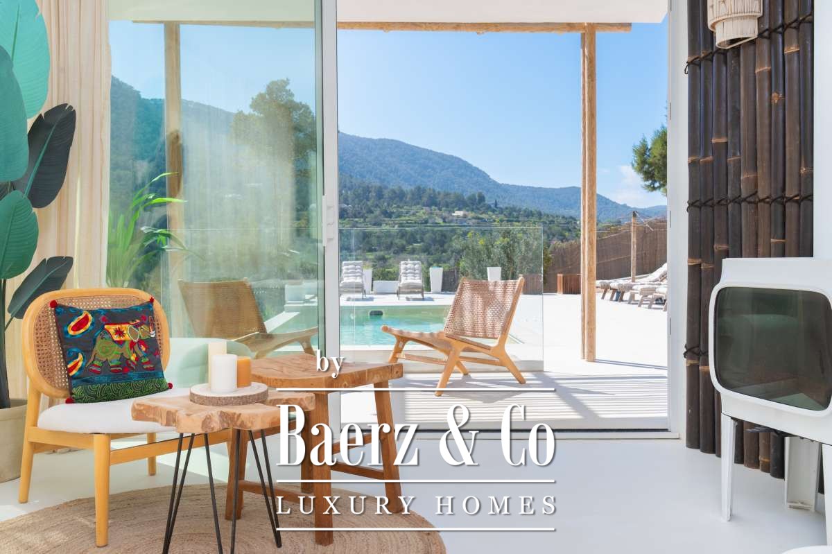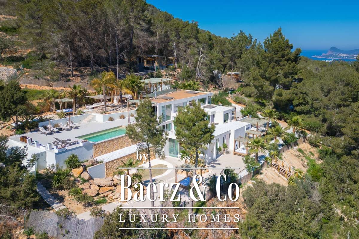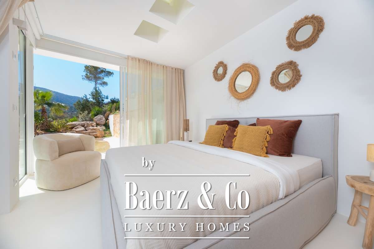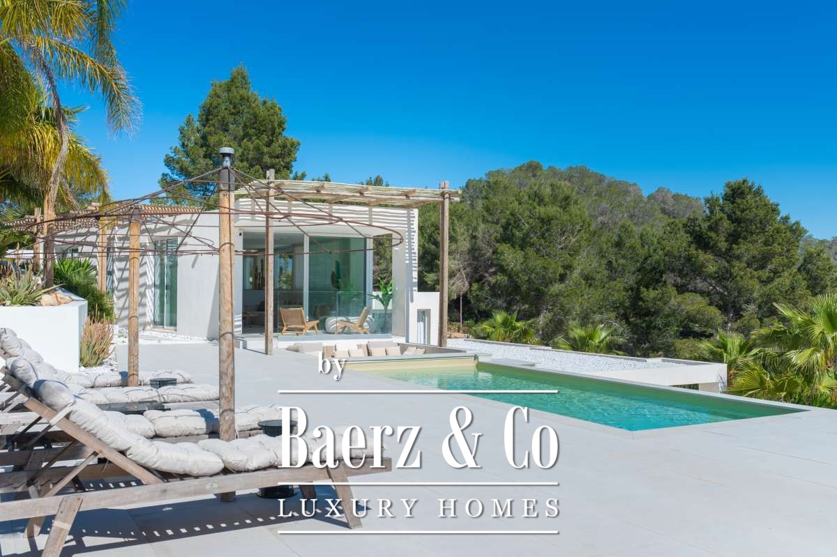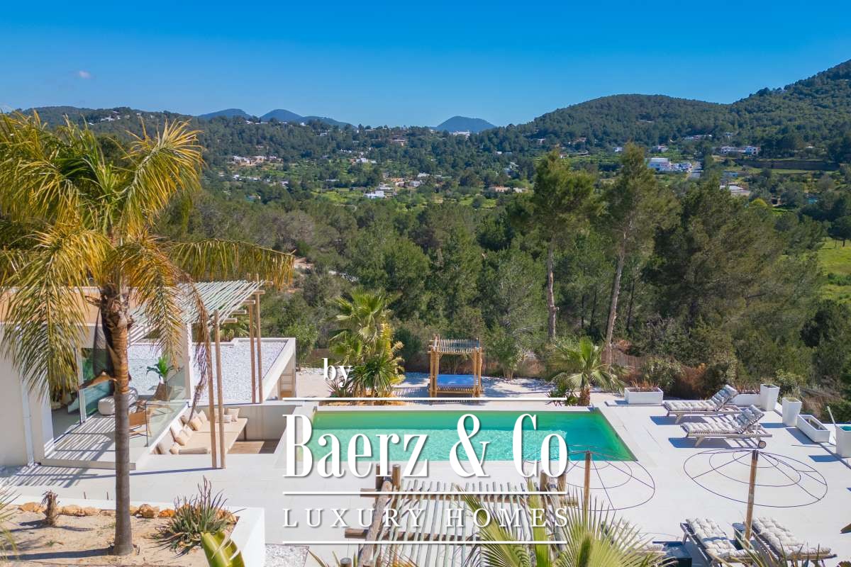 Villa Sant Josep de Sa Talaia panoramic views captures understated luxury in the green western hills of Ibiza. This recently built villa sits on a 19,600 m² plot, surrounded by Mediterranean landscape and forest, and offers a rare combination of privacy, space, and panoramic mountain and countryside views, with glimpses of the sea on the horizon. The location places the charming village of San José and the renowned beaches of Cala Tarida, Cala Conta, and Cala Bassa within easy reach.
