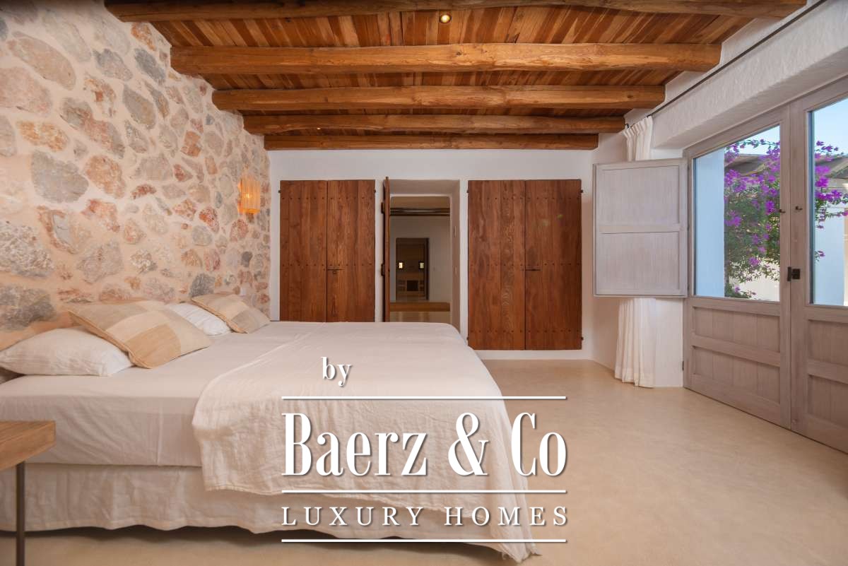 This farmhouse Sant Llorenç de Balàfia resides at the island’s highest valley point, where rolling agricultural land meets forest and mountain views. The property’s terraces open onto a tapestry of olive groves and fruit trees, with vistas extending to the church tower of Balafí and historic walls in the far distance. On the opposite side, the springs of San Rafael bring freshness to the landscape, softening the horizon. Quiet and privacy envelope this 24,215 m² estate, though Eivissa and Santa Gertrudis remain easily within reach.