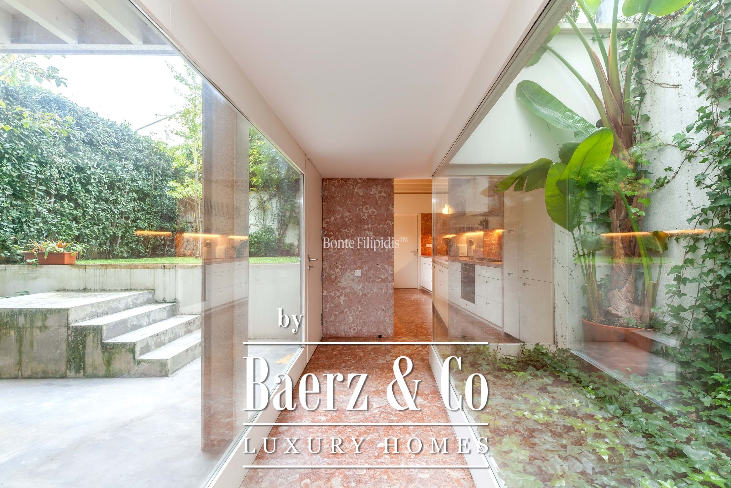 The primary living spaces are marked by original stone flooring and softly vintage accents, with large panoramic windows drawing natural light into the open-plan social area. Here, living and dining zones flow seamlessly out to an 80 m² private garden, a tranquil retreat bordered by mature greenery for quiet moments or reserved gatherings. Subtle material choices and precise detailing lend an understated sophistication to every space.