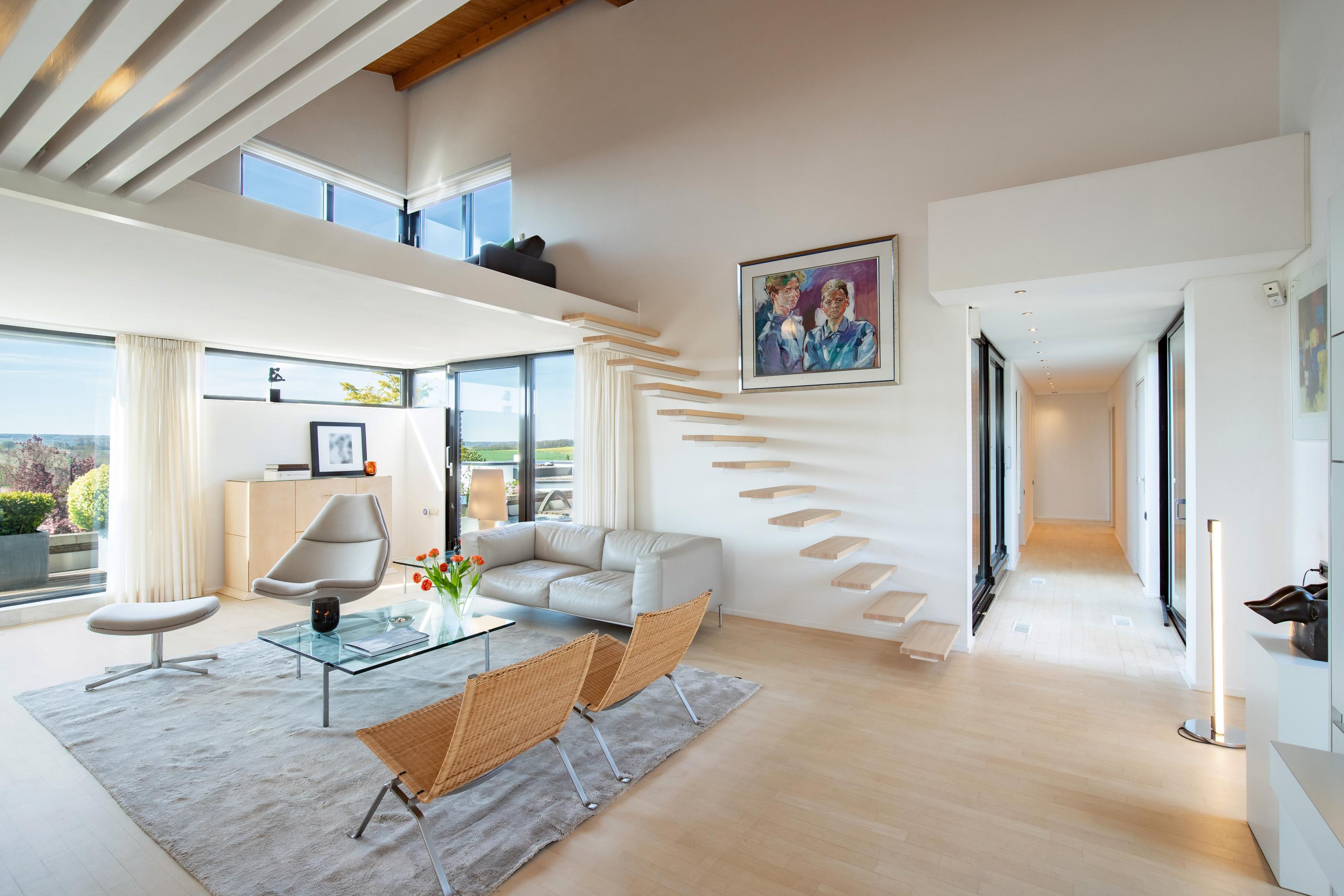 One floor up, accessible via the spiral staircase from the entrance hall, lies the entire living area. An open hallway with a few steps on the right leads to the semi-open kitchen, and on the left to the living room. Generous windows on all facades allow plenty of natural light to flood in. The combination of the sloping wooden ceiling and the roofline, paired with “maple” parquet flooring, enhances the living experience and creates a harmonious atmosphere. The kitchen is arranged in a corner layout and equipped with various built-in appliances. A staircase from the living room leads to the cozy sitting room one floor up, which features a loft. The living room features a cozy gas fireplace.