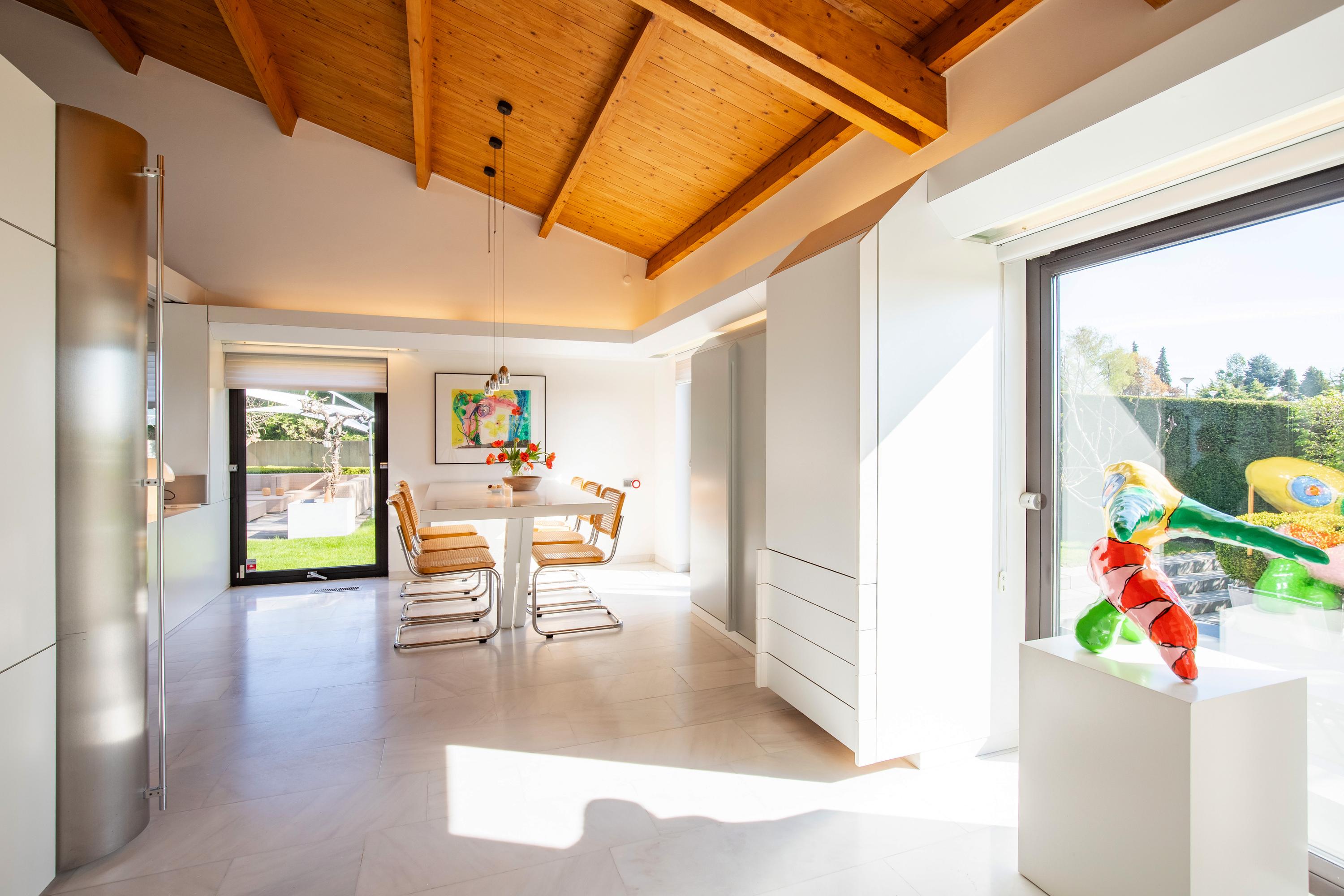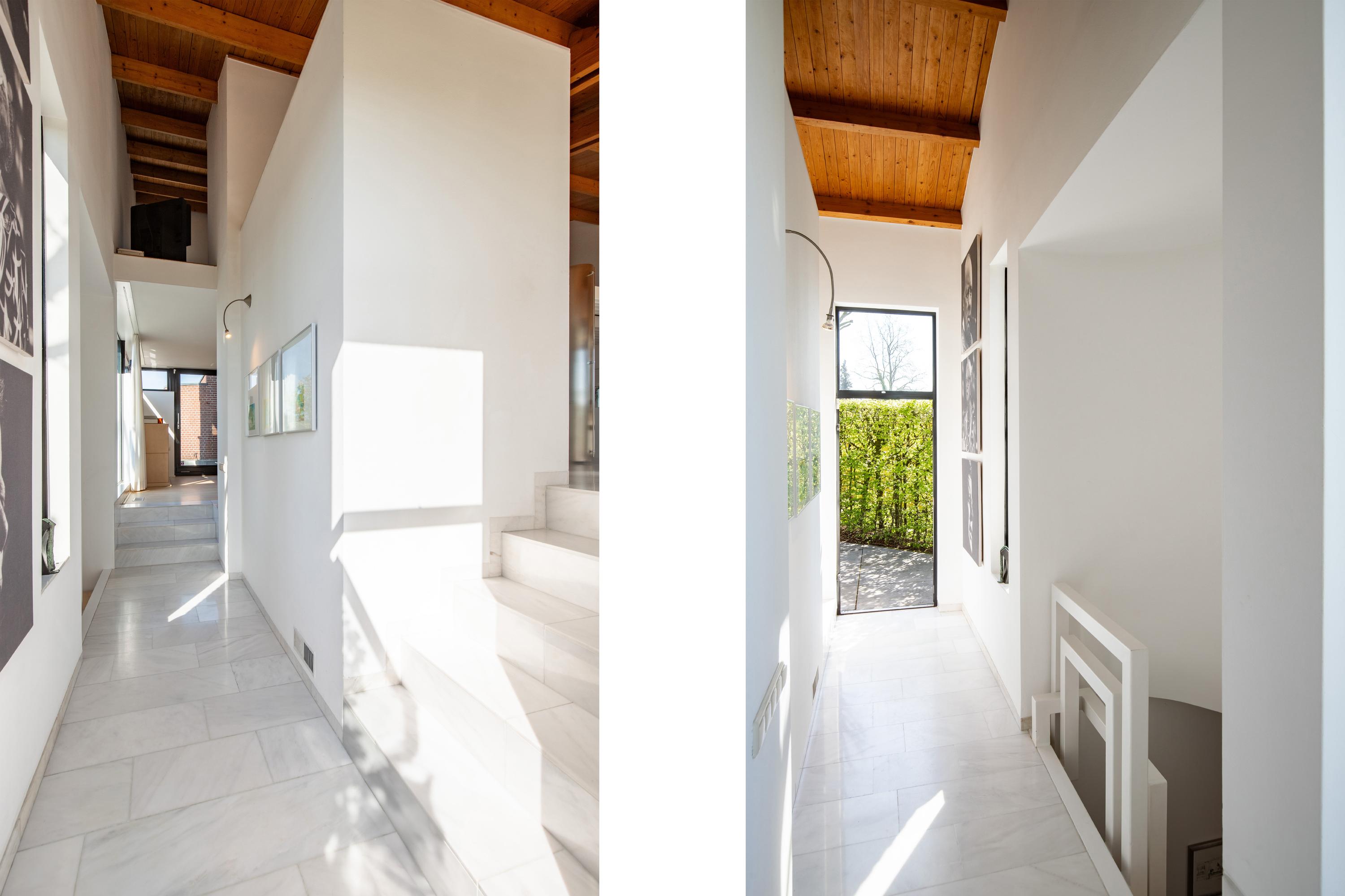 The villa features a highly varied and playful layout. The current owner uses it as a residence with a workspace, located in the spacious practice area on the ground floor. The property is accessible via a paved driveway. The driveway offers space for parking multiple vehicles. Covered entrance to the reception hall. From the reception hall, there is access to the two separate practice rooms currently used as a beauty salon. Utility room with mechanical systems. The indoor garage is equipped with two electrically operated sectional doors. The spacious garage offers parking for three vehicles. The utility room/storage area, located directly adjacent to the garage, is accessible from the garage. This space serves as the mechanical room for the indoor swimming pool. The fully tiled pool area is accessible via a spiral staircase from the master bedroom upstairs, as well as from the indoor garage. The pool measures approximately 45 m². This area also includes a separate restroom and shower room.