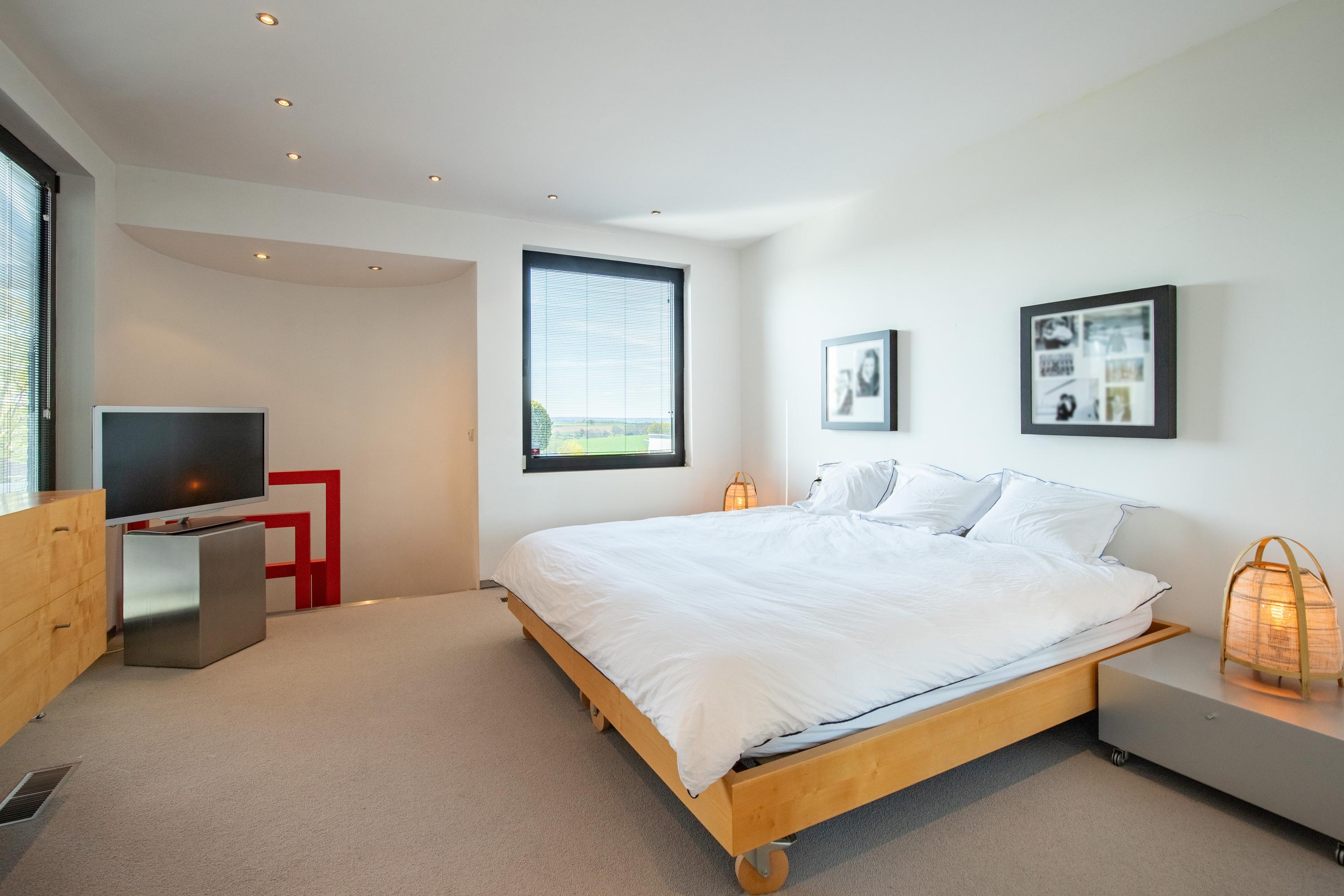 The sleeping areas are connected to the living room and kitchen via a hallway lined with windows on both sides. A beautifully tiled half-bathroom. Three bedrooms, some of which feature built-in closets. A spiral staircase leads from the master bedroom down to the pool at ground level. The tasteful and luxurious bathroom is finished with high-quality materials and accessible from the hallway. First, there is a spacious walk-in closet with built-in cabinetry, followed by access to the bathroom. This has been recently fitted with a wall-hung toilet, a walk-in shower with a tempered glass screen, a freestanding bathtub, and a bathroom vanity featuring a full-width sink with a mirrored wall. The walls and floor feature a distinctive finish with large, ultra-thin ceramic tiles laid seamlessly. Finally, ceiling lighting with elegant recessed spotlights has been installed. The bathroom features underfloor heating. From each of the living areas, there is a direct connection to the exterior of the villa and a magnificent view of the rolling hills and the architecturally landscaped garden. Surrounding the villa are exquisitely landscaped terraces where one can enjoy the sun or shade. A water feature in an elongated concrete element with a wooden deck tastefully completes the ensemble. The beautiful fig trees are a true eye-catcher in the garden. The garden is also accessible from the front and side.