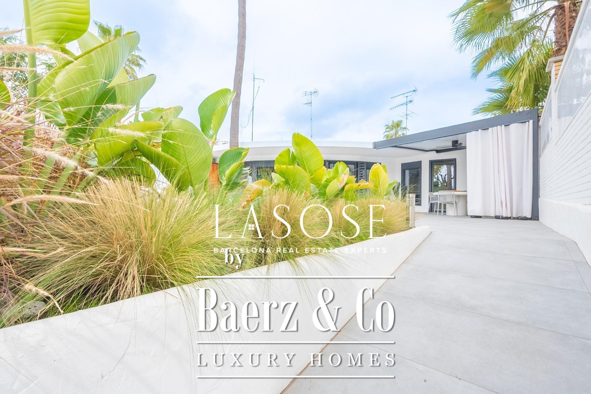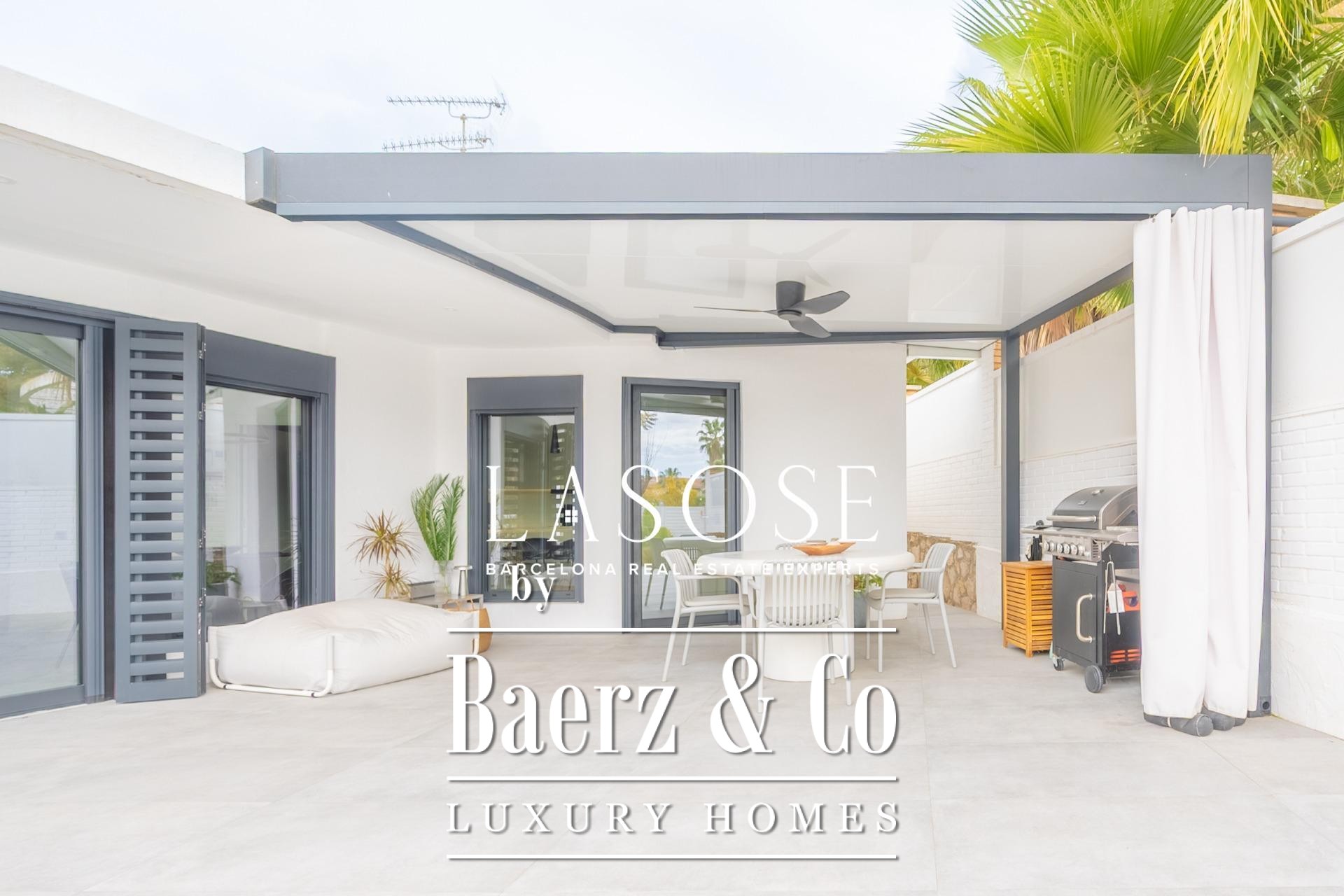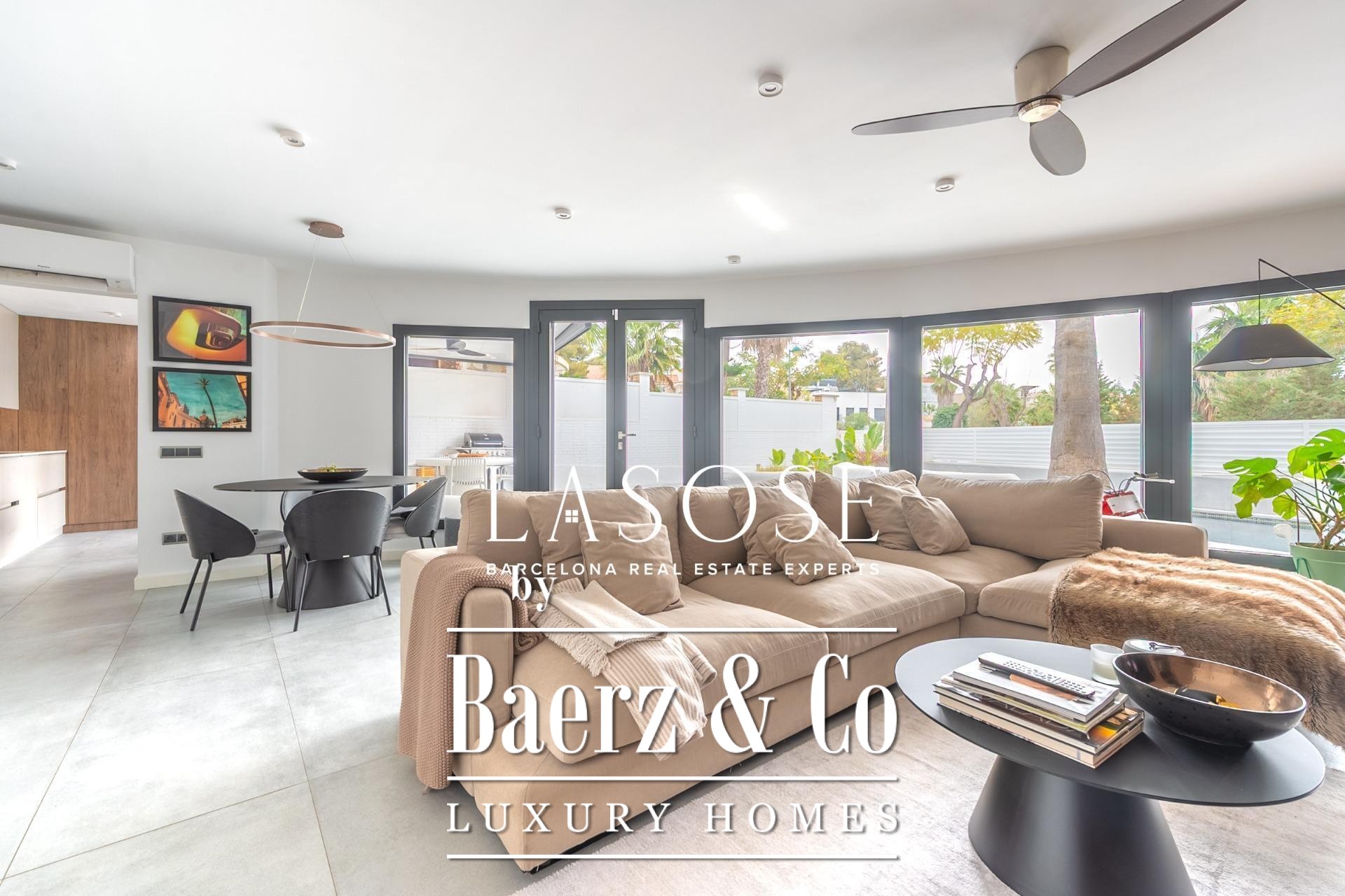 Villa Sitges Vallpineda introduces elevated Mediterranean living in a discreet residential setting. This 100 m² single-storey villa has been fully renovated to precise contemporary standards, offering two bedrooms and two bathrooms that flow seamlessly into generous living spaces. The property stands on a 278 m² plot, framed by stately palm trees and enhanced by open views, where tranquil indoor and outdoor environments merge. Floor-to-ceiling windows illuminate the main living and dining area, integrating naturally with the terrace and private pool—ideal for family gatherings or quiet reflection.