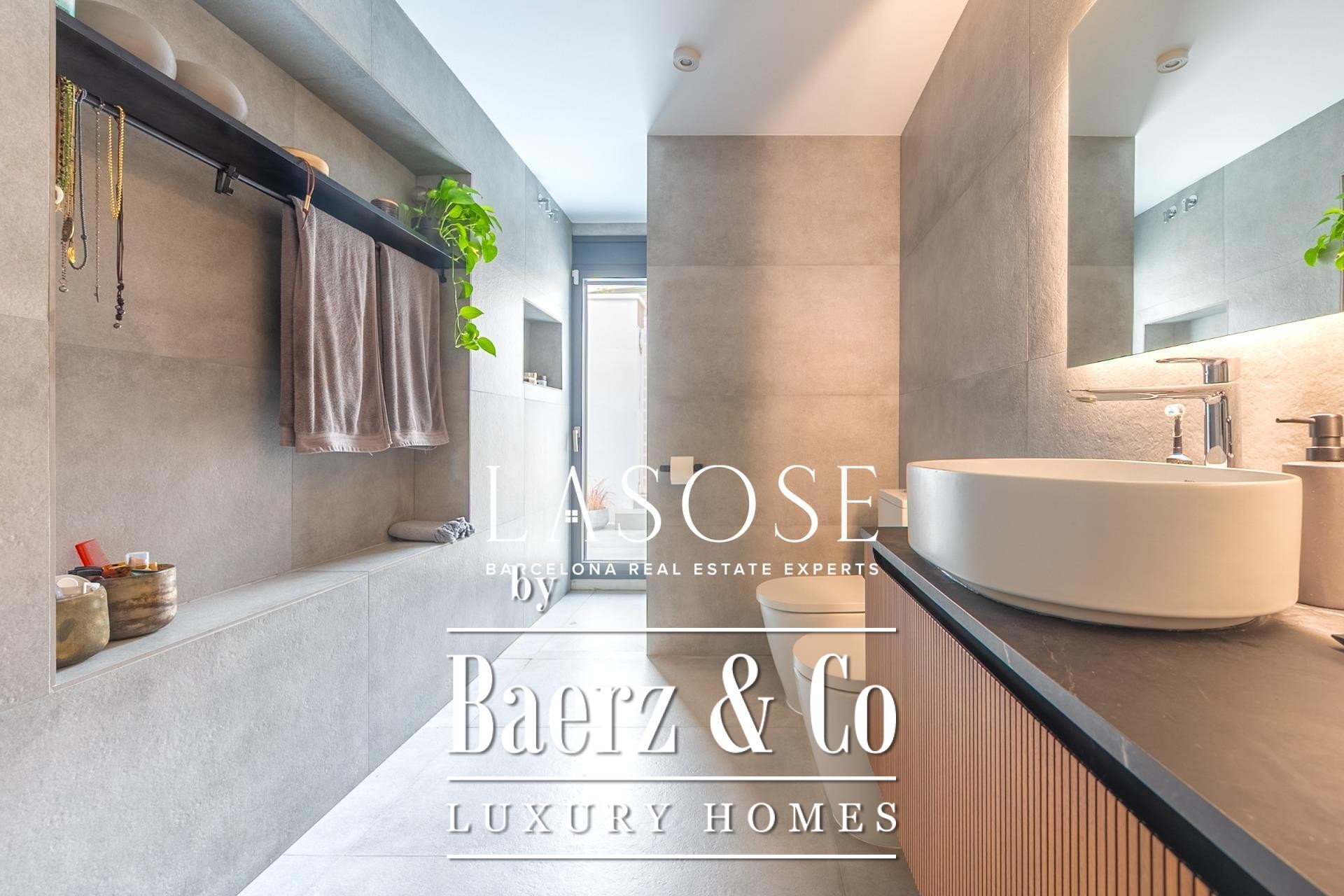 A modern kitchen, finished with premium materials and appliances, connects both to the heart of the home and to an inviting covered dining terrace for effortless alfresco entertaining. The primary suite features a designer bathroom and a spacious dressing area, while the second bedroom offers direct access to a full bath—balancing comfort with elegant privacy. Year-round climate control is ensured by hot and cold air pumps in every room; double-glazed windows and adjustable blinds reinforce thermal and acoustic insulation. Details from lighting to finishes embody timeless restraint.
