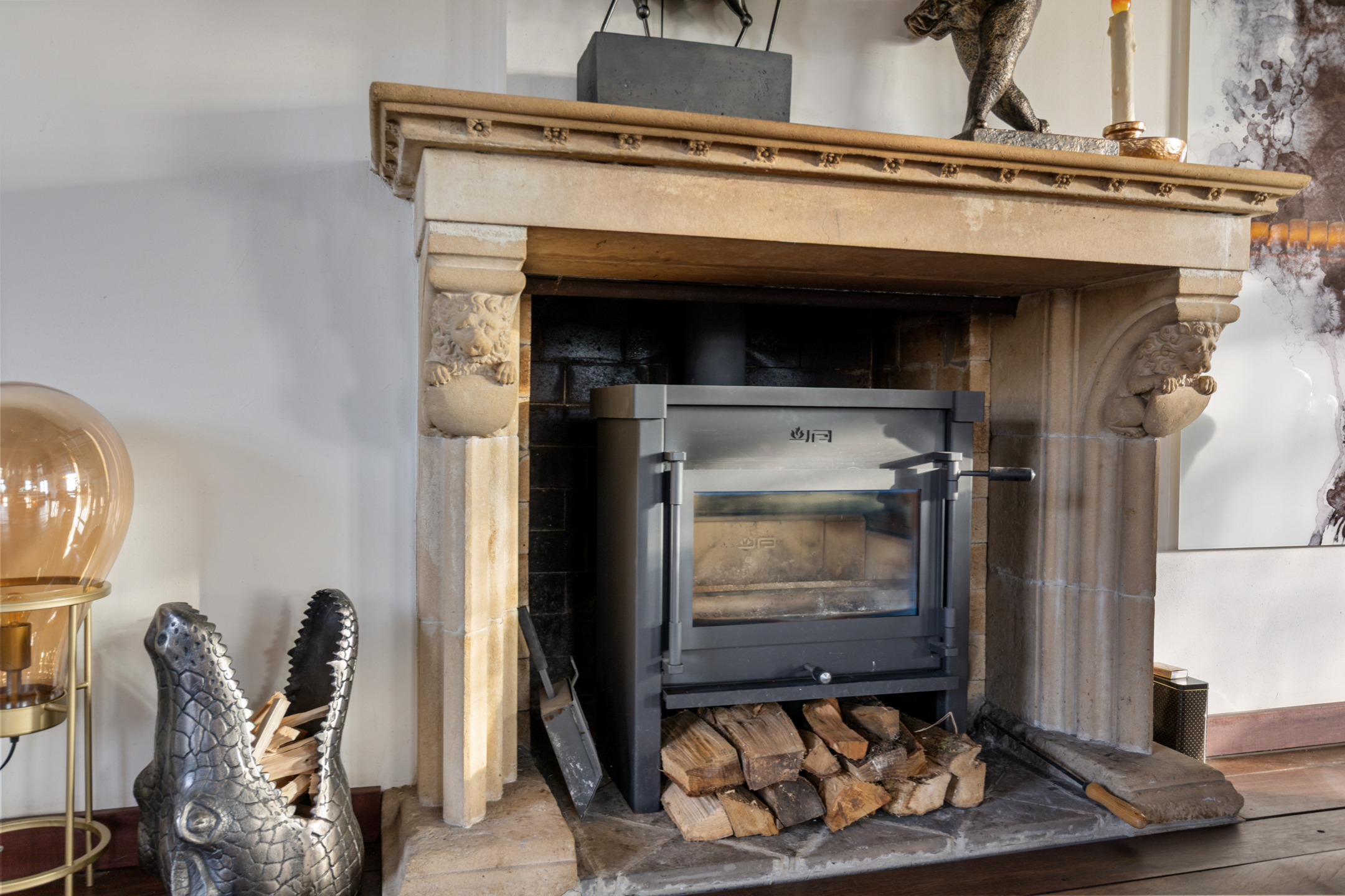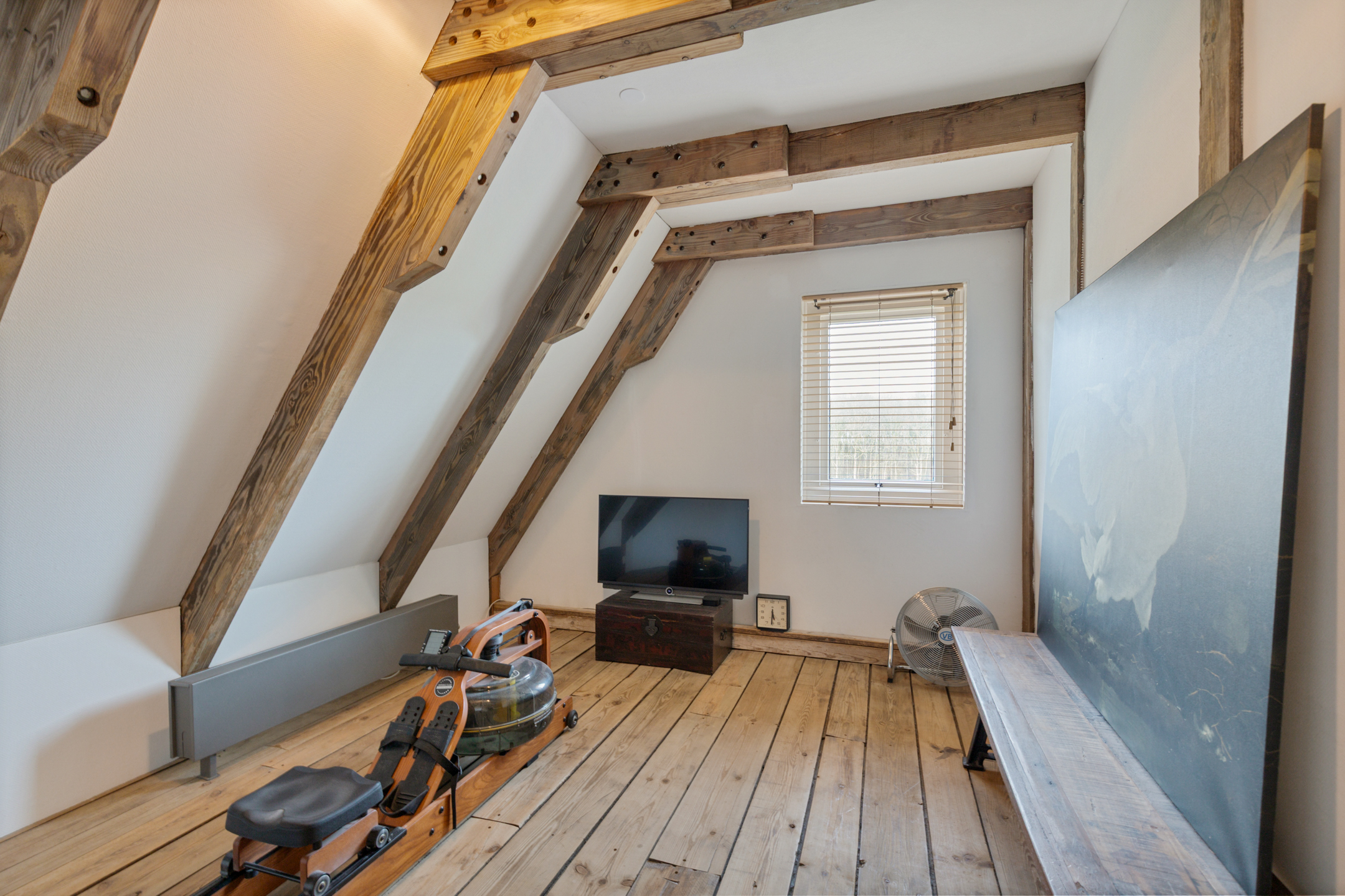 The spacious living room offers beautiful views of the Gaasterland natural landscape from virtually every window. Wherever you sit or stand, the surrounding nature becomes part of the interior experience. The atmosphere is defined by robust exposed beams, hardwood floors, a stylish fireplace with wood-burning stove and an impressive aluminium stair hall.