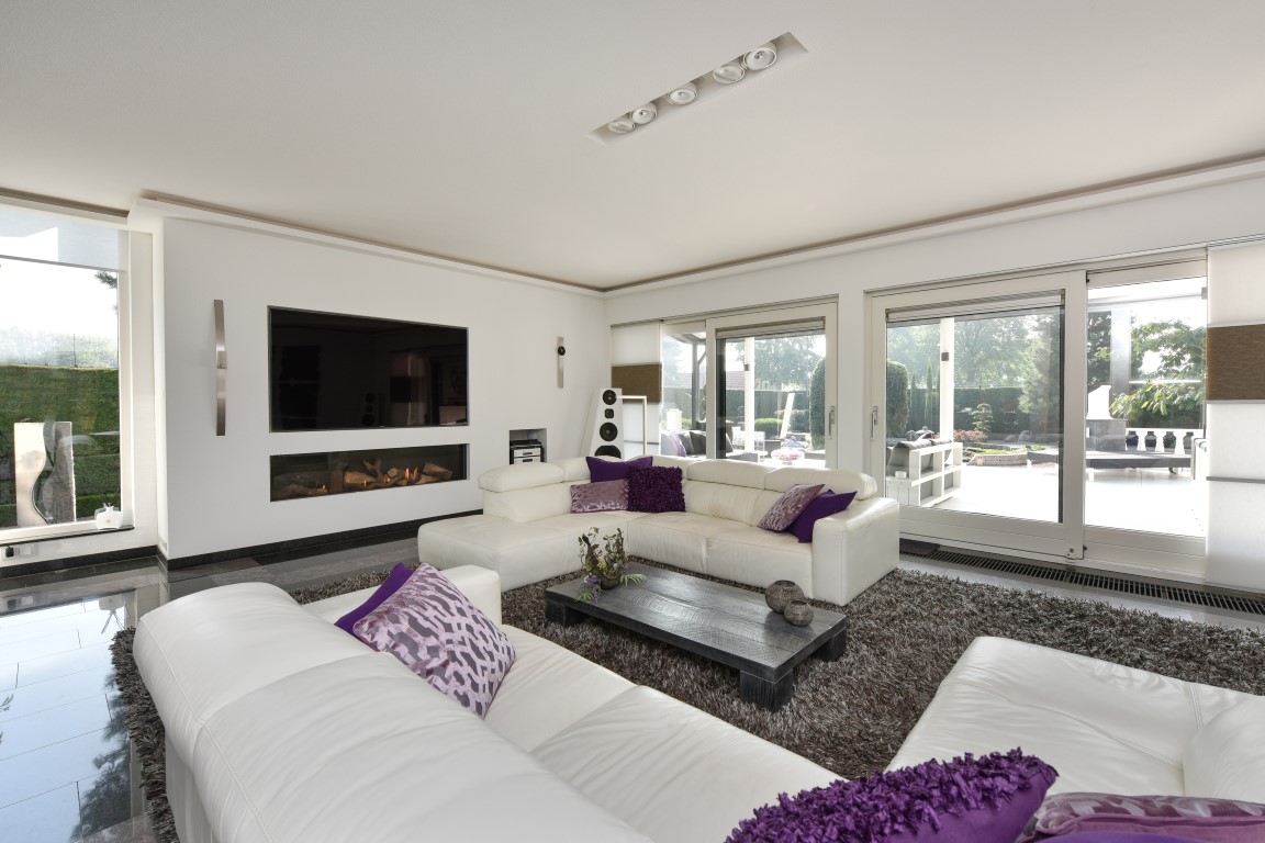 De living is comfortabel ruim en licht van opzet, beschikt over een Cinewall en een 3-tal schuifpuien richting de tuin rondom. Vanuit de eethoek loopt de sfeer vloeiend over richting de open woonkeuken met alle luxe van dien. Denk aan een royaal granieten werkblad, hoogwaardige inbouwapparatuur, granieten vloeren, inbouwverlichting en bovenal een zeer neutrale kleurstelling.