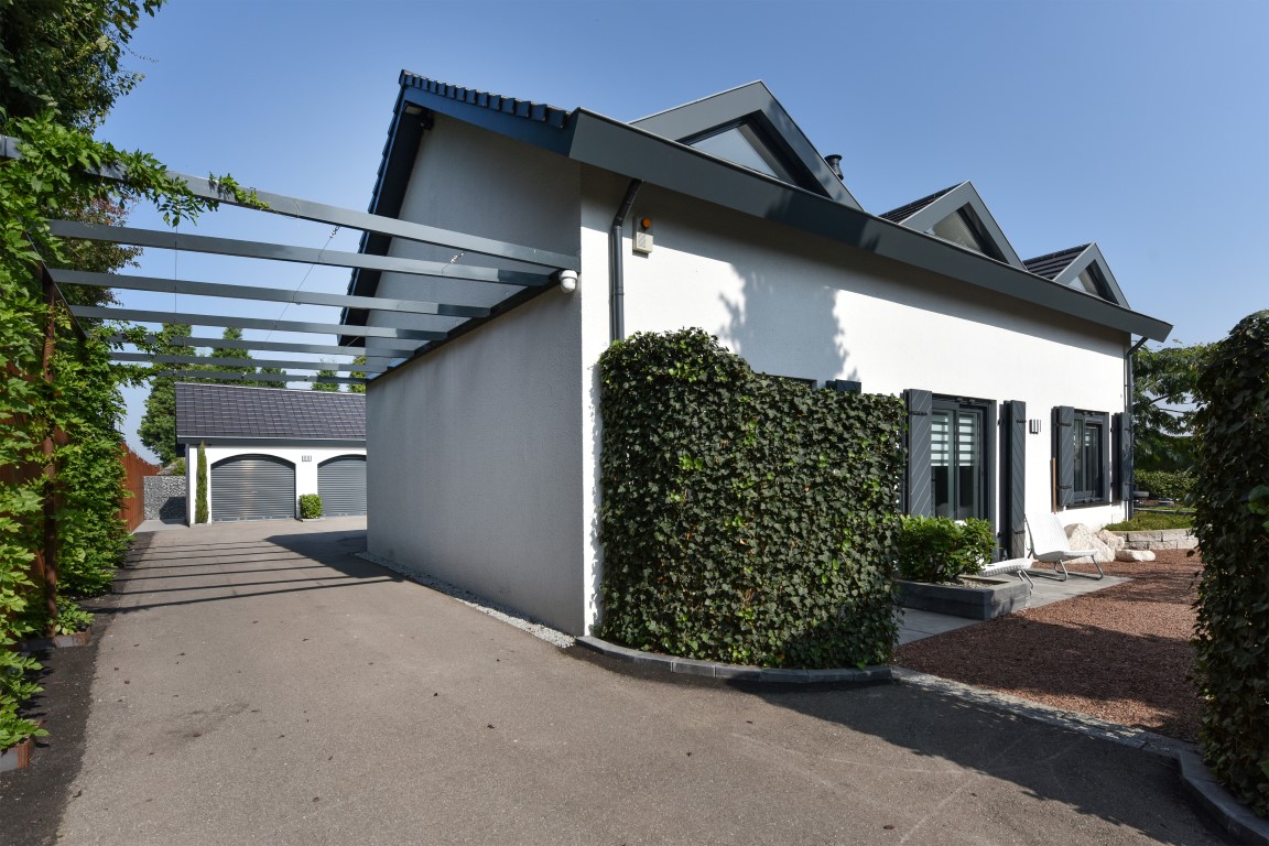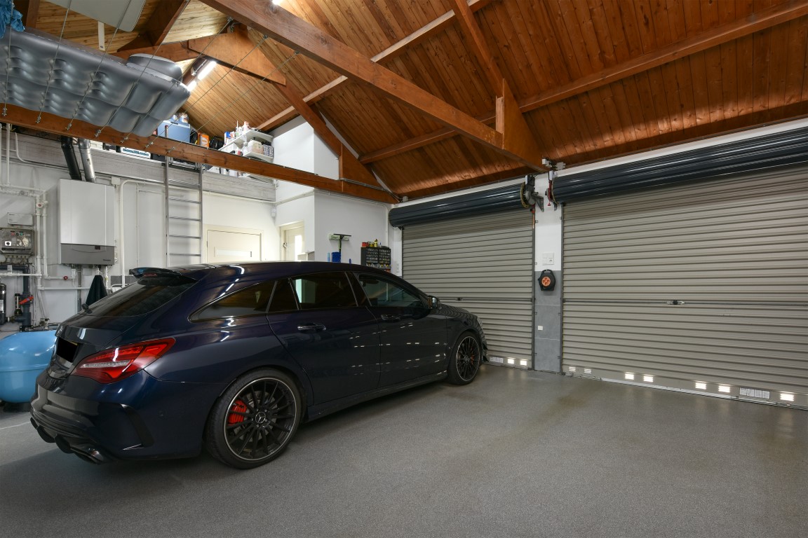 De stijl van de keuken is volledig doorgetrokken richting de bijkeuken alwaar zich o.a. de wasmachine-/drogeraansluiting bevindt, een extra toegang tot de tuin als ook een inpandige toegang tot de dubbel uitgevoerde garage met strakke coatingvloer en de gelegenheid voor het stallen van een 2-tal voertuigen.