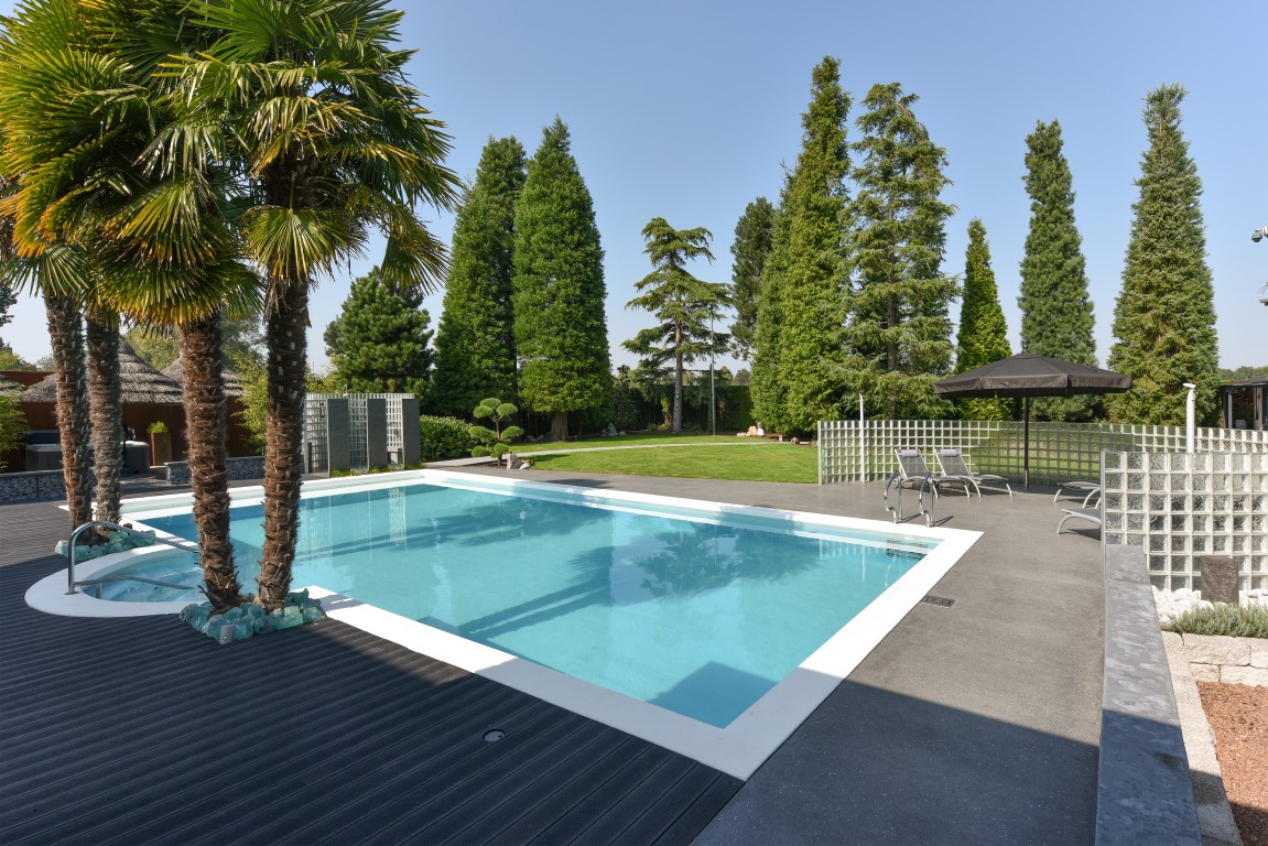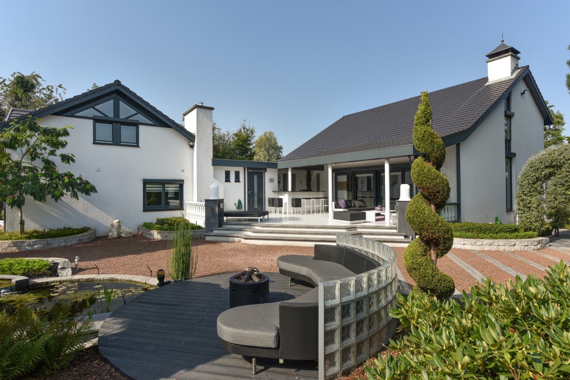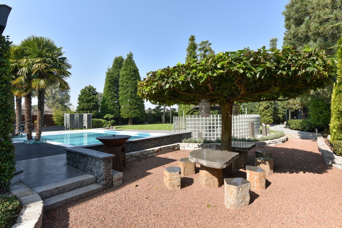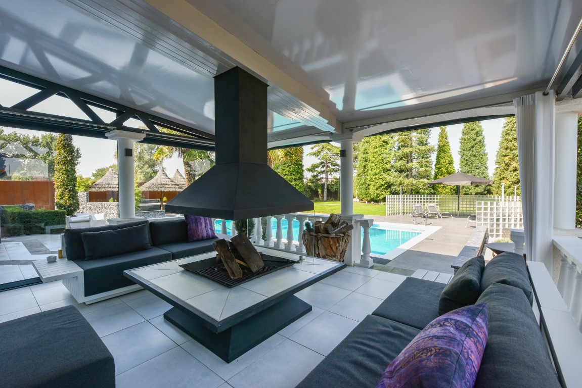Ook buitenshuis is aan werkelijk ieder detail aandacht besteed en zijn vele luxes aanwezig. Denk hierbij aan het verwarmd zwembad, een jacuzzihoek met buitendouche en buitenhaard, de sfeervolle veranda aan de achterzijde met gastafelhaard, een 2e veranda aan de zonzijde met buitenkeuken, hoogwaardig groen rondom, grondpomp met beregeningsinstallatie (roestvrij water), keramisch straatwerk, een hout gestookte sauna, smaakvolle tuinverlichting, etc.