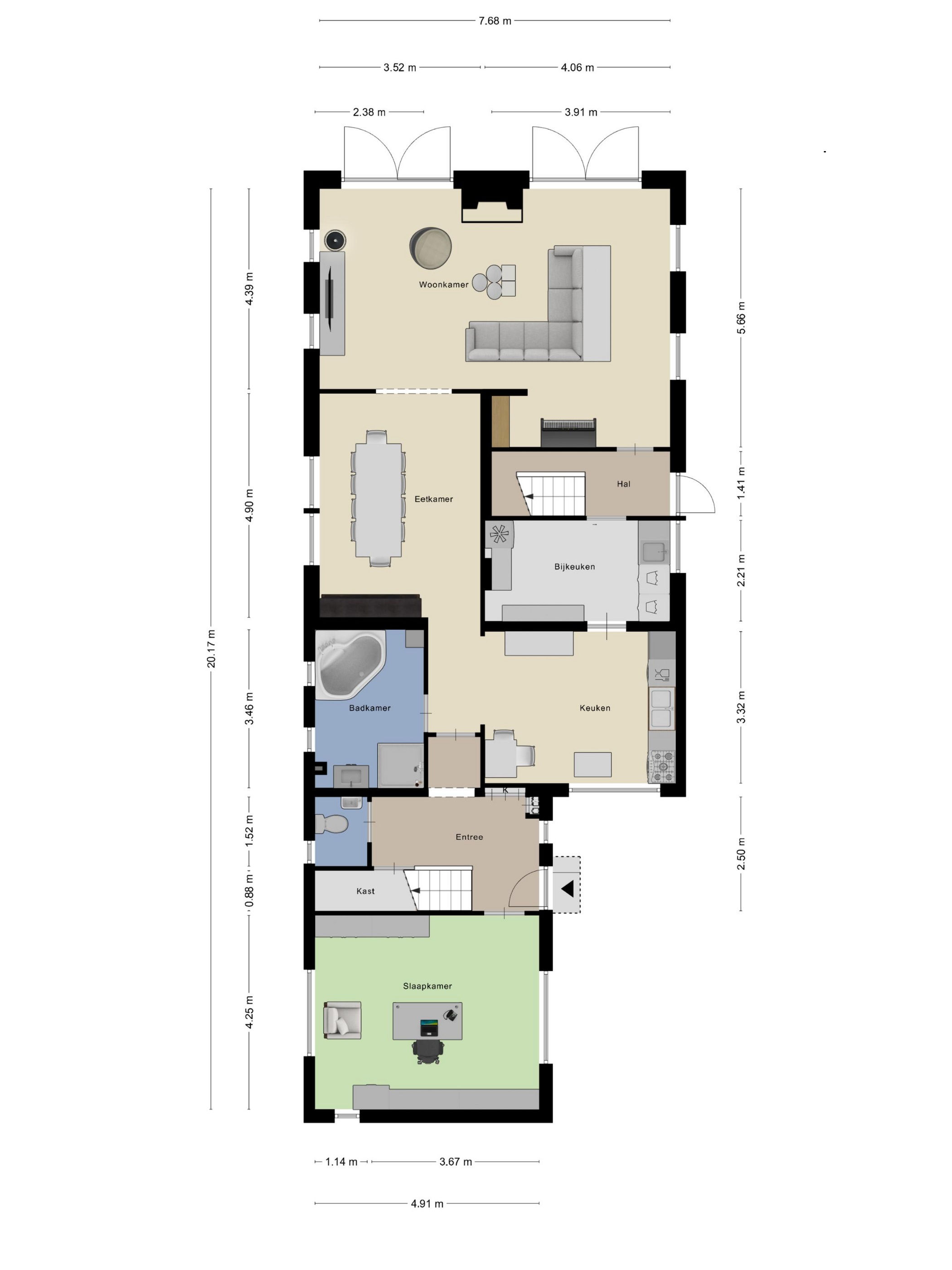 In het originele woonhuis bevindt zich in voormalige woonkamer momenteel een hobby-/werk-/slaapkamer. Tevens is er een badkamer aanwezig op de begane grond, hierdoor is levensloopbestendig wonen mogelijk. Op de verdieping bevindt zich een open ruimte, welke momenteel als slaapkamer wordt gebruikt.