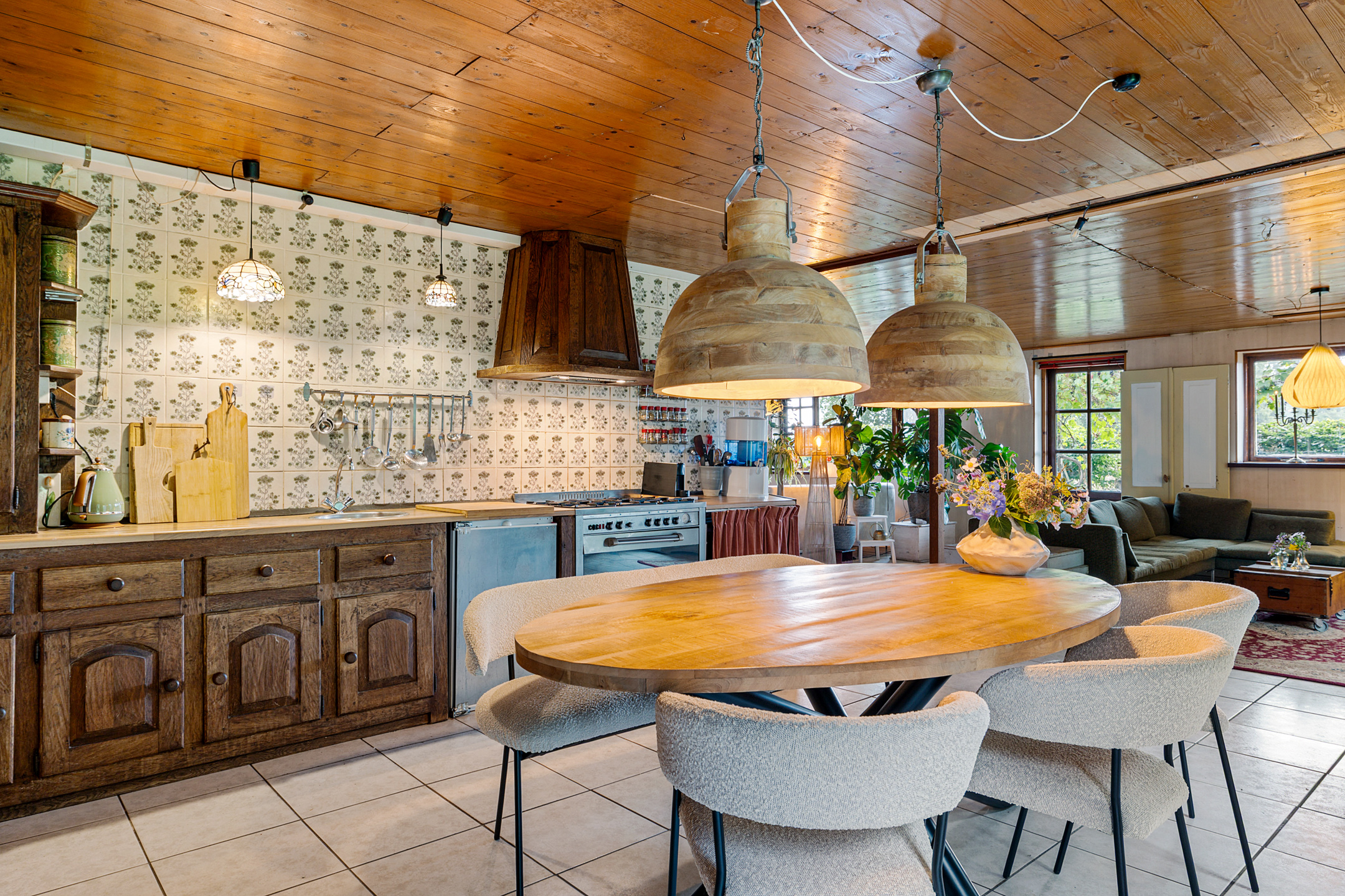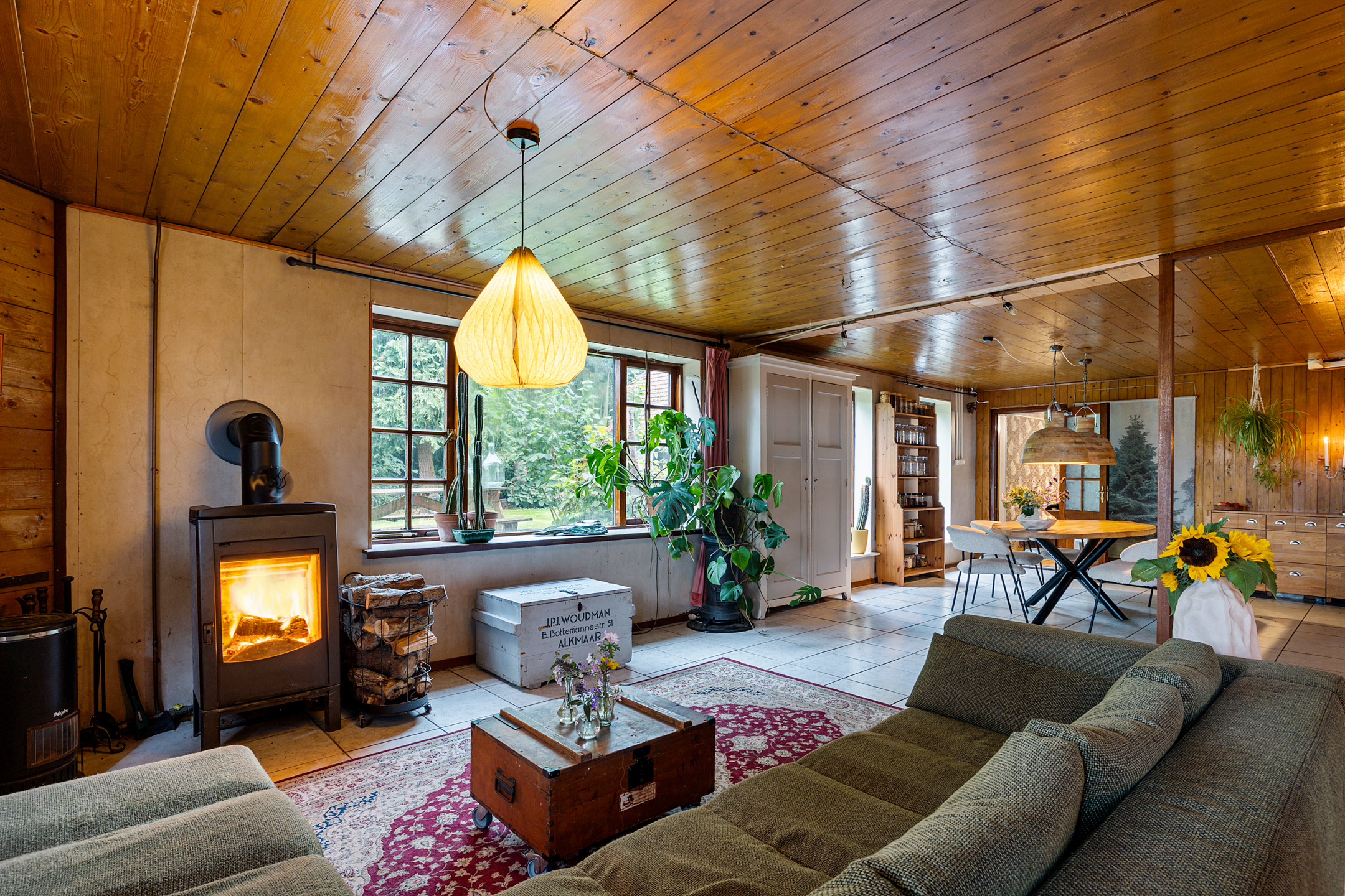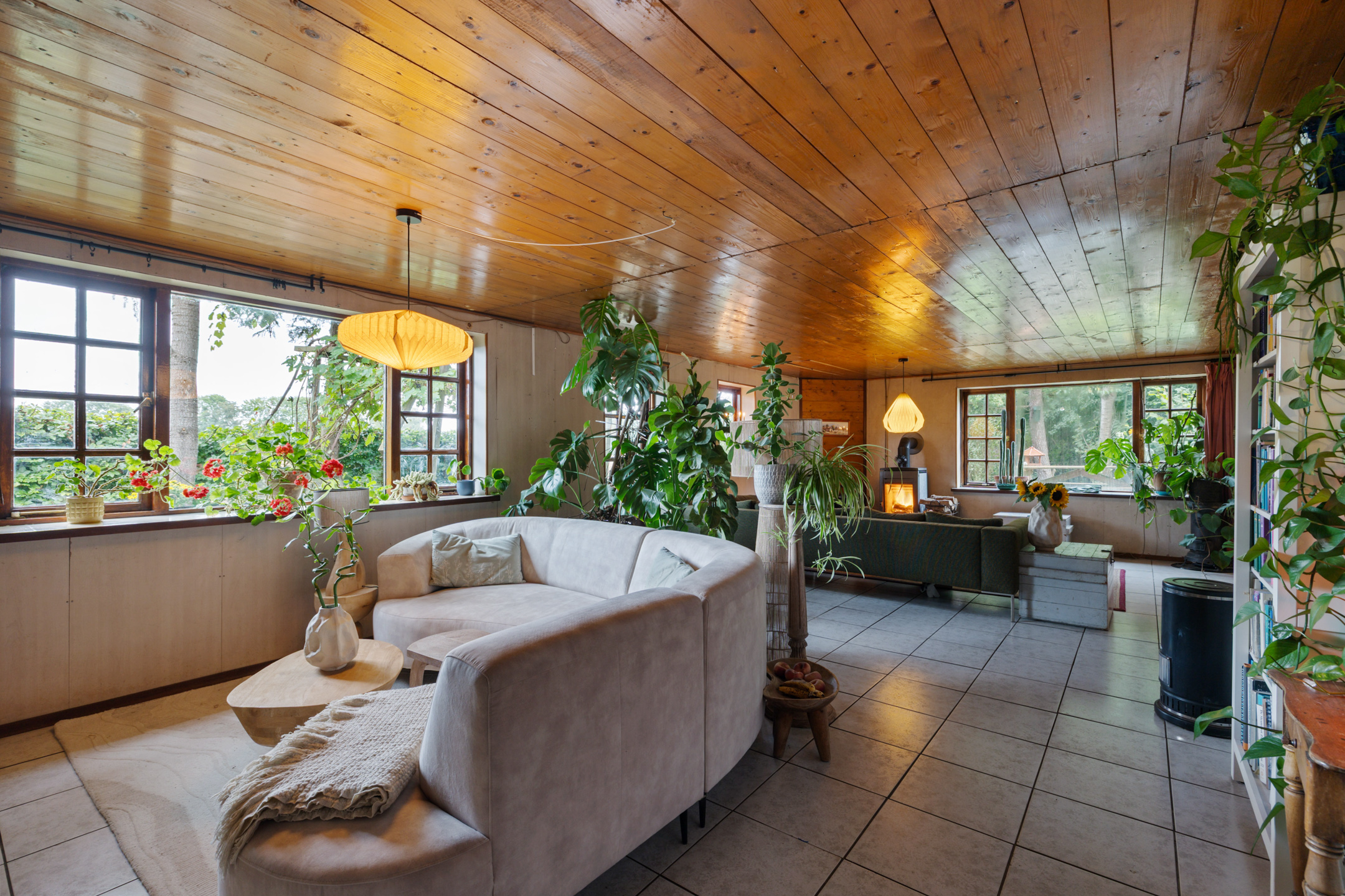 The atmospheric L-shaped living room features a wood-burning stove and, thanks to its many windows, offers beautiful views over the garden, terraces, fields and woodland. Here, indoor and outdoor living blend seamlessly.