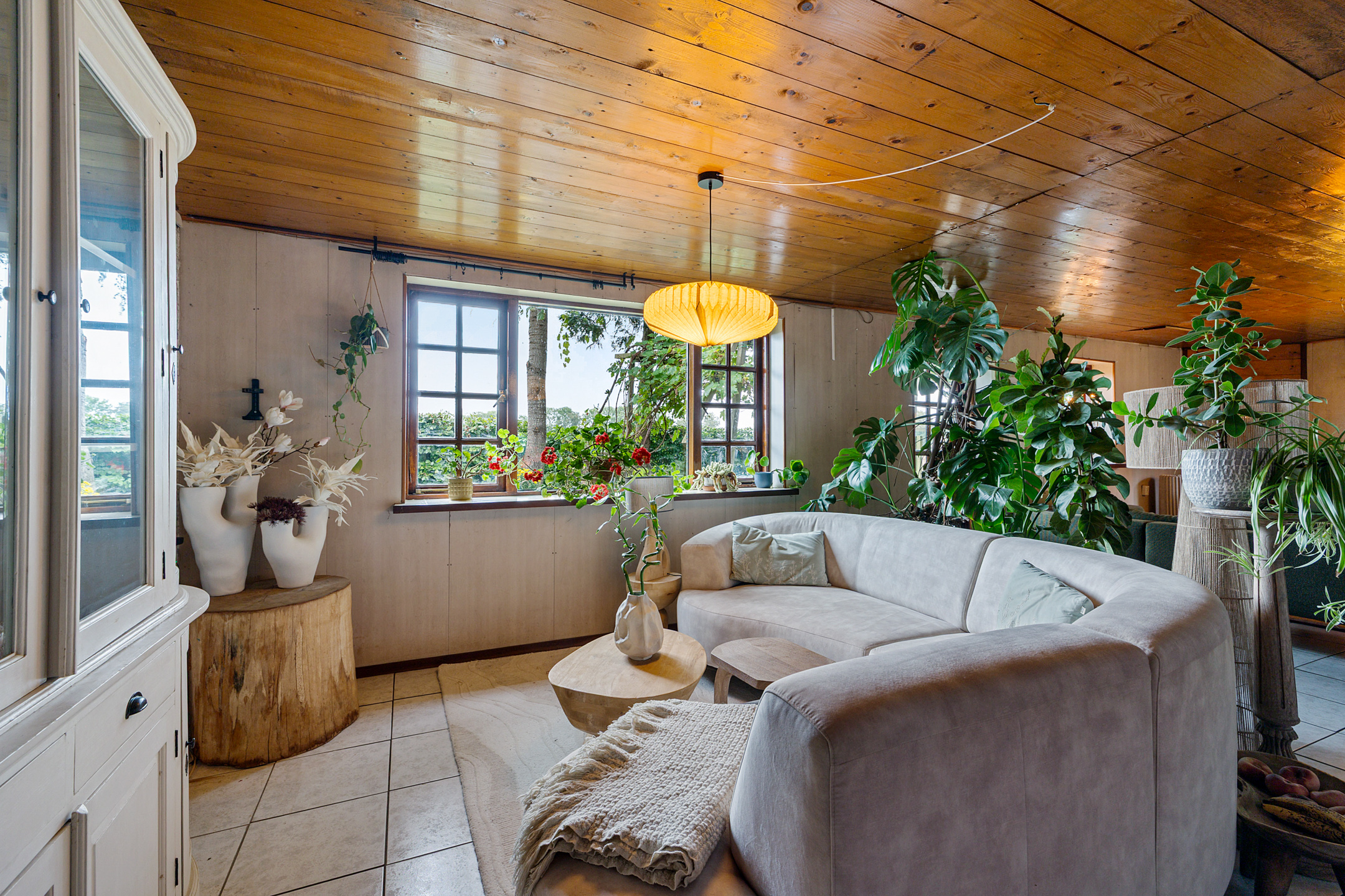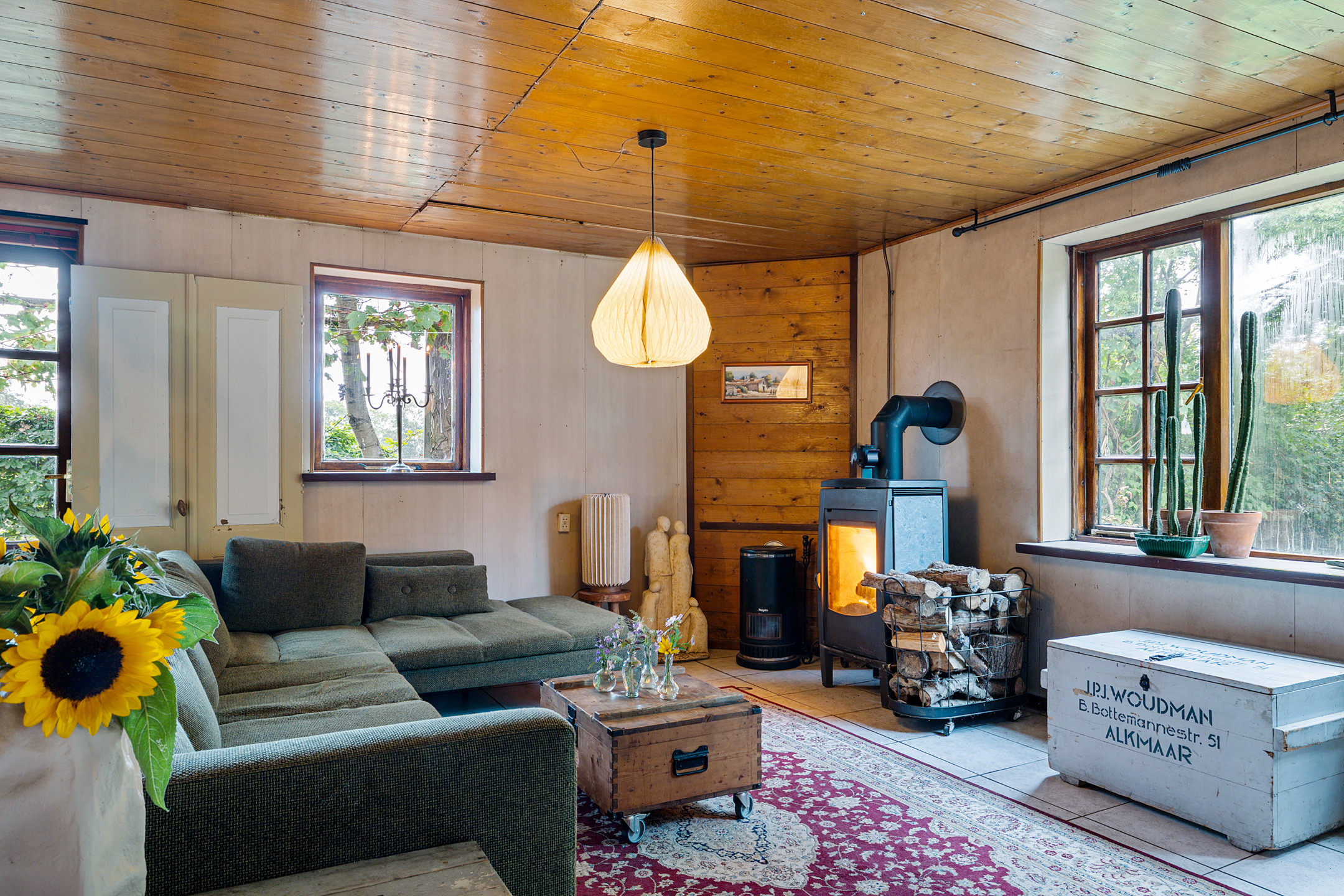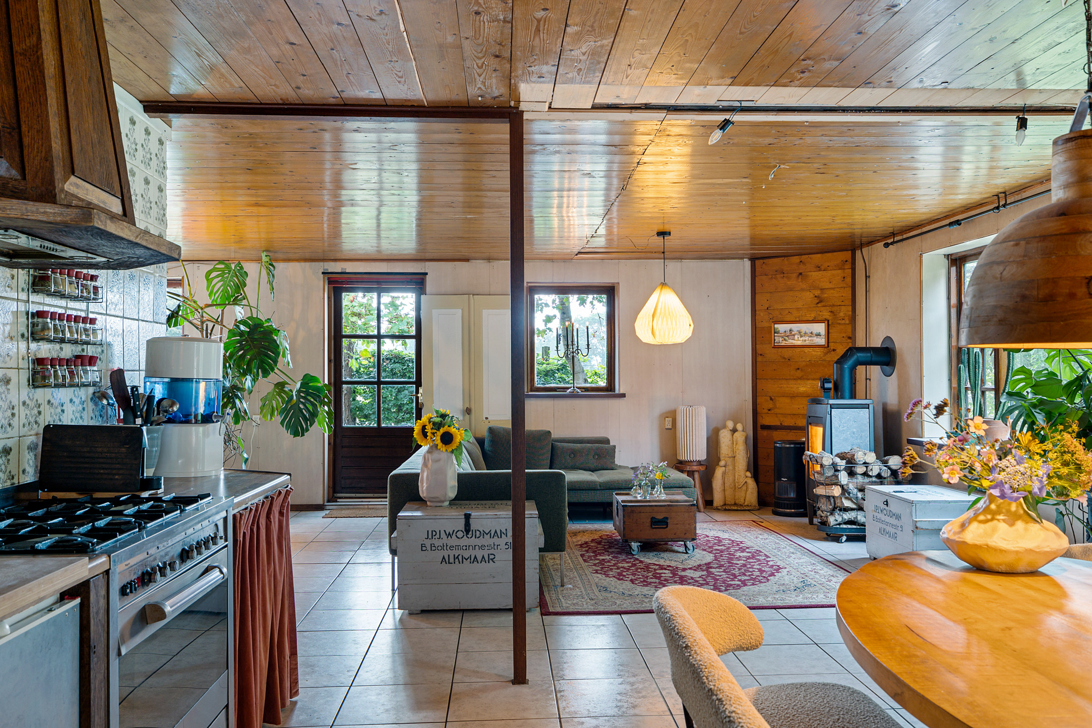 The atmospheric L-shaped living room features a wood-burning stove and, thanks to its many windows, offers beautiful views over the garden, terraces, fields and woodland. Here, indoor and outdoor living blend seamlessly.