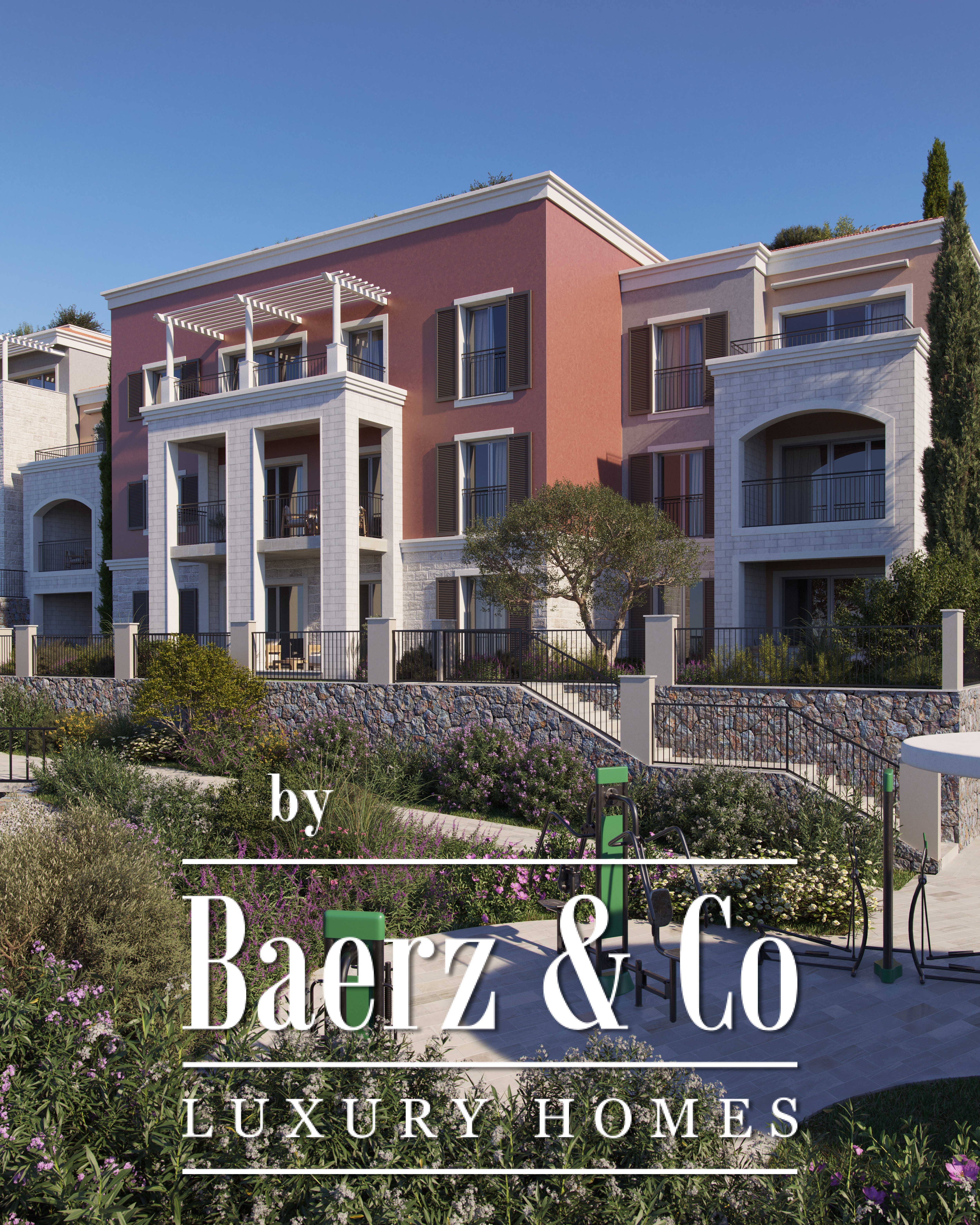 Each home offers bright, airy living spaces that extend onto generous balconies, while select residences enjoy views across Trašte Bay, Boka Bay, and beyond. Residents also benefit from a curated selection of community amenities, including a large private pool, a separate children’s pool, a water feature beside the guvno, and a dedicated fitness area complemented by a peaceful yoga zone.