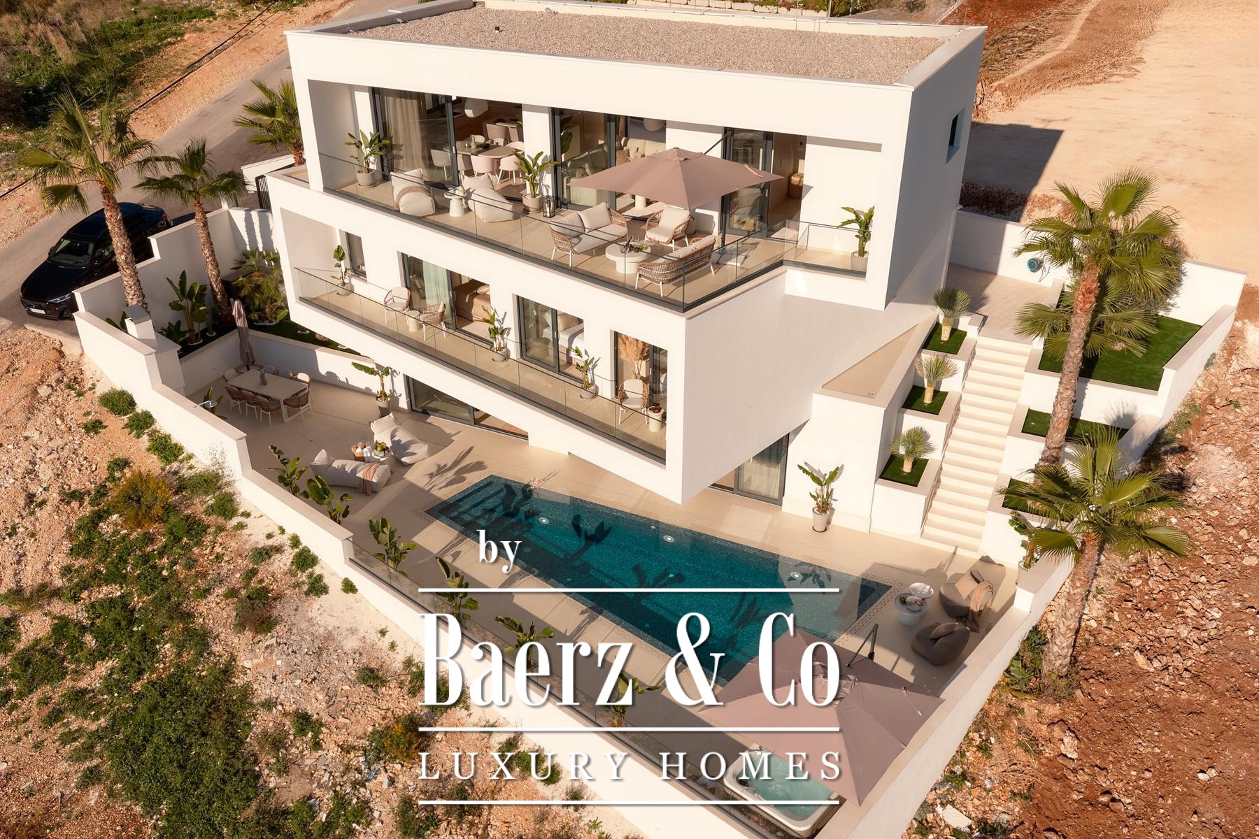 Construction standards are uncompromising, with ceiling air conditioning, underfloor heating powered by heat pumps, air recovery, thermal insulation, aluminum joinery, glass terrace railings, solar panel installations, automatic garden irrigation, and video surveillance providing technical excellence. Two uncovered parking spaces and Mediterranean-inspired landscaping further enhance the setting.
