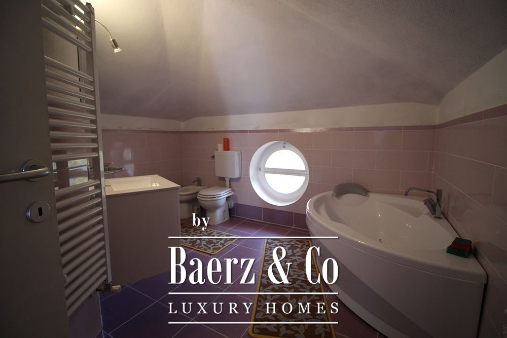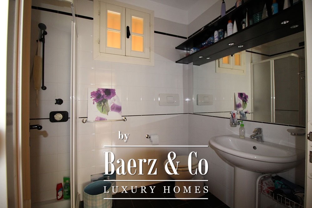 The first floor presents a spacious apartment with two bedrooms, two bathrooms, a well-lit living room and a large covered balcony where sweeping views capture the Mediterranean, the valley, and the Ligurian mountains. Ascend again and you encounter the third residence, complete with a large living room, kitchen, bedroom and bathroom, offering direct access to a substantial roof terrace—an ideal vantage for tranquil sunsets and uninterrupted panoramas.
