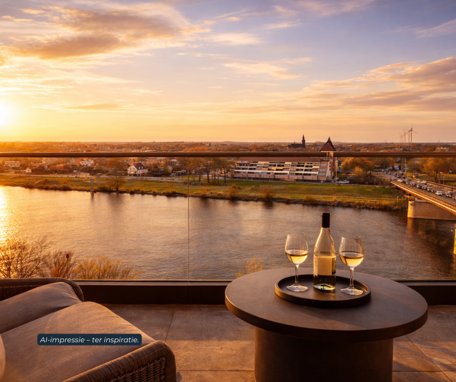 The expansive terrace of approximately 39 m² acts as a natural extension of the living space and offers an uninterrupted panoramic view over the Maas — a view that offers a new experience in every season.