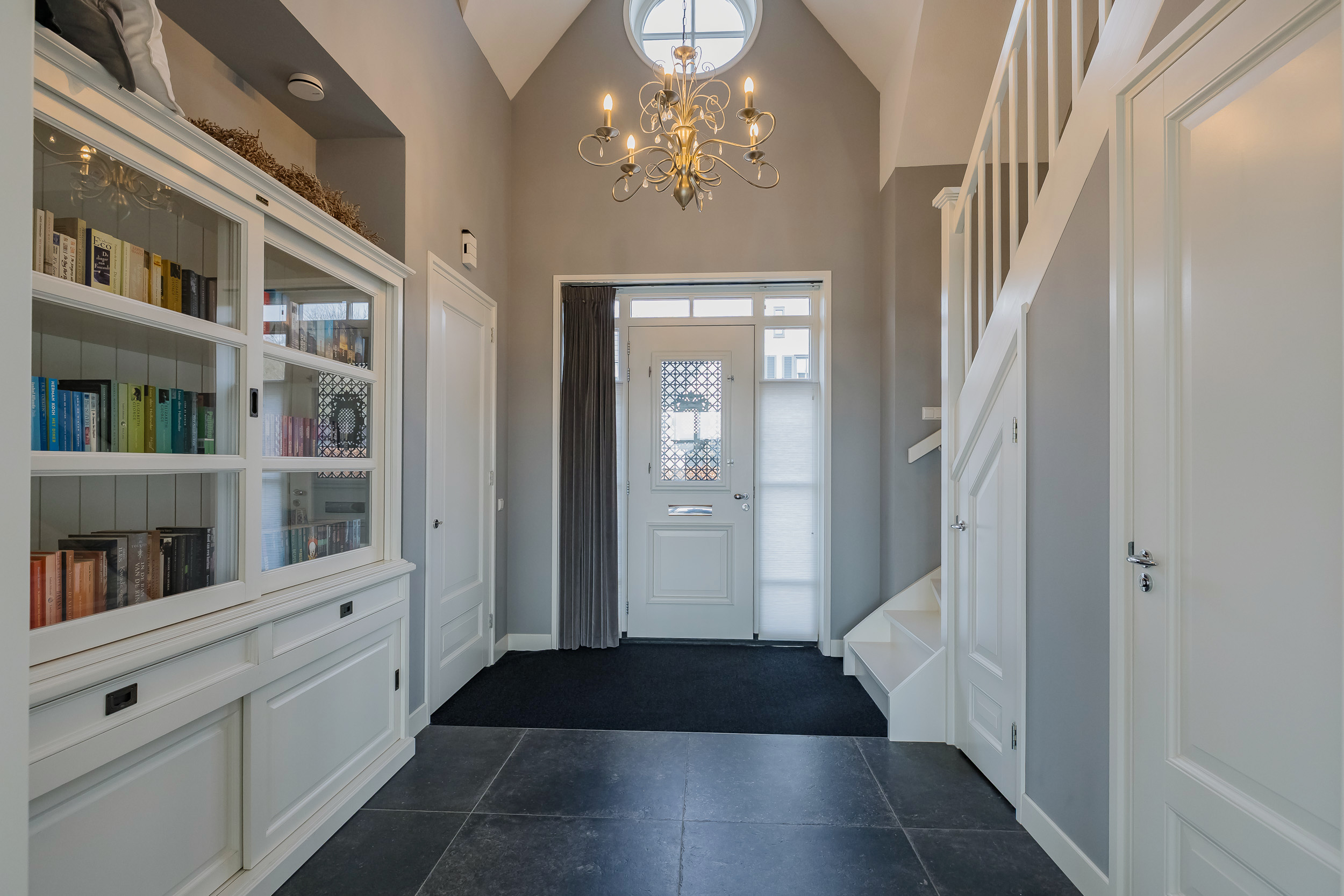 As soon as you step inside, you’ll experience the tranquility and high-quality finishes. The impressive entryway with a loft opens onto the spacious living room. Everywhere you look, you’ll see sleek, tone-on-tone finishes in shades of gray combined with plenty of white, creating a bright and modern atmosphere.