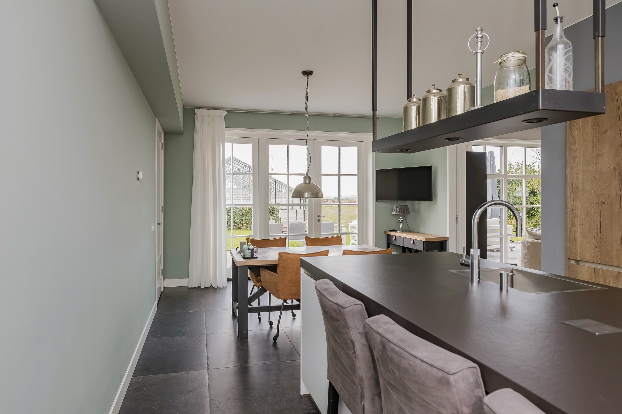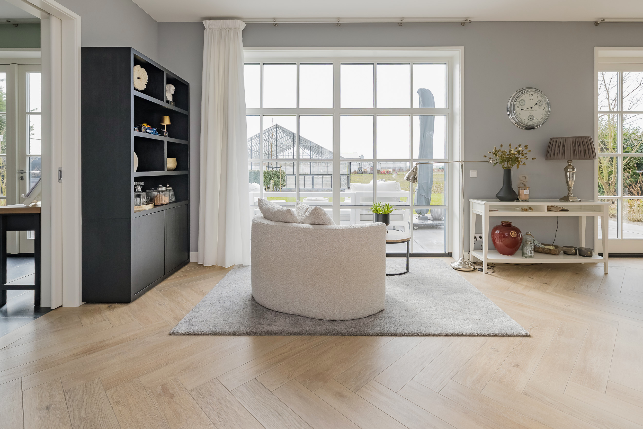 The living room is spacious and bright thanks to the large windows with white muntin bars and French doors leading to the terrace and the surrounding garden. The floor features stylish light wood flooring. At the rear, you can enjoy a fantastic unobstructed view of the bulb fields.