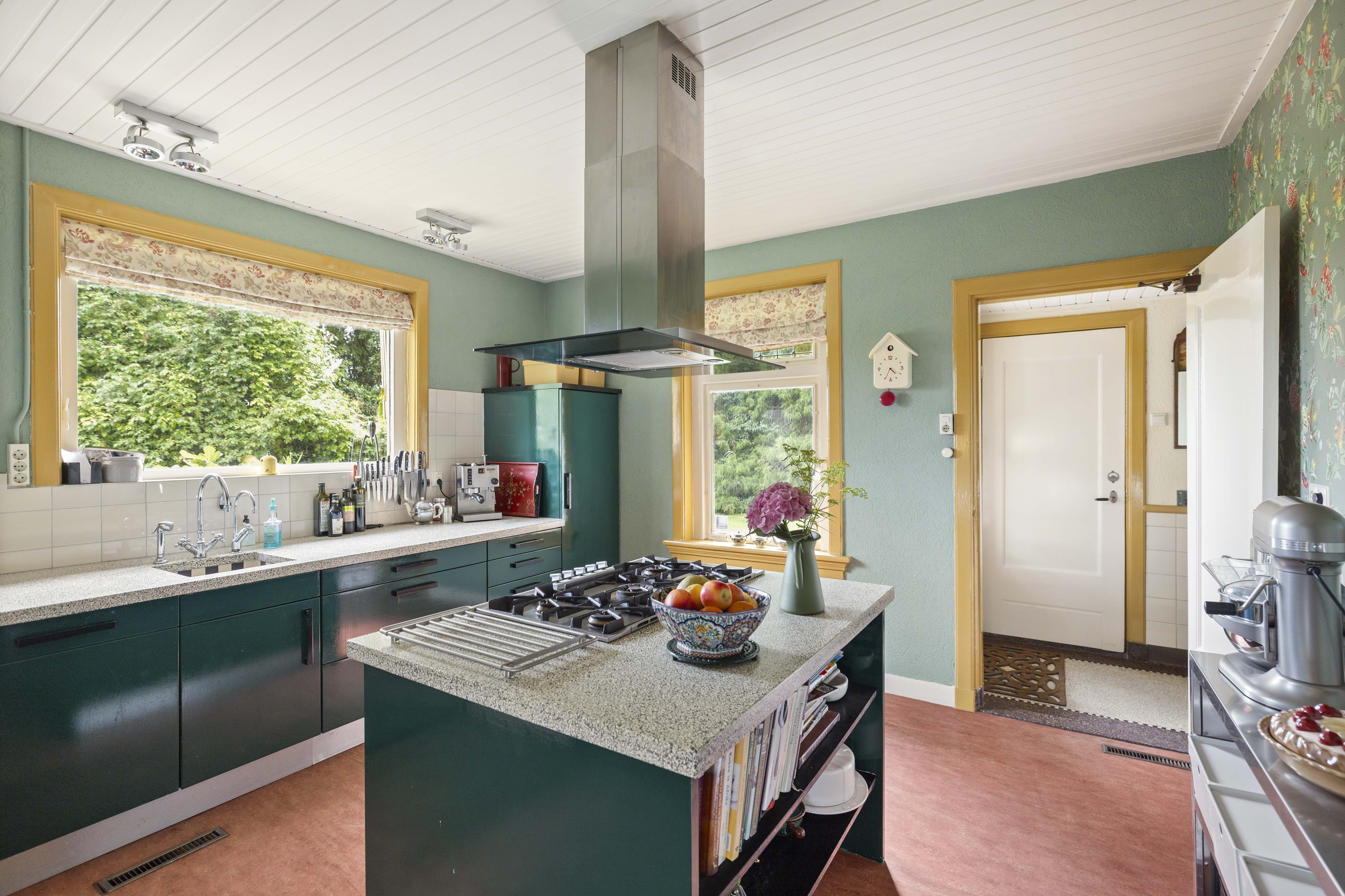 The tastefully decorated kitchen is modern-classic in nature, with dark green fronts, plenty of workspace on the terrazzo worktops, a rustic, chequered sink with tap and separate boiling water tap (Quooker), built-in appliances such as a dishwasher and space for a freestanding fridge-freezer. In addition, there is plenty of storage space in the many kitchen cupboards and drawers.
