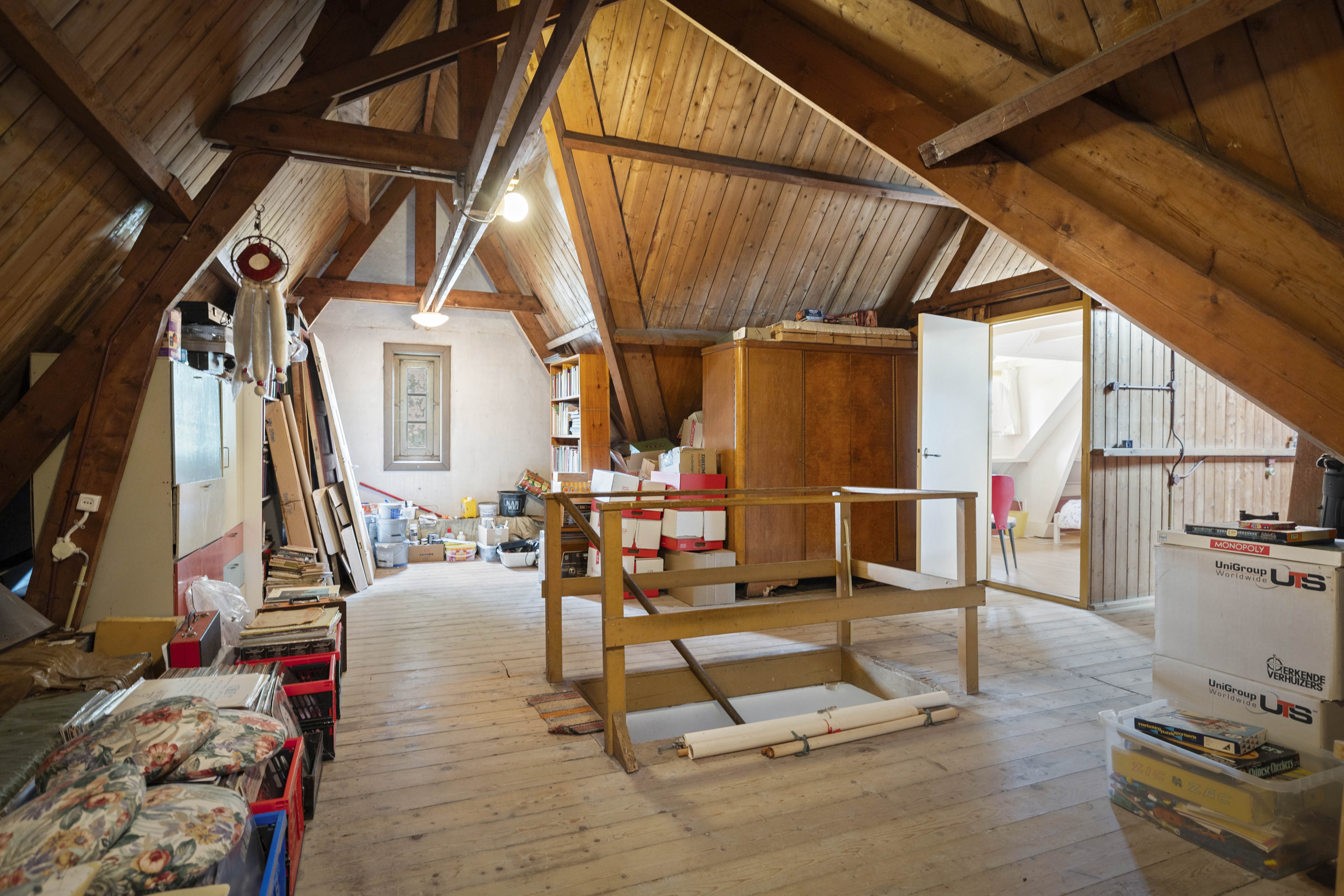 The attic is accessible by a fixed staircase and houses the fourth bedroom. The storage attic is beautiful and spacious and offers all kinds of possibilities, from an extra bathroom and bedroom to creating a yoga studio or space for a fanatical table tennis competition for the whole family.